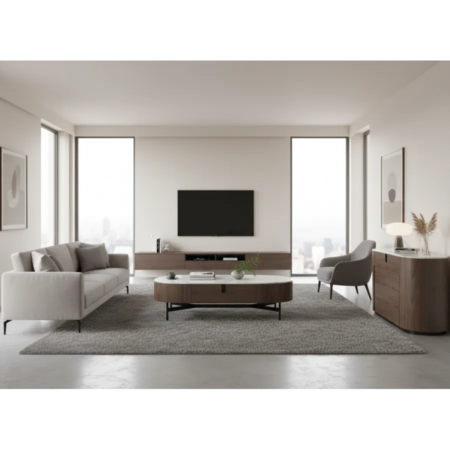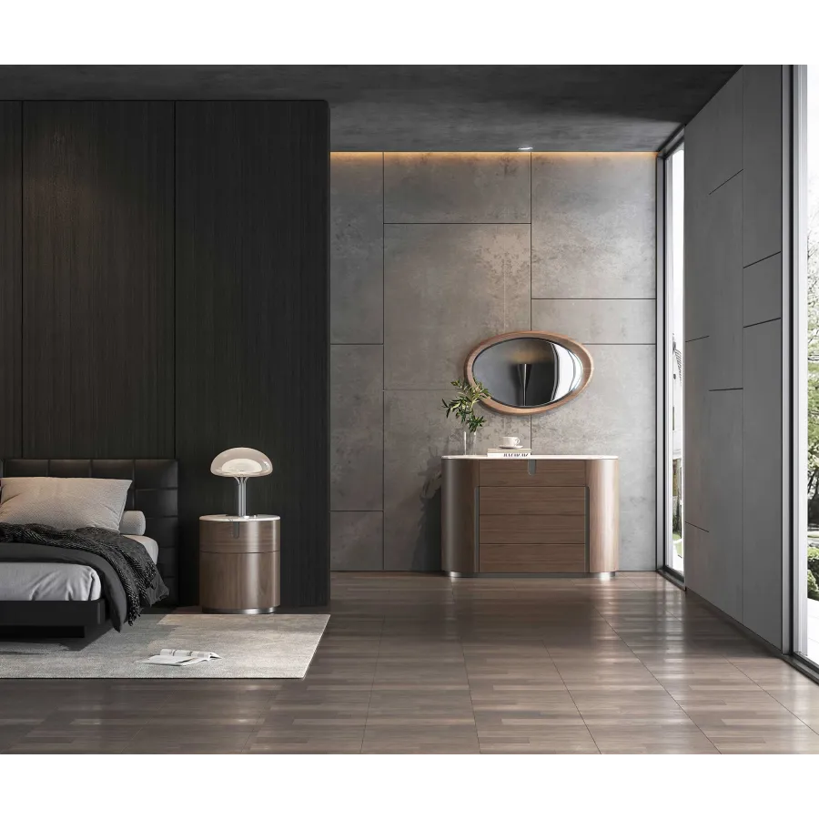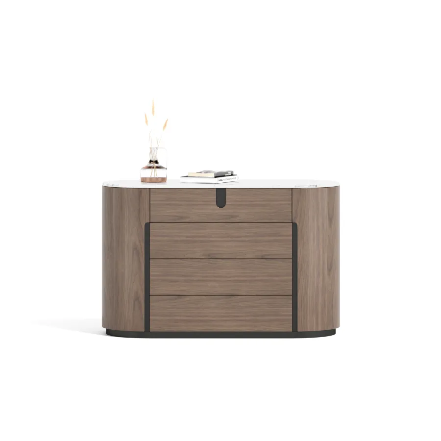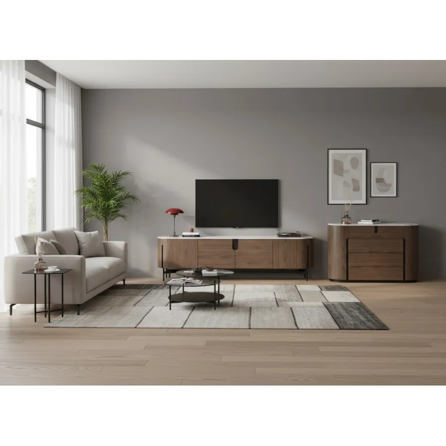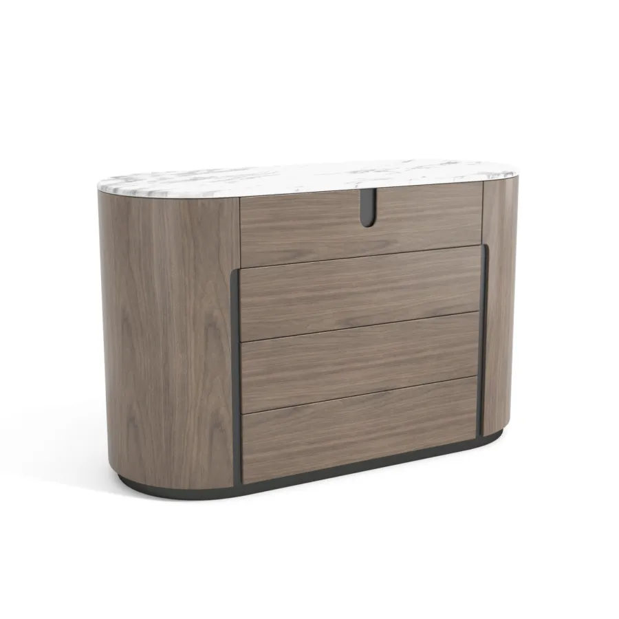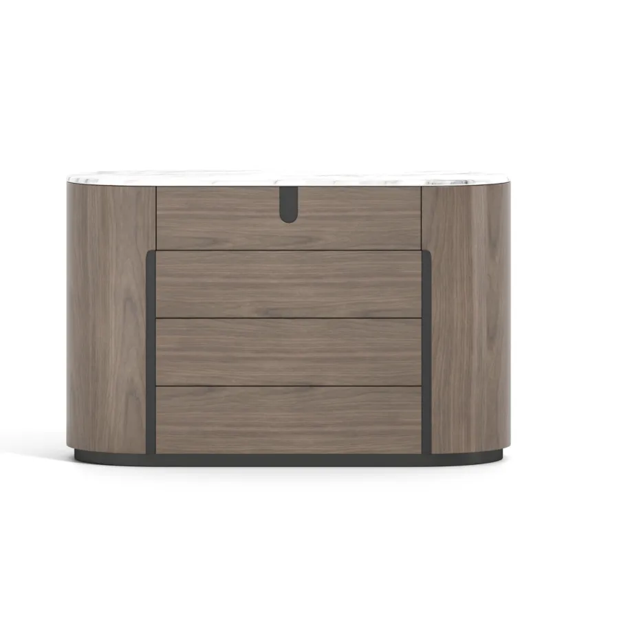 Nowoczesna komoda w kolorze orzecha włoskiego z widocznymi słojami drewna. Metalowa podstawa i akcenty są w kolorze czarnym. Opływowa linia bryły została podkreślona detalami w postaci elementów w kształcie łuków.