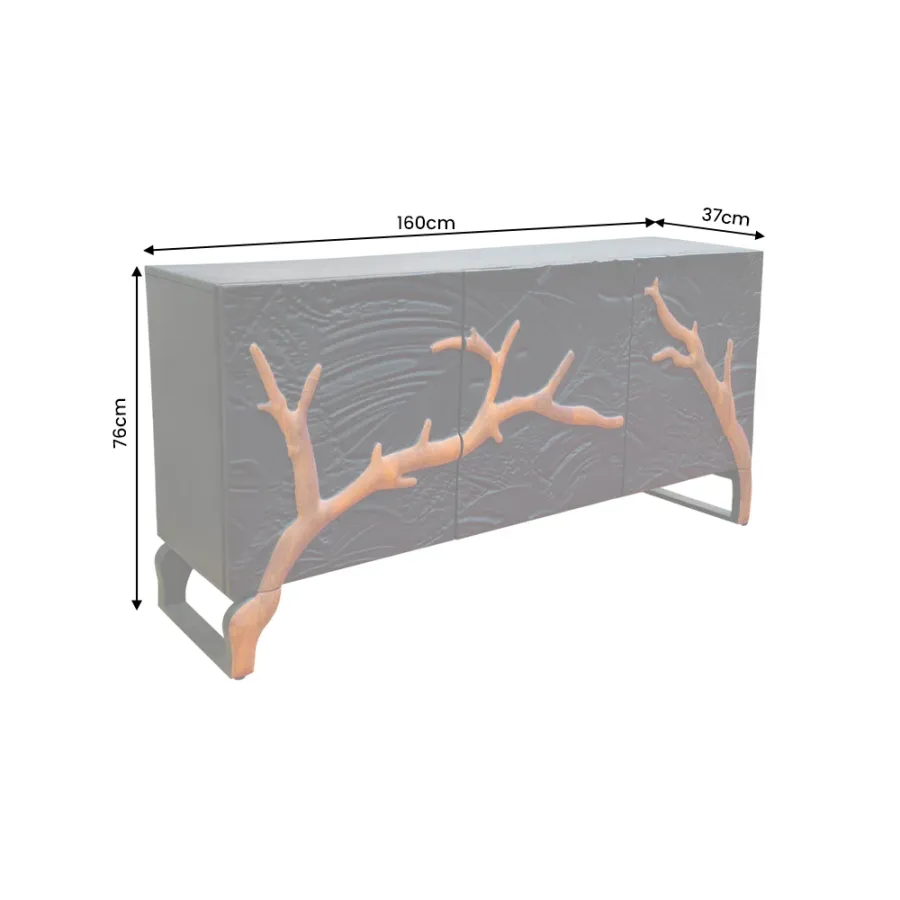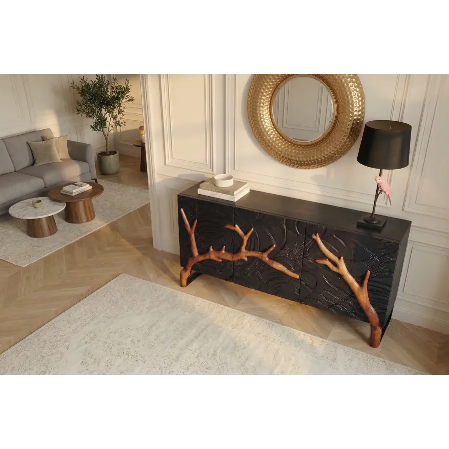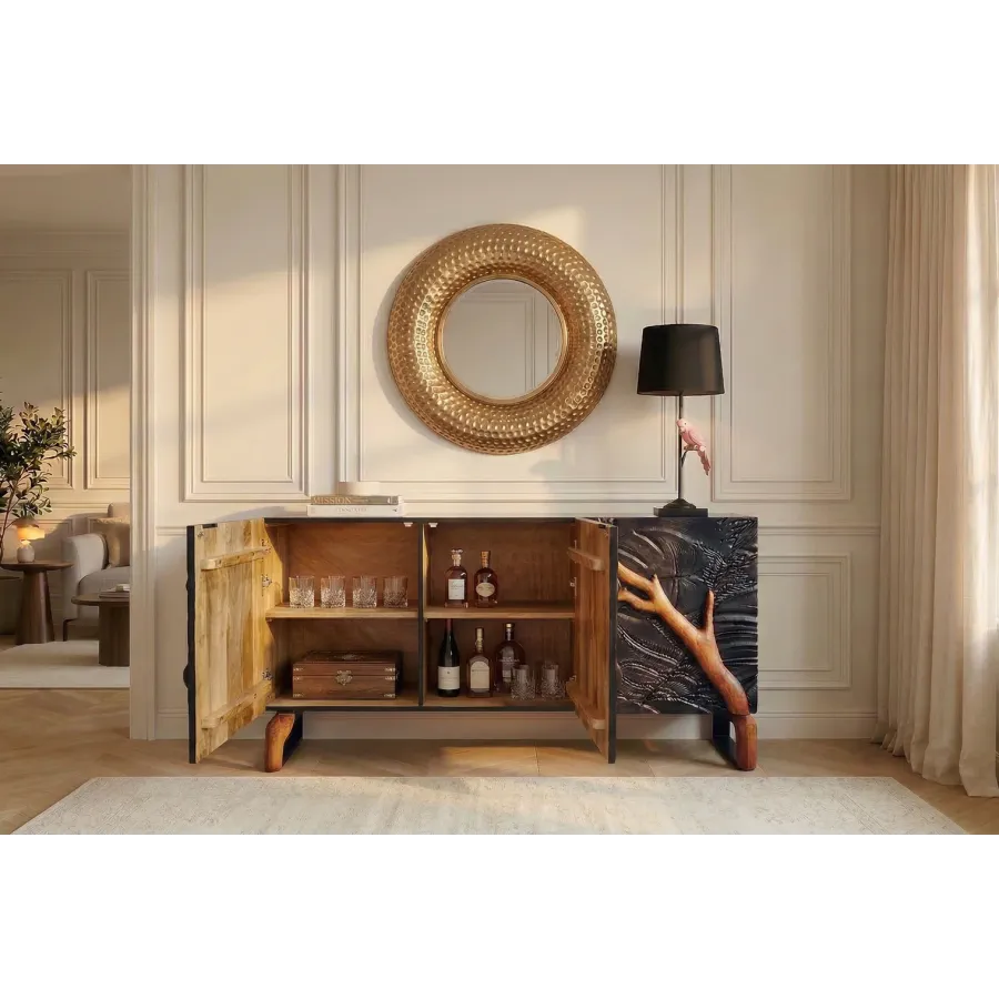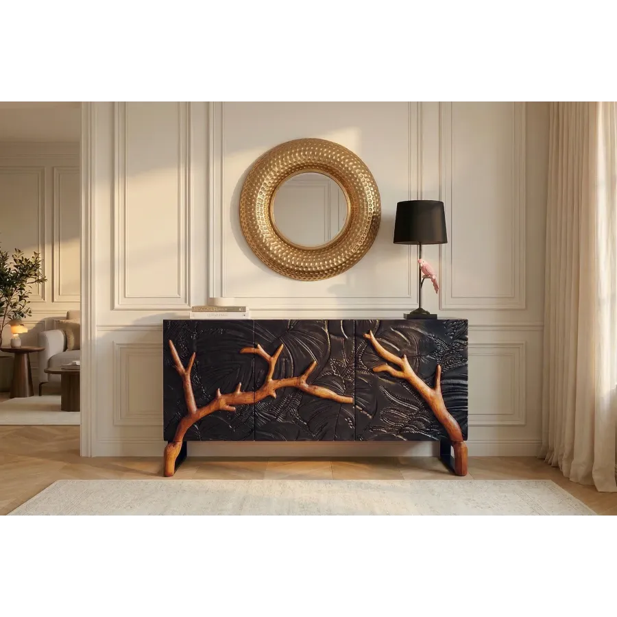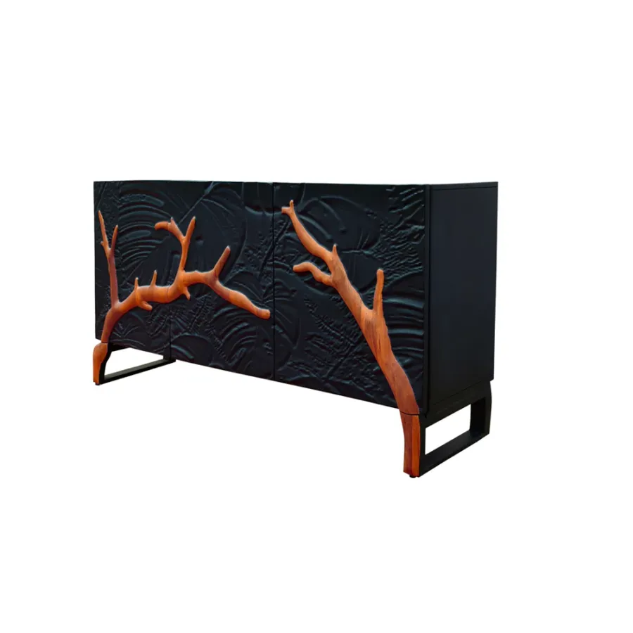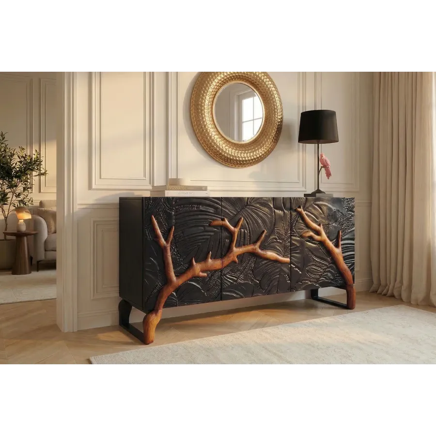 Komoda FOREST to wyjątkowy element wyposażenia wnętrza, który stanowi mocny akcent dla miłośników natury i wyrazistego designu. Wykonana z lakierowanego drewna mango w eleganckim, czarno-brązowym odcieniu, łączy w sobie solidną formę z autentycznym rzemiosłem. Szczególną uwagę przyciągają misternie wykonane, trójwymiarowe zdobienia na frontach, inspirowane organicznymi formami leśnymi, które nadają meblowi wyjątkowej głębi i struktury.