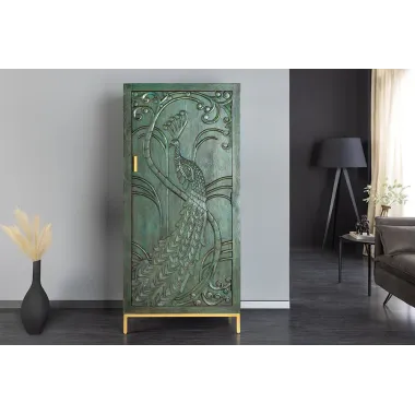 Dzięki tej komodzie z litego drewna mango prawdziwe dzieło sztuki przeniesie się do Twojego domu. Dwoje drzwi szafki pokryte jest dużymi, złotymi skrzydłami, które również reprezentują uchwyty. Skrzydła anioła są szczególnie rzeźbione i wykańczane ręcznie. Skrzydła nawiązują również do wyglądu złotej ramy, dzięki czemu te dwa elementy świetnie kontrastują z poczerniałym drewnianym korpusem.