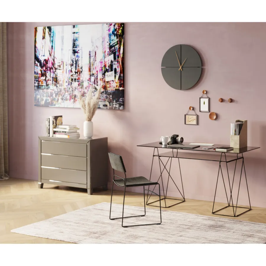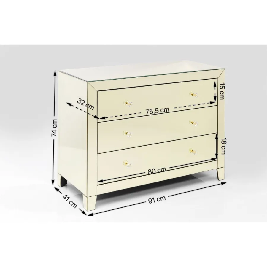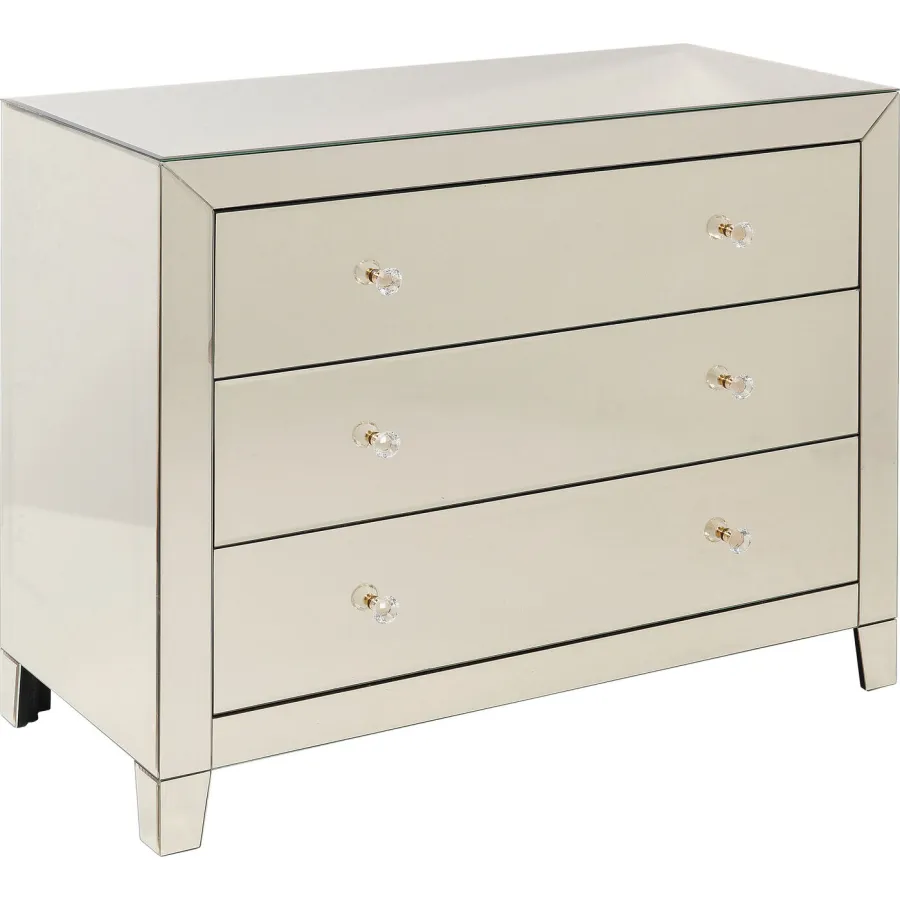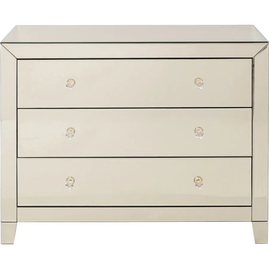 Korpus: płyta pilśniowa średniej gęstości (MDF) lakierowana, stopka/podstawa: lite drewno jodłowe lakierowane, szuflada: płyta pilśniowa średniej gęstości (MDF) lakierowana, uchwyty: szkło przezroczyste, panele: szkło lustrzane, pokrywa