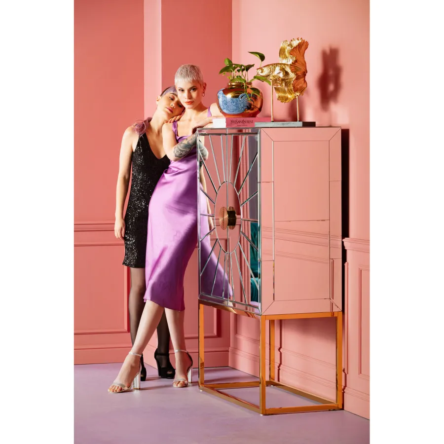 Ten kredens wnosi światło słoneczne do każdego pomieszczenia. Z jednej strony ze względu na efektowny design, z drugiej dlatego, że lustrzane meble odbijają światło i nadają pomieszczeniom jasność i blask. Jako centralny mebel Queen jest idealnym wyborem, aby dodać uroku i wspaniałości salonowi, sypialni, a nawet domowemu biuru. Sprawdzi się także w niewielkich pomieszczeniach, gdyż jego wymiary 162 (szerokość) x 77 (wysokość) x 40 (głębokość) cm sprawiają, że Queen jest kompaktowym faworytem