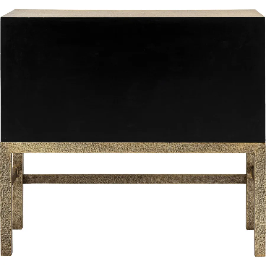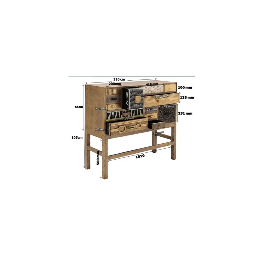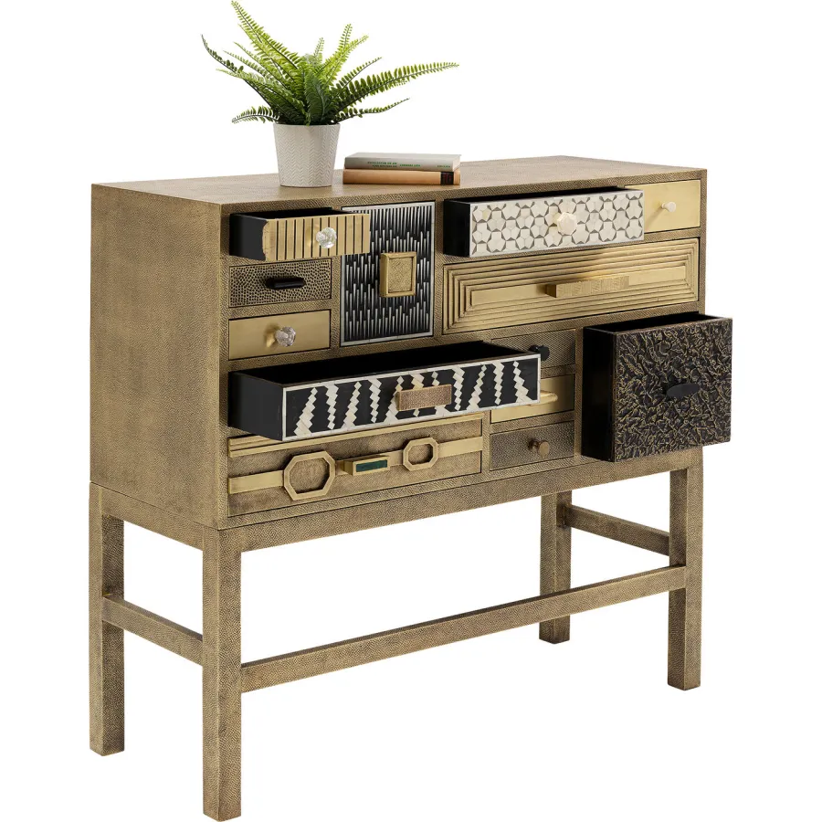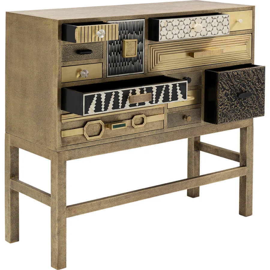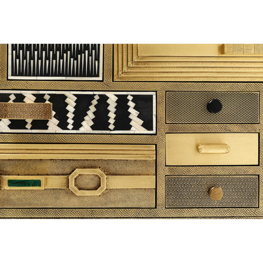 Intarsja: kolorowe szkło, muszla, kość bawola „Bubalus Bubalis”, Korpus: stal platerowana mosiądzem (blacha stalowa), Płyta pilśniowa średniej gęstości (MDF) lakierowana, Rama szuflady: Płyta pilśniowa średniej gęstości (MDF) lakierowana, Uchwyty: szkło przezroczyste, Nogi: drewno z recyklingu Lite drewno fornirowane blacha niklowa,