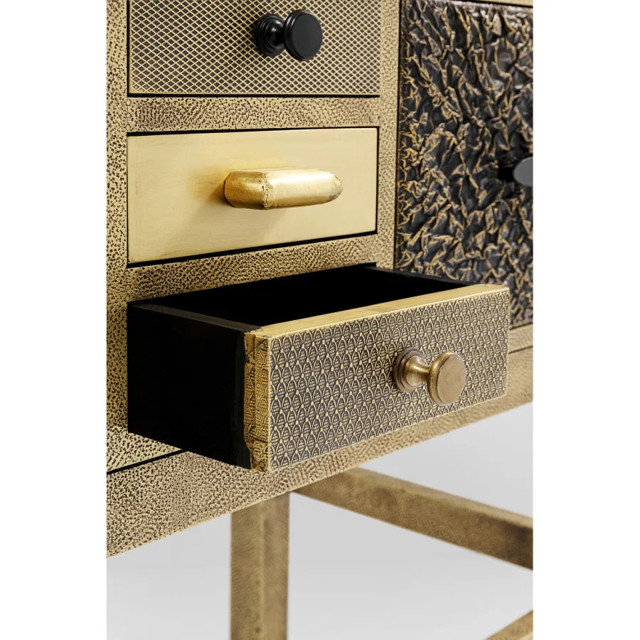 Jego kluczowy element ekskluzywnego stylu wyposażenia opowiada o wielowiekowej tradycji rzemiosła. W historycznych Indiach meble platerowane złotem lub srebrem uważano za wyraz bogactwa i dobrobytu. Nie mogło zabraknąć także ozdobnych wzorów jak na frontach szuflad tej komody. Każdy egzemplarz jest wyjątkowy, a jego ręczne wykonanie zajmuje wiele dni. Warto również wspomnieć o tym, że Chalet oferuje dużo miejsca do przechowywania. Przede wszystkim jednak nabywasz mebel wykonany z wysokiej jakości materiałów, który posłuży Ci przez długi czas