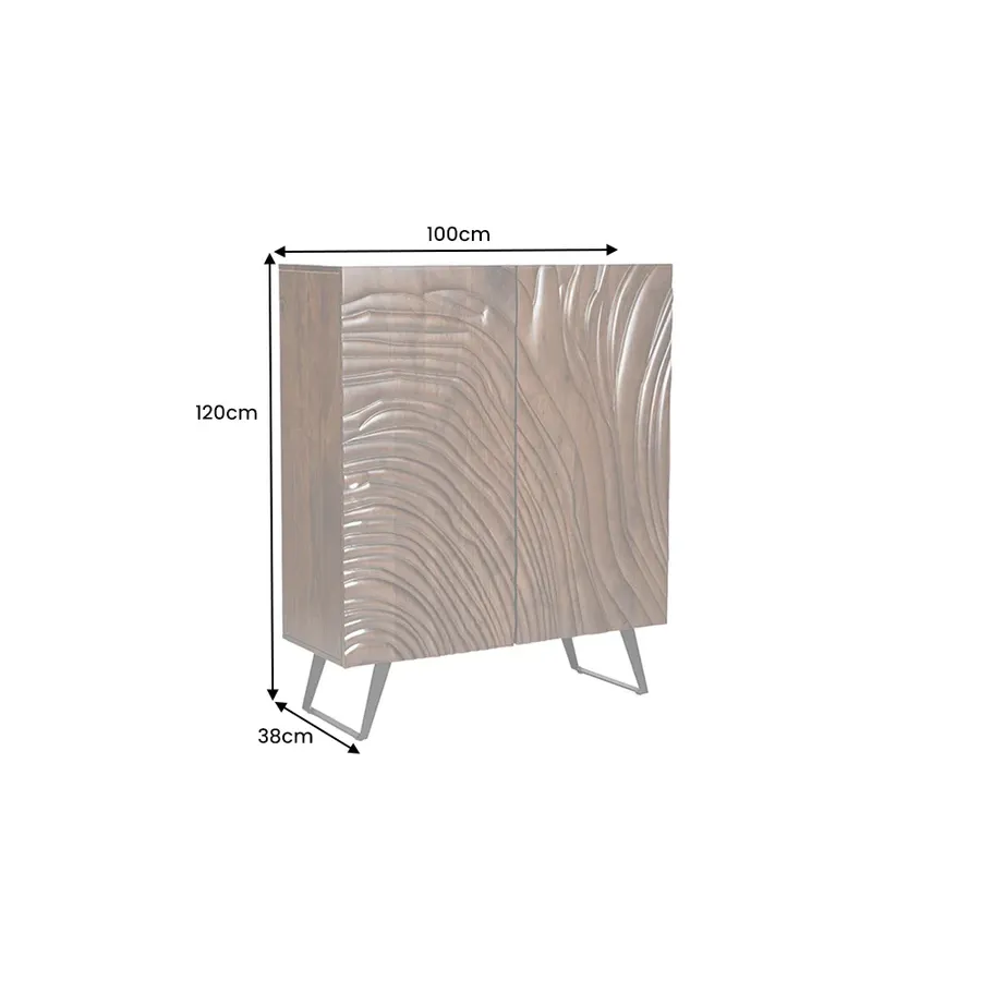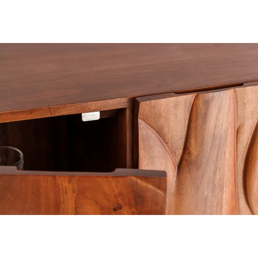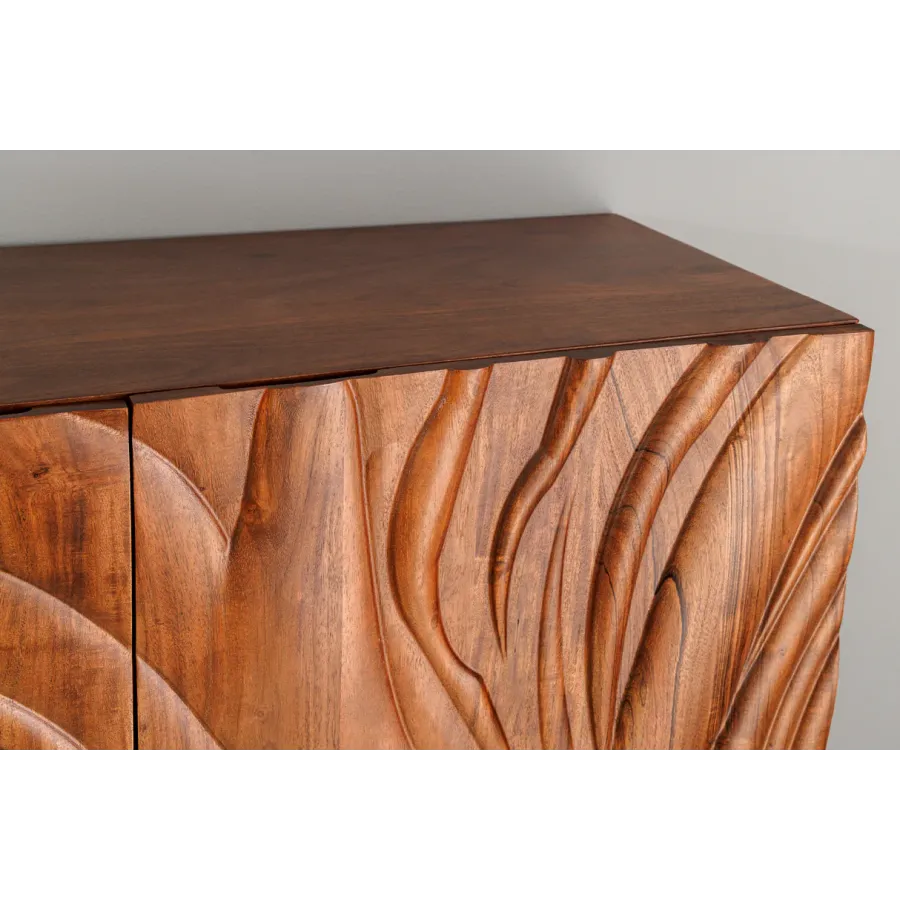 Komoda FLUID w eleganckim kolorze orzechowego brązu dzięki imponującemu frontowi 3D stanie się prawdziwą atrakcją Twojego salonu, jadalni lub sypialni. Wykonany z litego drewna akacjowego zachwyca wyrazistym usłojeniem i wysoką jakością wykonania. Drzwi z efektem 3D nadają meblowi wyjątkową głębię i przyciągają wzrok. Delikatna metalowa rama sań doskonale dopełnia projekt i zapewnia stabilność oraz nowoczesny, pływający wygląd.