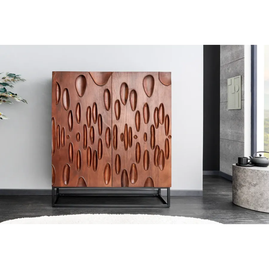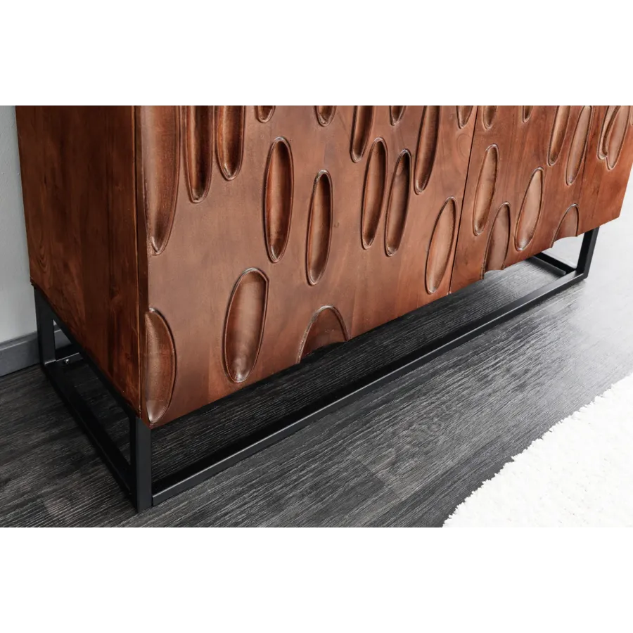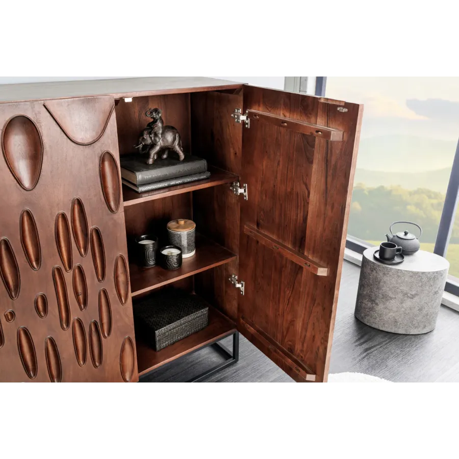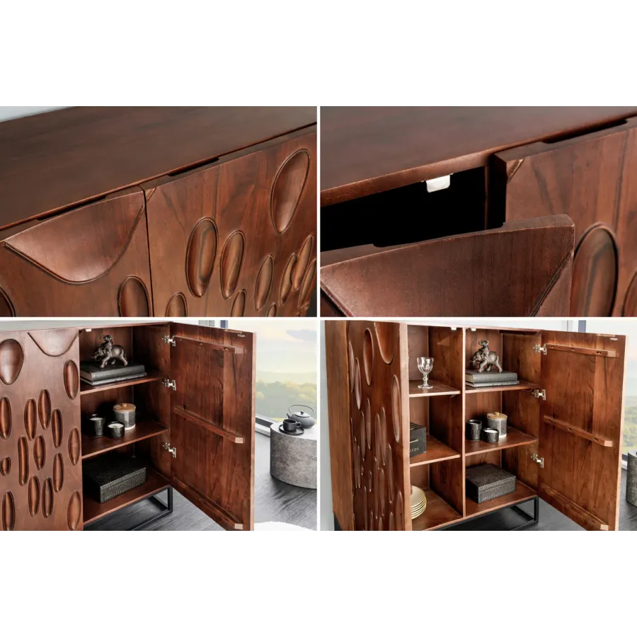 Komoda DUNE w eleganckim kolorze orzechowego brązu dzięki imponującemu frontowi 3D stanie się prawdziwą atrakcją Twojego salonu, jadalni lub sypialni. Wykonany z litego drewna akacjowego zachwyca wyrazistym usłojeniem i wysoką jakością wykonania. Drzwi z efektem 3D nadają meblowi wyjątkową głębię i przyciągają wzrok. Delikatna metalowa rama sań doskonale dopełnia projekt i zapewnia stabilność oraz nowoczesny, pływający wygląd.