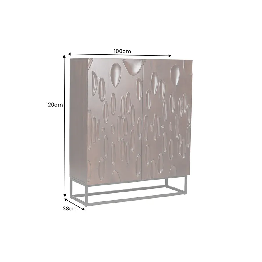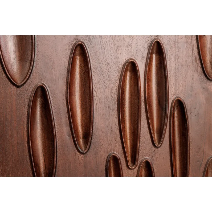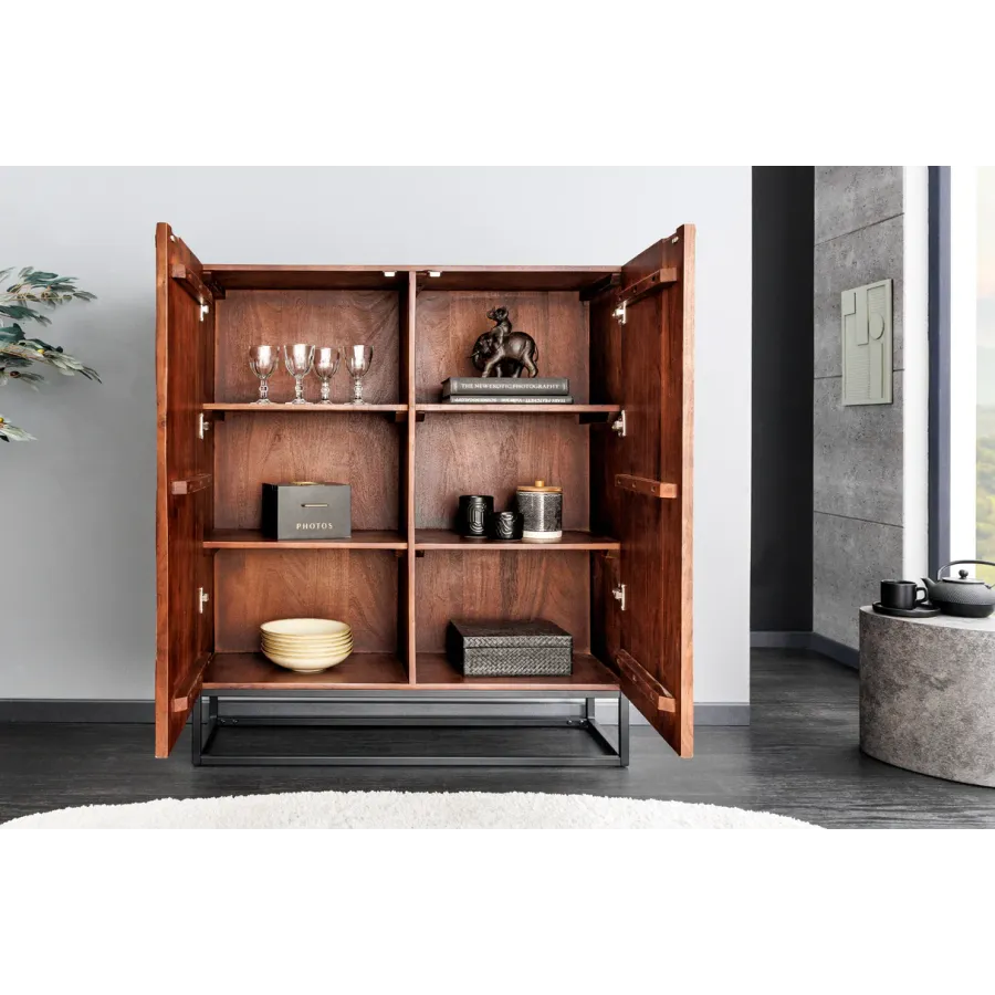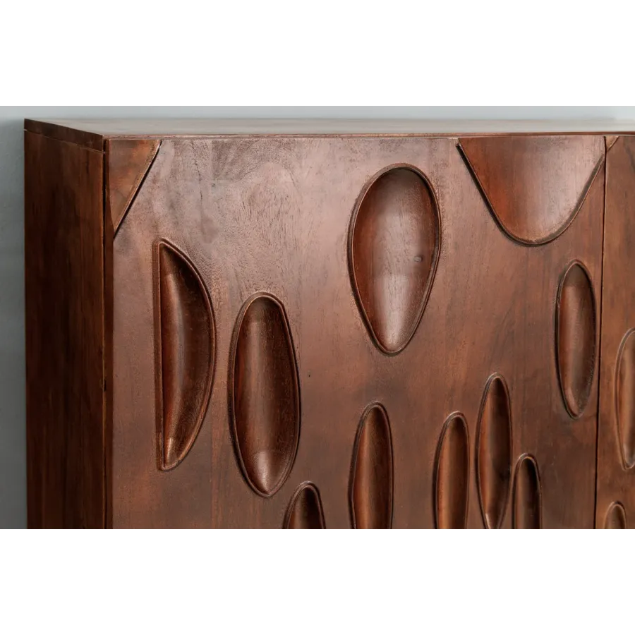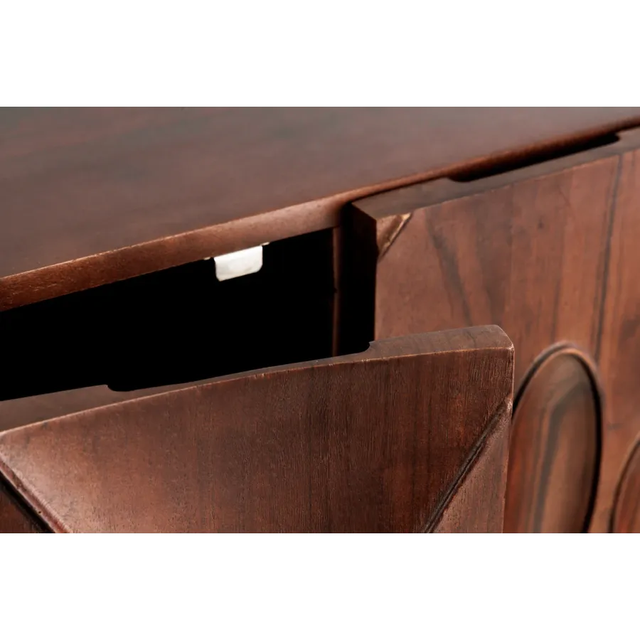 Komoda DUNE w eleganckim kolorze orzechowego brązu dzięki imponującemu frontowi 3D stanie się prawdziwą atrakcją Twojego salonu, jadalni lub sypialni. Wykonany z litego drewna akacjowego zachwyca wyrazistym usłojeniem i wysoką jakością wykonania. Drzwi z efektem 3D nadają meblowi wyjątkową głębię i przyciągają wzrok. Delikatna metalowa rama sań doskonale dopełnia projekt i zapewnia stabilność oraz nowoczesny, pływający wygląd.