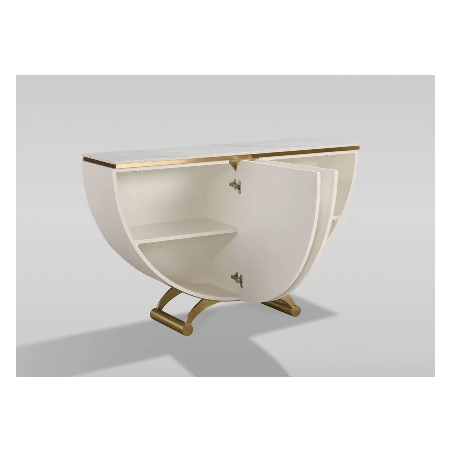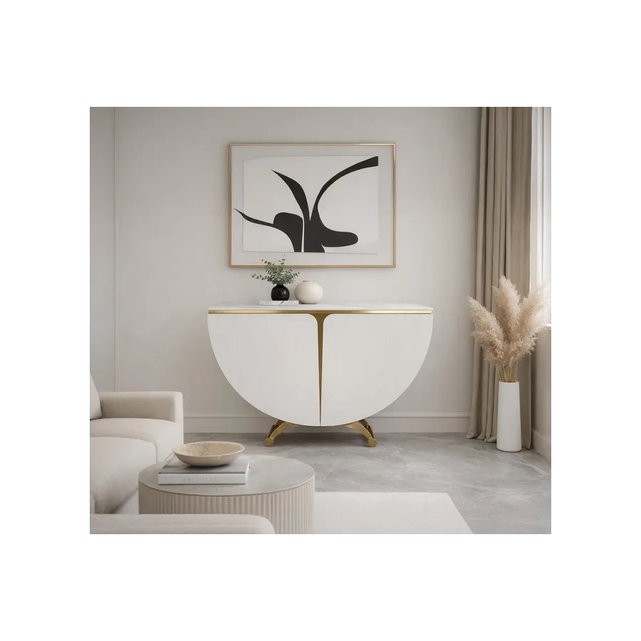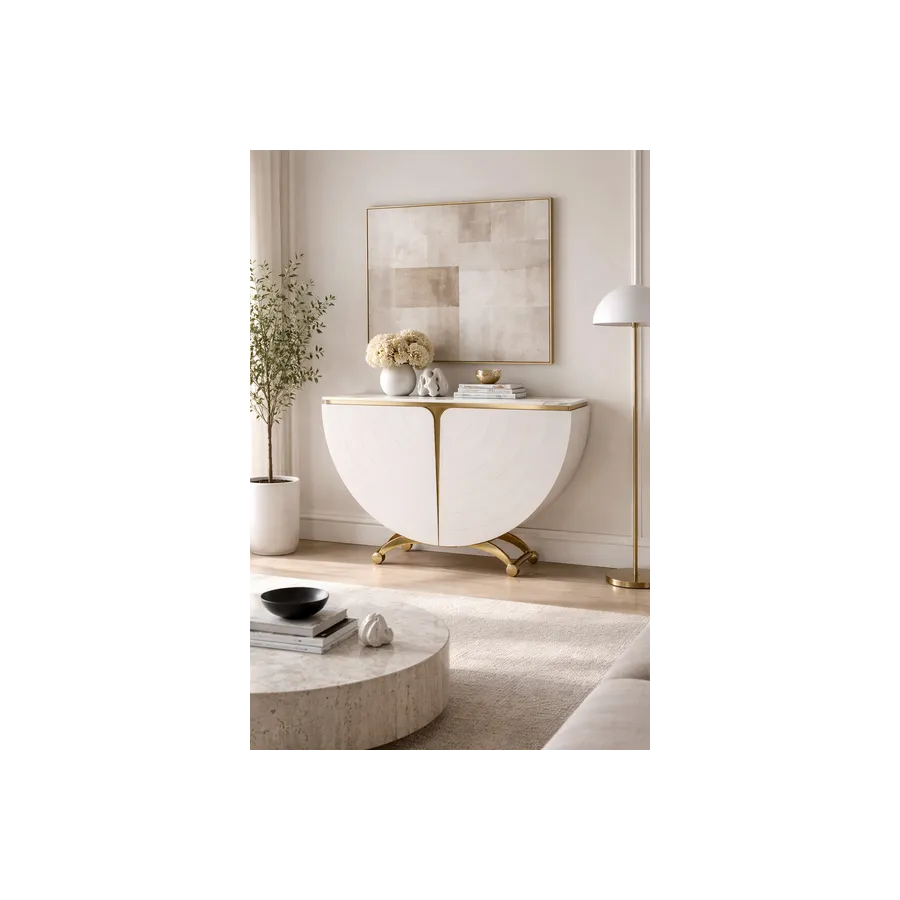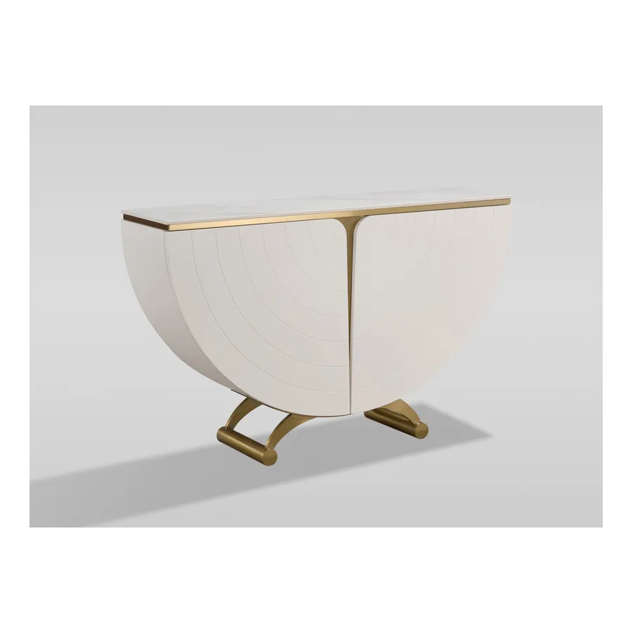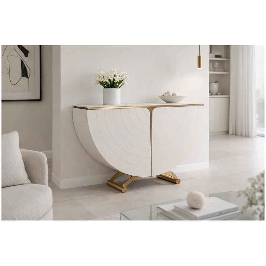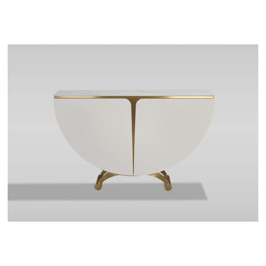 Elegancka konsola w kolorze złamanej bieli w pólkolistej i symetrycznej bryle. Na frontowych, zaokrąglonych dźwiczkach widoczne delikatne, koncentryczne linie nadające głębi i elegancji. Blat z wykończeniem marmurowym.