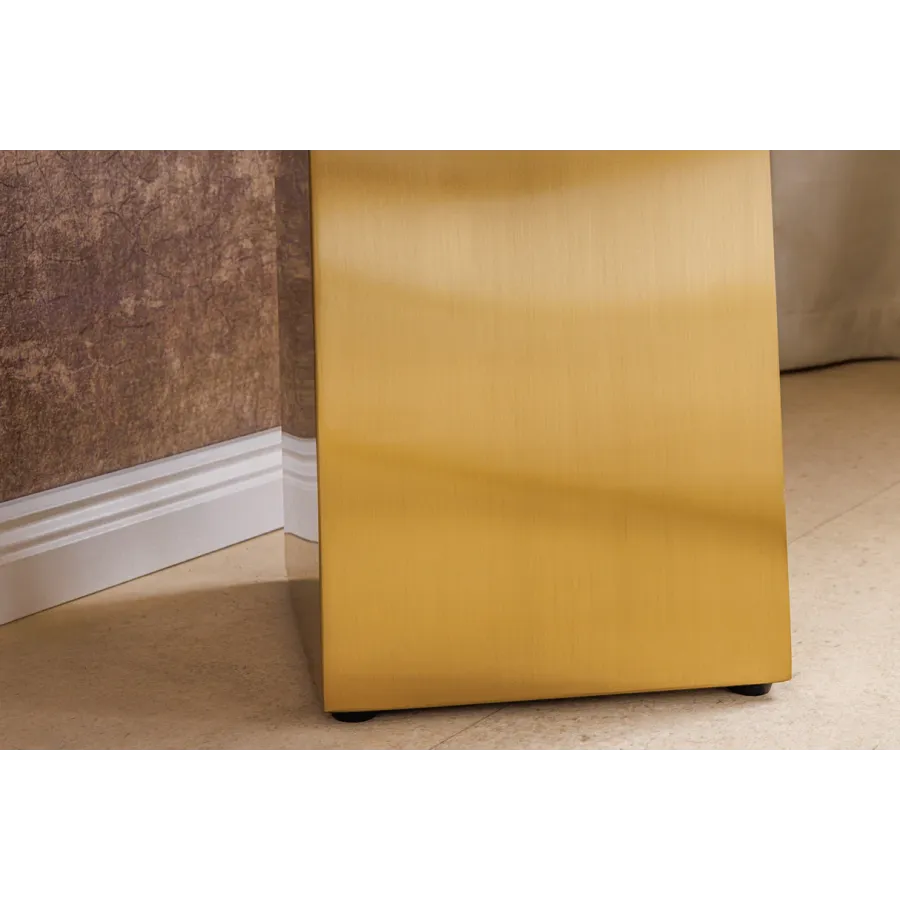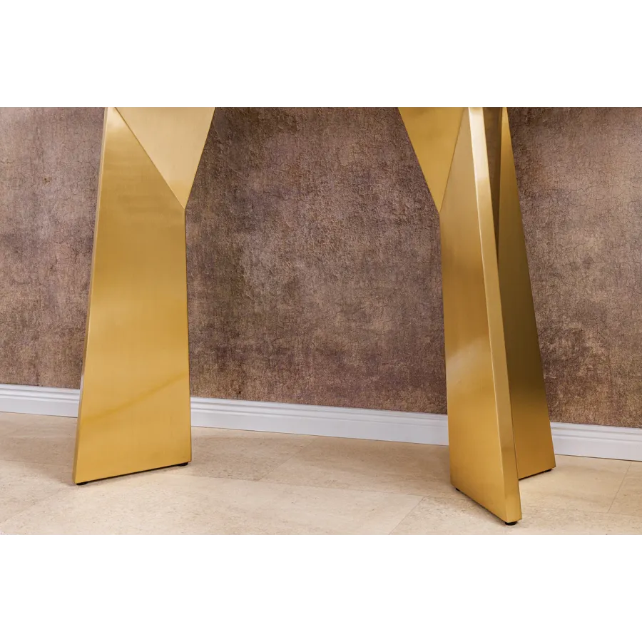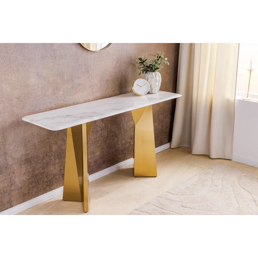 Wytworna, zjawiskowa, pełna klasy – EXTRAVAGANCIA to konsola, obok której nie da się przejść obojętnie. Imponujący biały blat w optyce marmuru przyciąga wzrok subtelnym połyskiem, a szampańska, szczotkowana podstawa w odcieniu złota nadaje całości szlachetnego wyrazu.