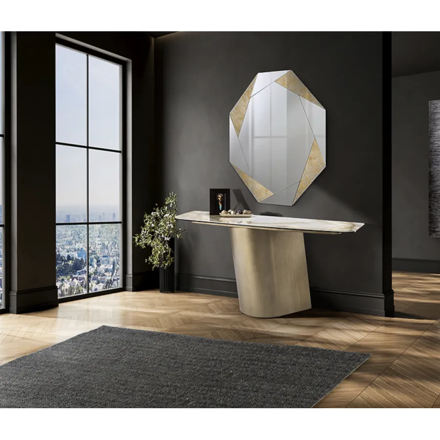 Konsola wykonana z metalu w wykończeniu szczotkowanego mosiądzu. Laminowany blat z porcelany i szkła z dekoracją z marmuru żyłkowanego.