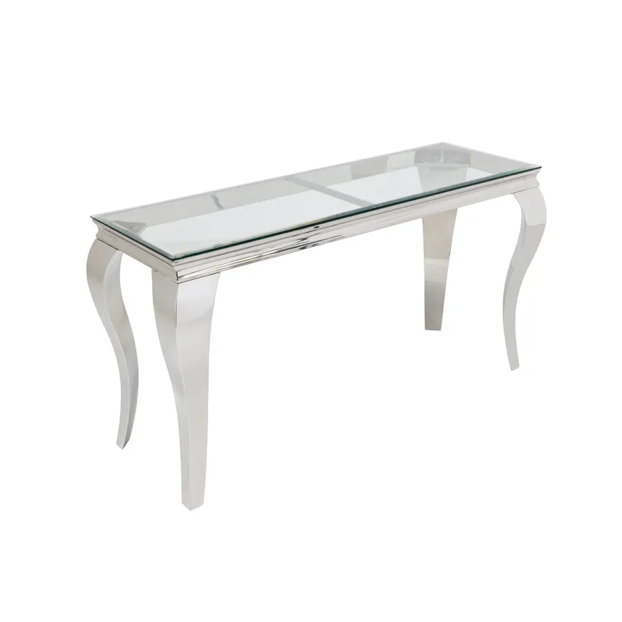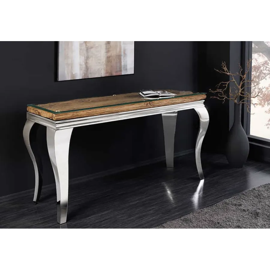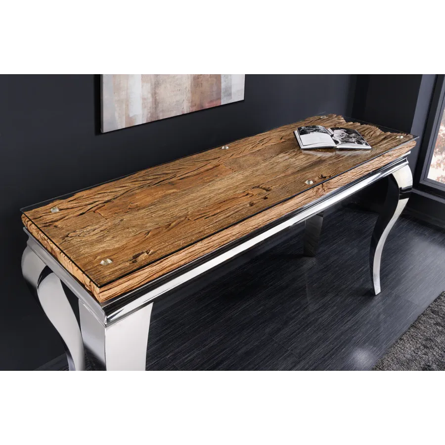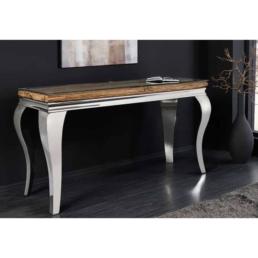 Luksusowy design tej barokowej konsoli podkreślają elegancko wygięte, chromowane nogi stołu i blat z drewna tekowego. Dzięki temu mebel ten stanie się wyjątkowym elementem przyciągającym wzrok w Twoim salonie. Dzięki temu eleganckiemu projektowi możesz nadać swojemu domowi imponujący wygląd. Ten imponujący stół możesz połączyć z nowoczesnymi lub naturalnymi dodatkami. Po prostu spróbuj!