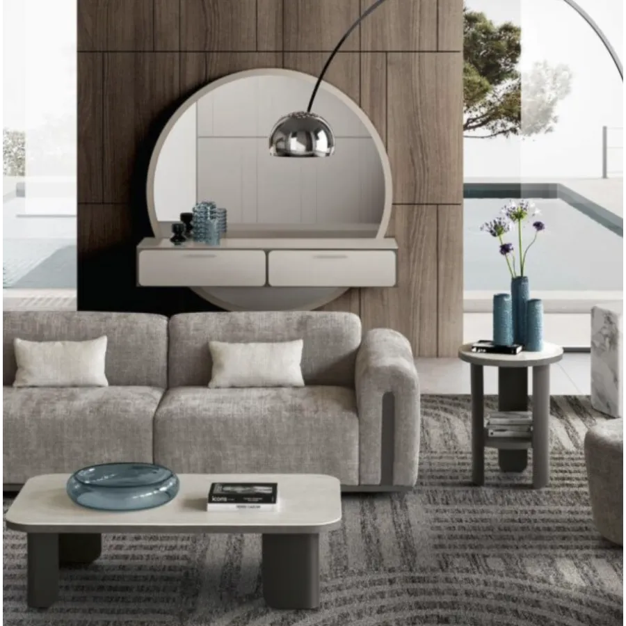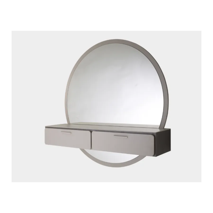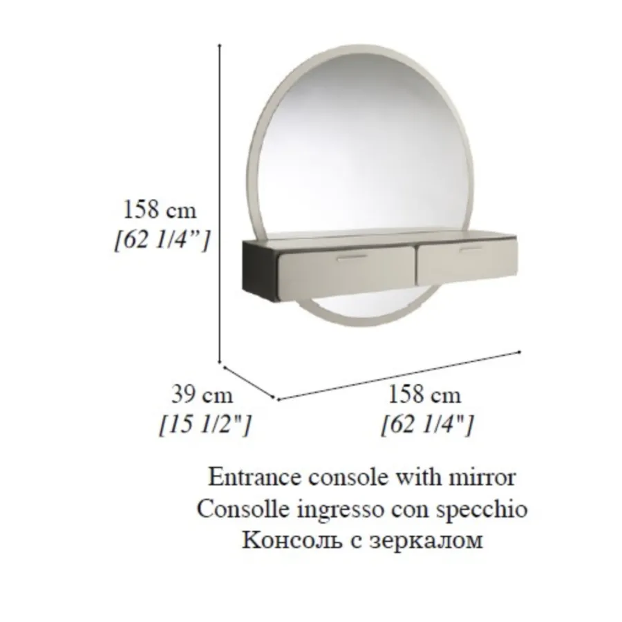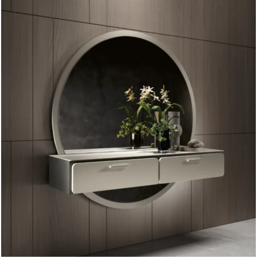 Zawieszona na ścianie konsola o zaokrąglonych liniach unosi się z lekkością, jakby przecząc grawitacji. Towarzyszy jej monumentalne, okrągłe lustro, które odbija światło i przestrzeń, dodając wnętrzu głębi i oddechu. Ich wzajemna symbioza tworzy elegancki rytuał codzienności, podnosząc gest odkładania kluczy czy spojrzenia w lustro do rangi przyjemności.
