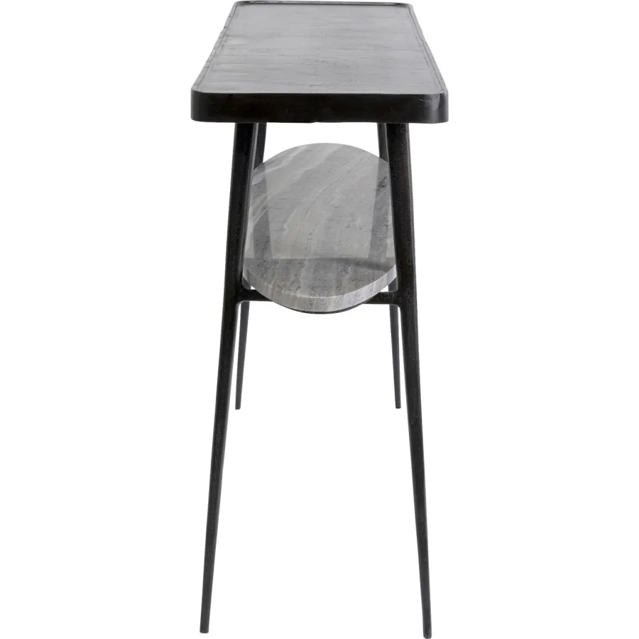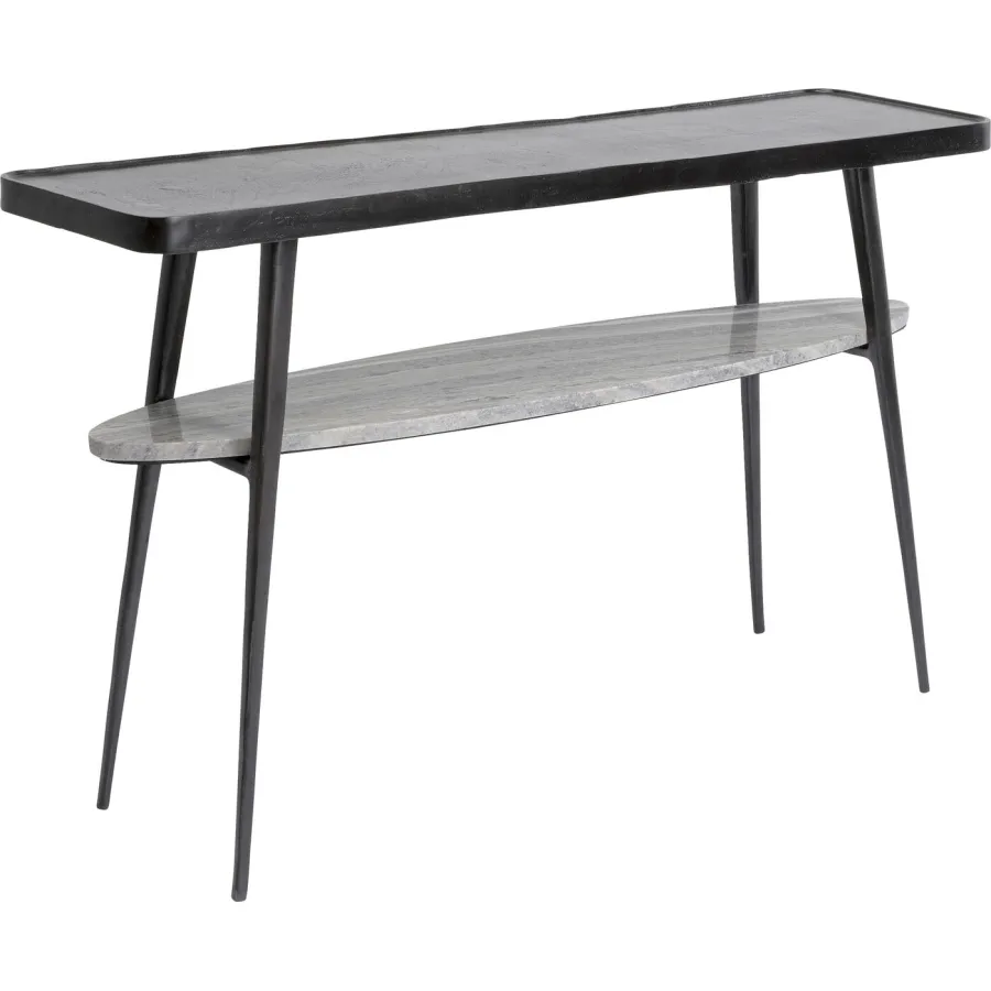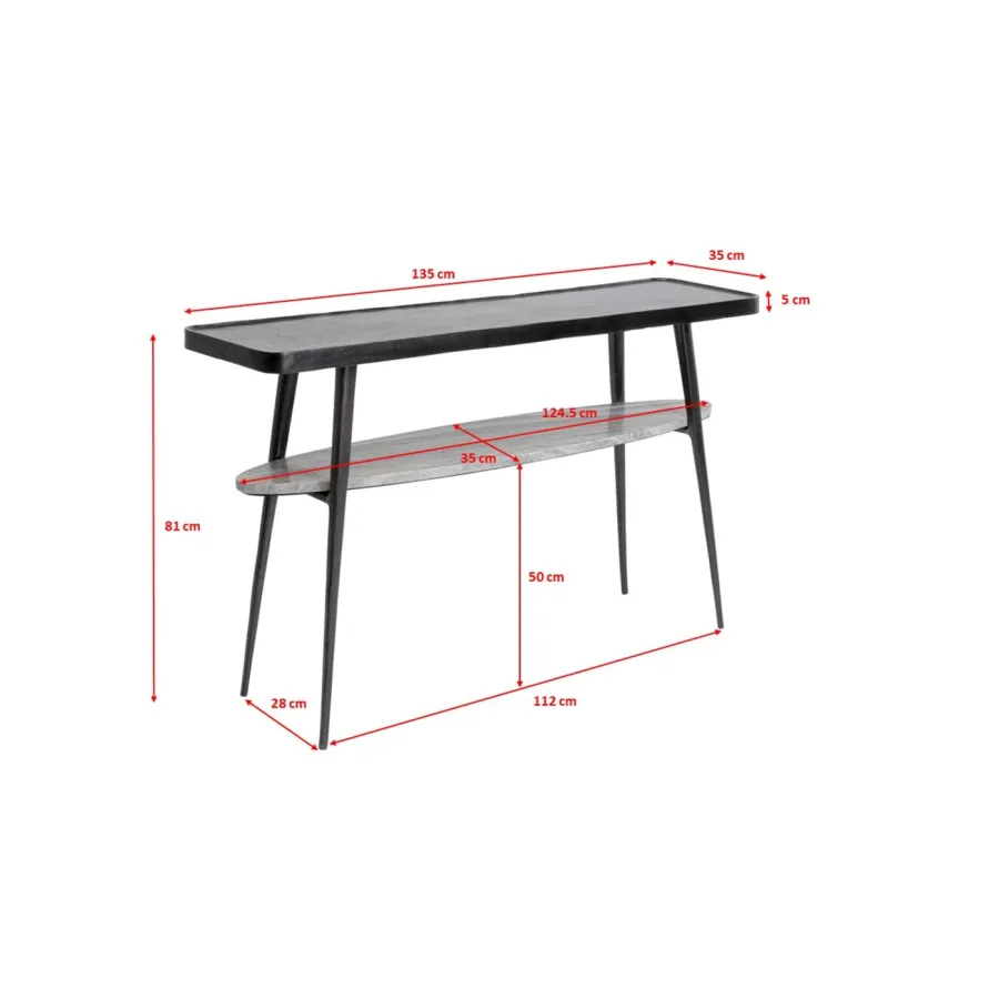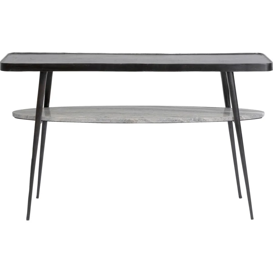 Ten wykwintny stolik konsolowy ucieleśnia czystą elegancję i ponadczasowe piękno. Blat wykonany z szlachetnego marmuru nadaje mu luksusowy charakter, a designerska rama wykonana z lakierowanego na czarno i szaro metalu emanuje nowoczesnym wyrafinowaniem. Połączenie wysokiej jakości materiałów i stylowego wykończenia sprawia, że ten metalowy stolik-konsola jest oszałamiającym punktem centralnym, który przekształci każdy salon w wyrafinowaną oazę