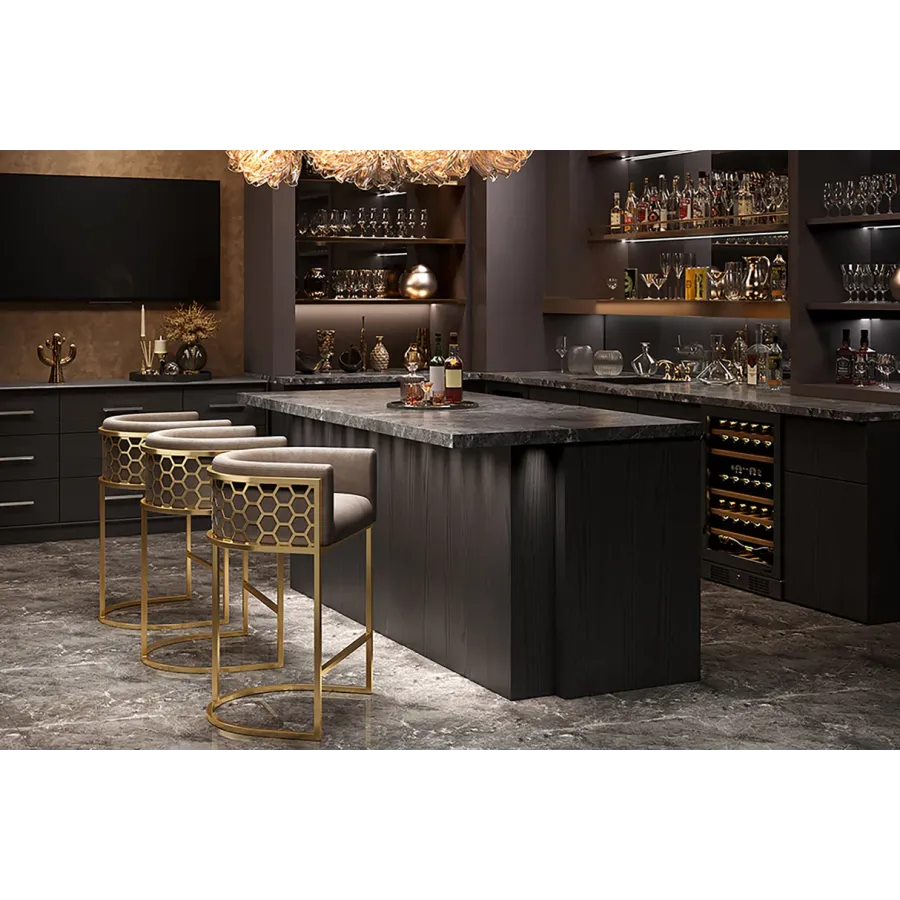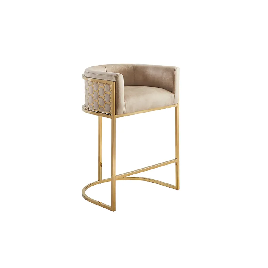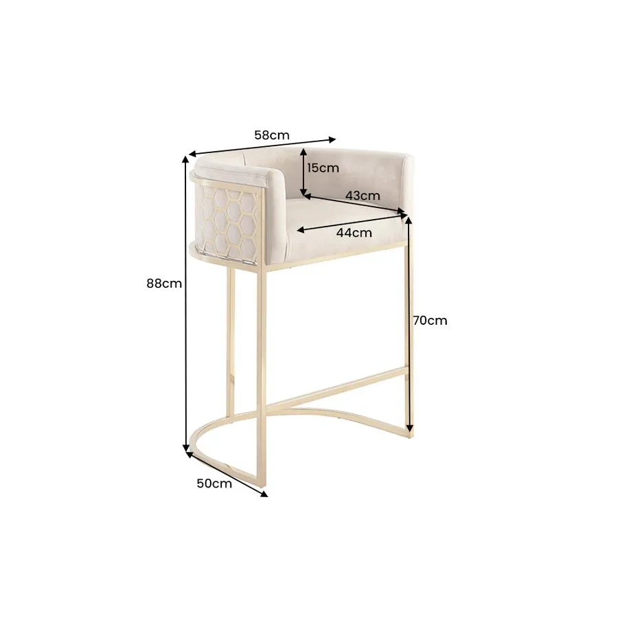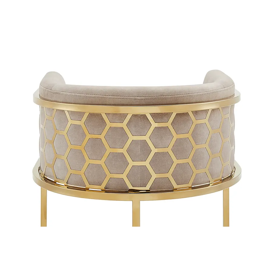 Ten hoker barowy łączy luksusowy wygląd z wyjątkowym komfortem siedzenia. Miękko wyściełane siedzisko pokryte jest eleganckim, szarym beżowym i wygodnie podpiera je niskie oparcie. Wyrazista złota rama dodaje mu szykownego charakteru; struktura plastra miodu po bokach nadaje mu głębi i ekskluzywnego wyglądu. Zakrzywiony wspornik podłogowy zapewnia lekką sylwetkę i stabilność przy barze.