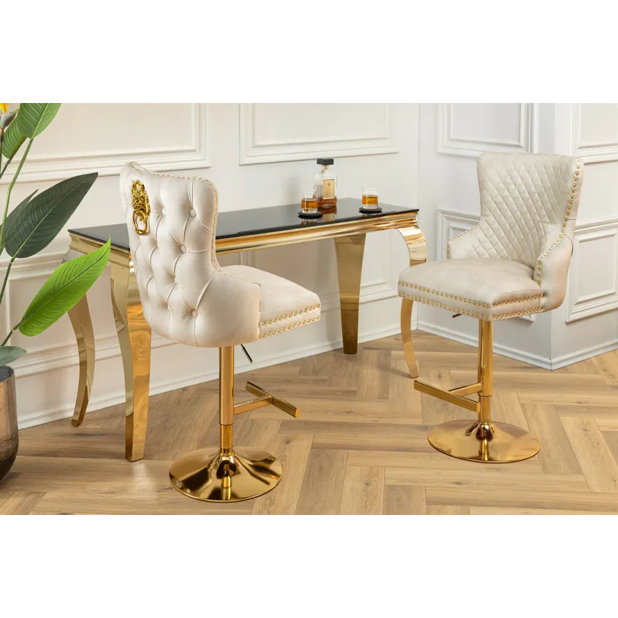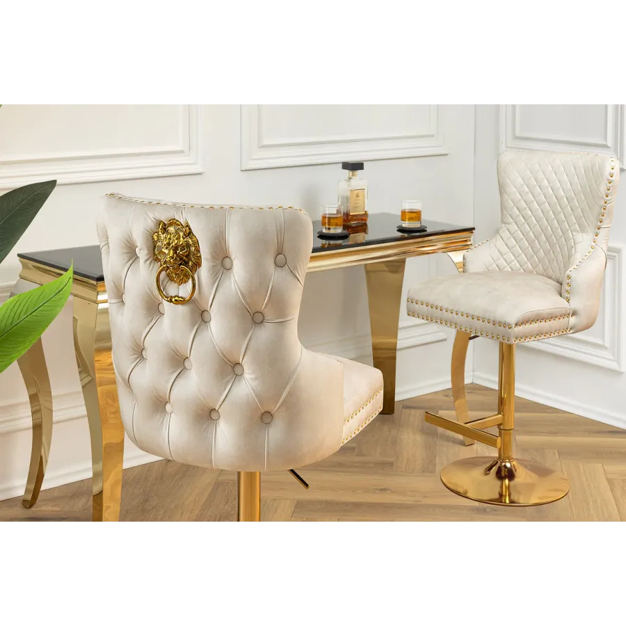 Usiądź i ciesz się nowym ulubionym miejscem przy stole barowym! Nasze wygodne krzesła barowe z serii CASTLE DELUXE łączą w sobie maksymalny komfort siedzenia z eleganckim designem. Kolekcja mebli w stylu Chesterfield - luksus dla Twojego domu. Wyjątkowym elementem stylistycznym tej wygodnie tapicerowanej serii CASTLE DELUXE jest kołatka i z głową lwa na tylnej części oparcia: zawiera ona ozdobny srebrny pierścień i emanuje dostojną elegancją.