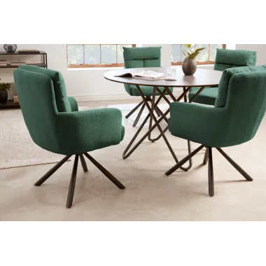 Ten imponujący fotel od razu przykuwa uwagę. Wygodna tkanina daje poczucie ciepła, komfortu i luksusu. Siedzisko można obracać o 360°, posiada ono wysokiej jakości sprężynę Bonell w siedzisku oraz wygodnie tapicerowane oparcie, które dodatkowo zostało ozdobnie wykończone ozdobnym szwem w kształcie litery T. Wreszcie, czarne metalowe nogi w stylu retro dopełniają niezwykły design krzesła.