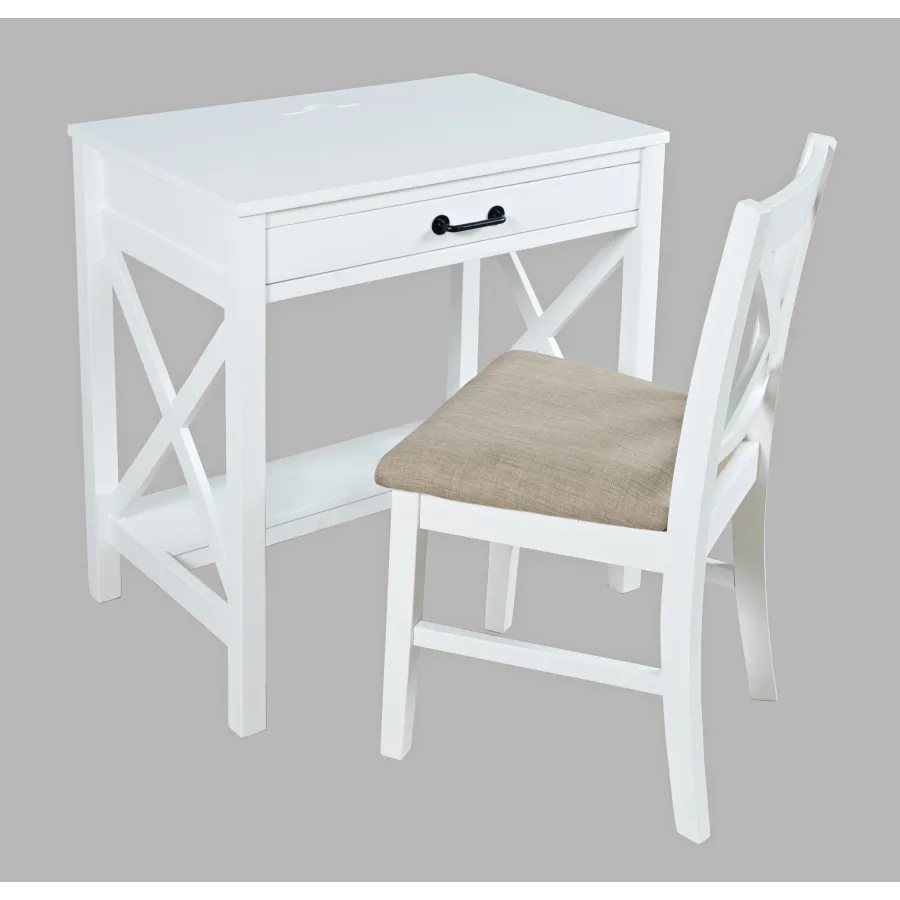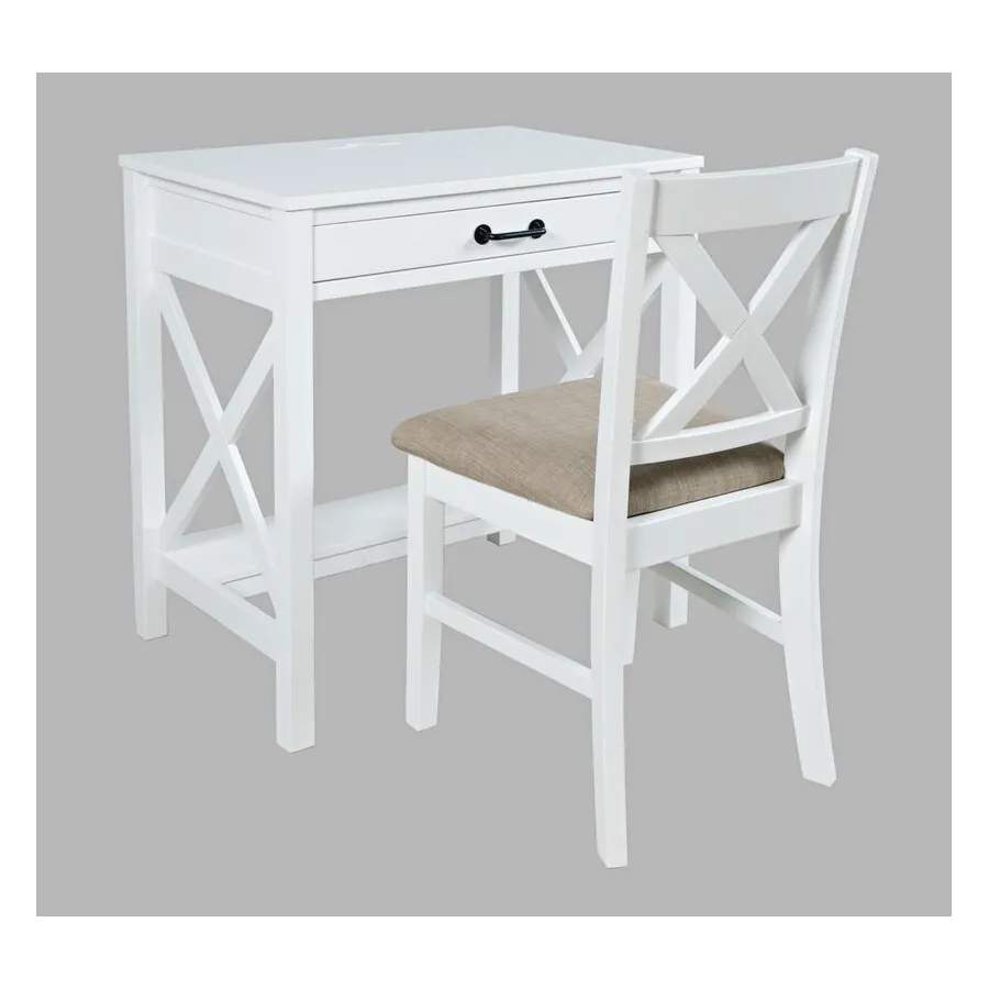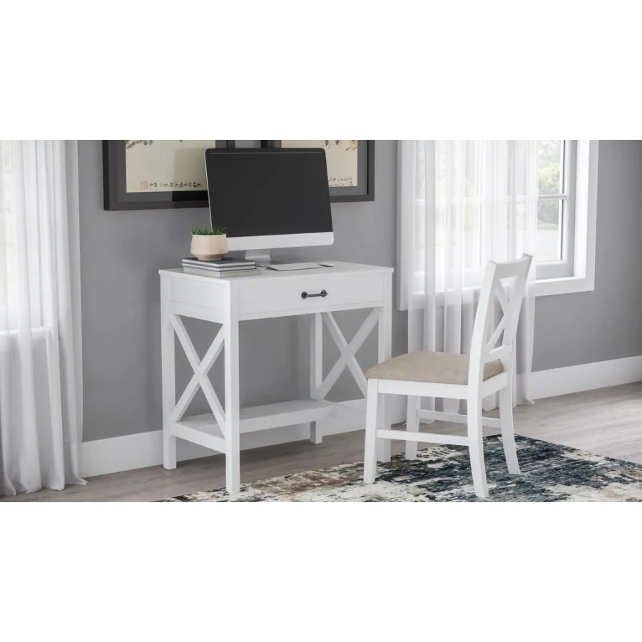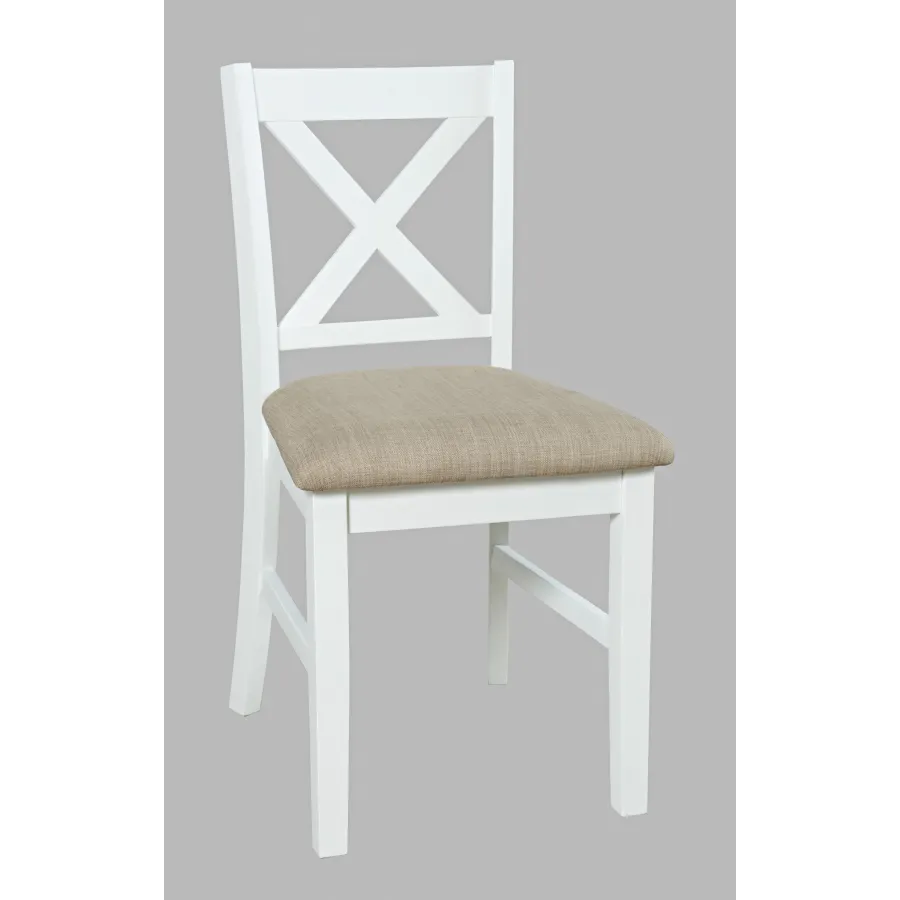 Krzesło tapicerowane w stylu rustykalnym w kolorze białym. Prostą formę przełamują plecy z oparciem krzyżowym oraz kremowe siedzisko tapicerowane.