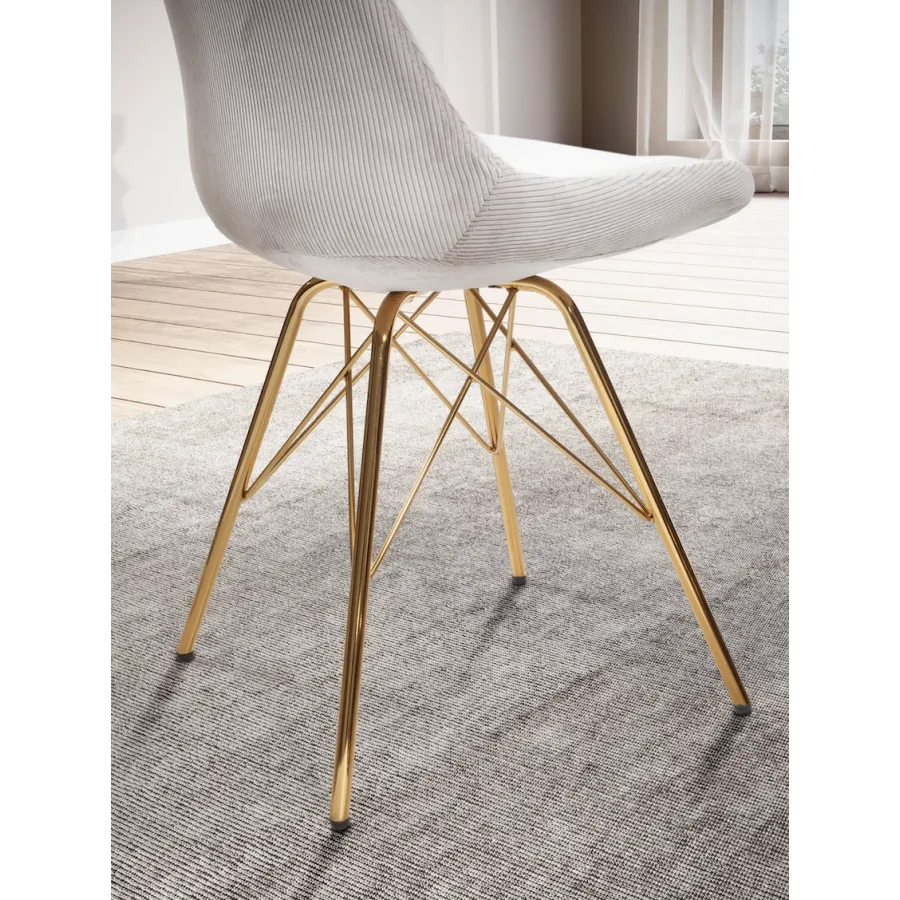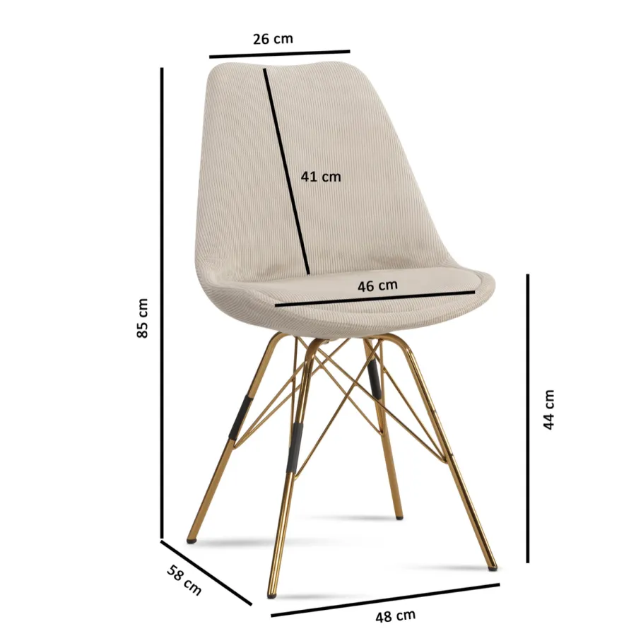 Krzesło do jadalni zachwyca anatomicznie ukształtowanym siedziskiem, które jest pokryte pokrowcem z wysokiej jakości imitacji skóry i wyraźnymi liniami. W ten sposób zapewnia stylową, a jednocześnie nowoczesną atmosferę mieszkalną. Kolejną wizualną atrakcją są nogi krzesła wykonane ze złotego metalu, które są filigranowe i nadal zapewniają stabilną podstawę.