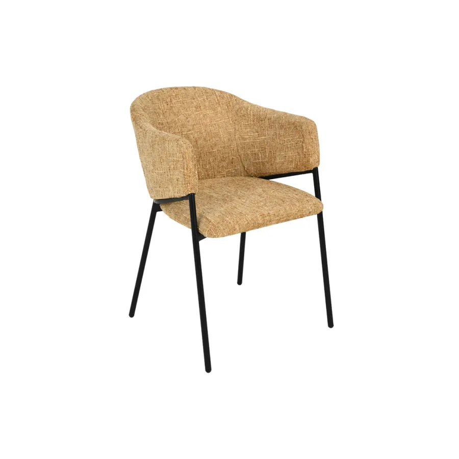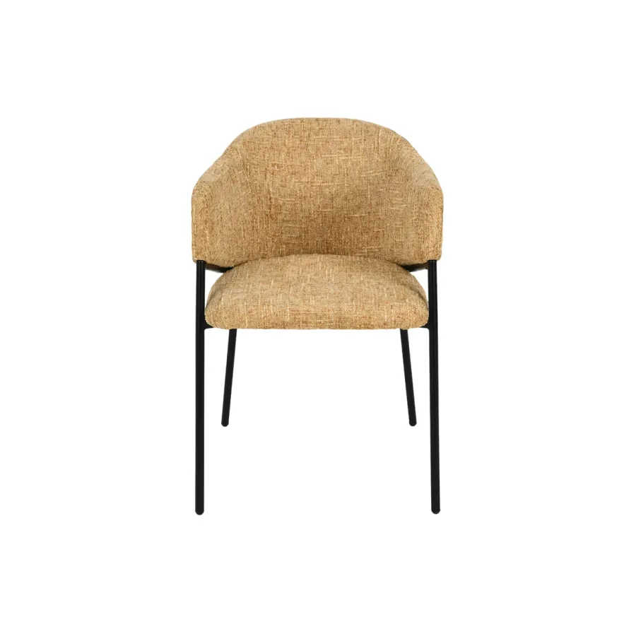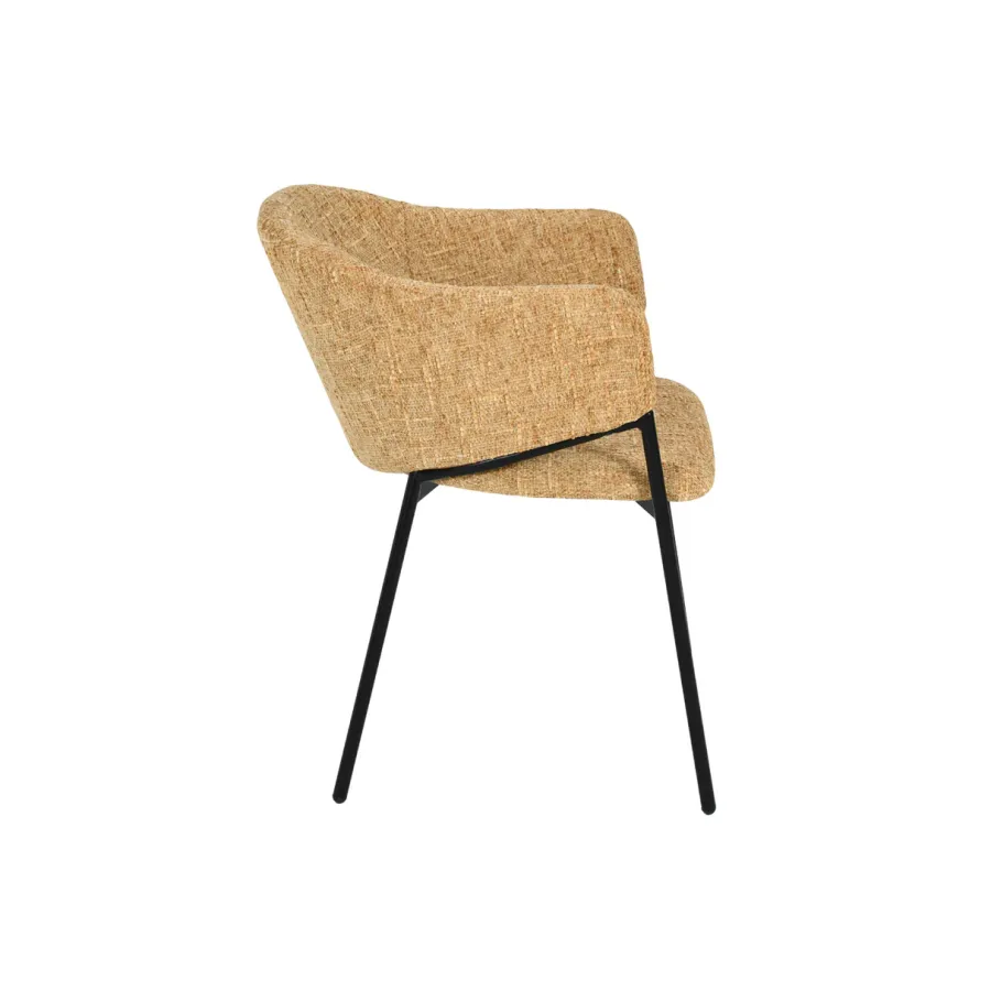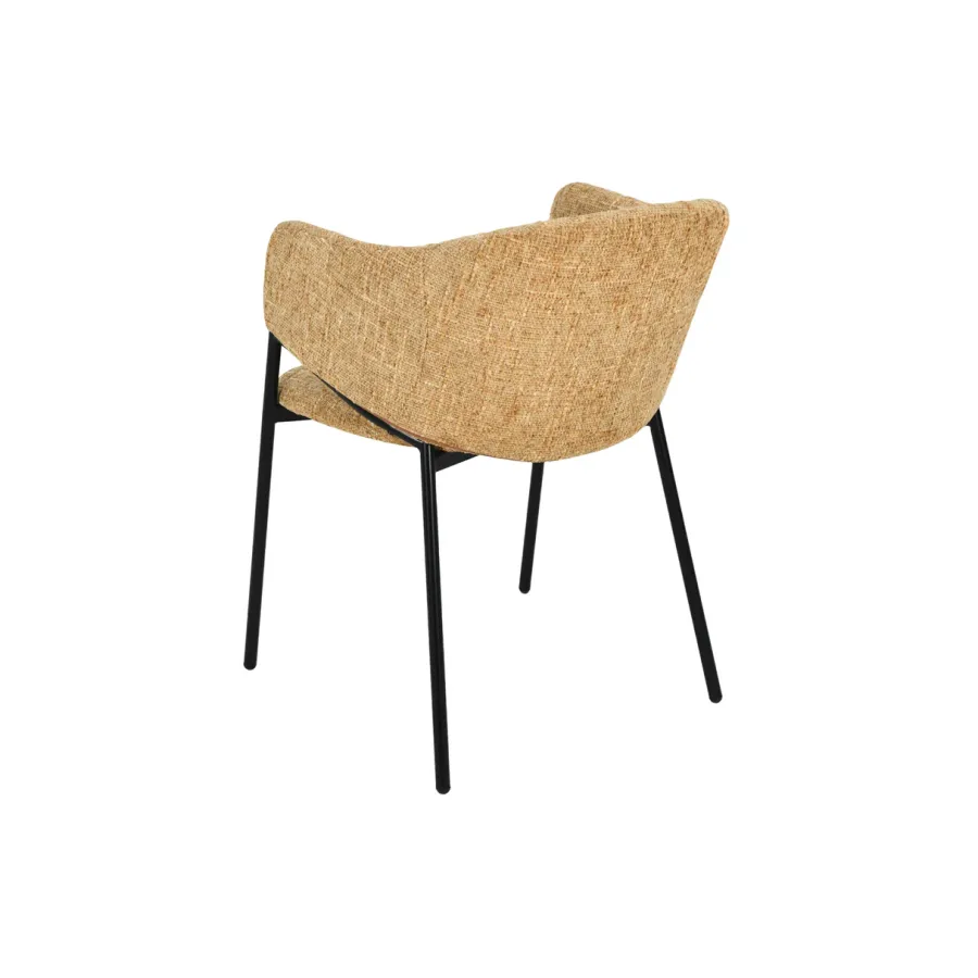 Tył oparcia krzesła  jest również pokryty tkaniną, dzięki czemu można ją umieścić w dowolnym miejscu pokoju jako atrakcyjny element przyciągający wzrok lub oddzielający pokój. Uzupełnij krzesło sofa, fotelem, stolikami bocznymi, lampami lub lustrem ściennym z czarną metalową ramą, aby uzyskać harmonijny ogólny obraz.