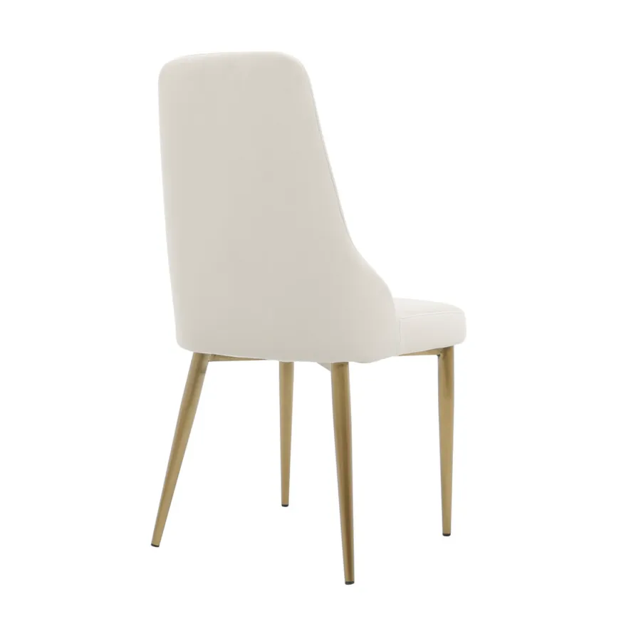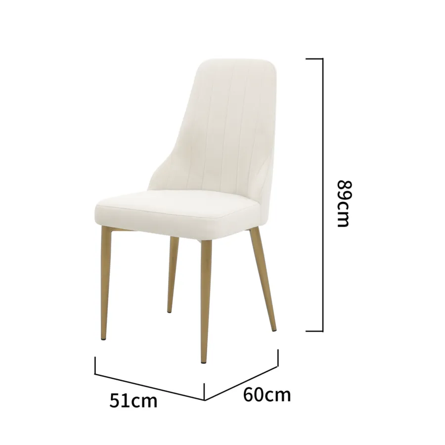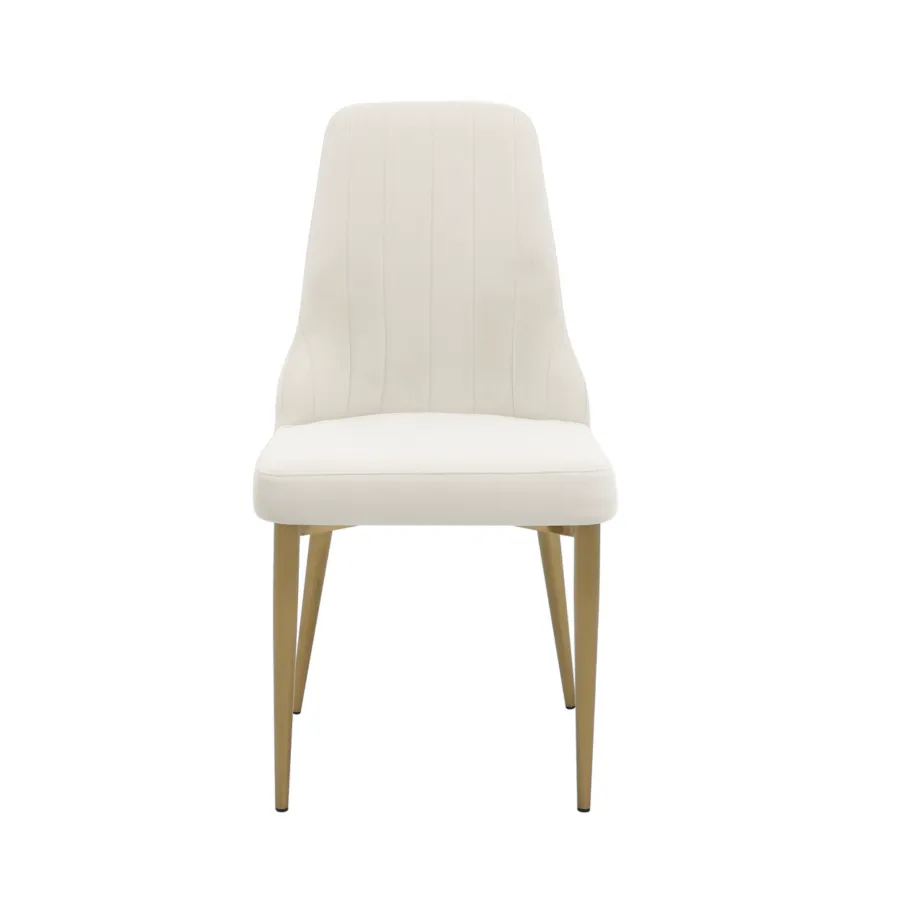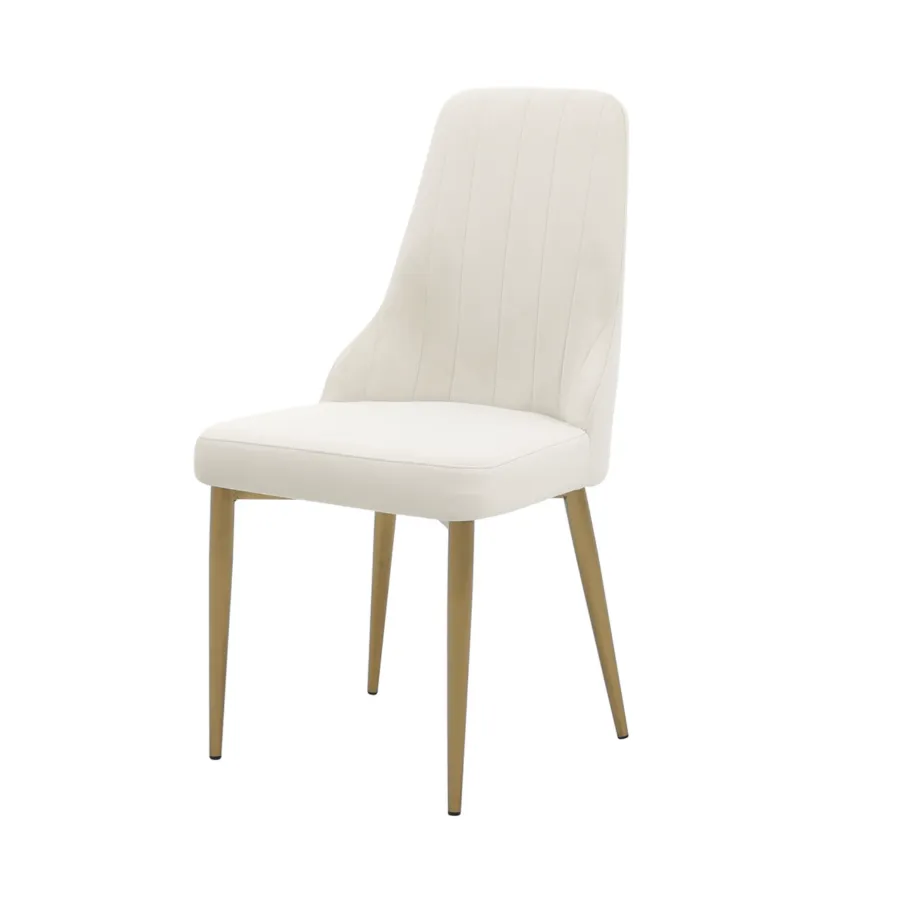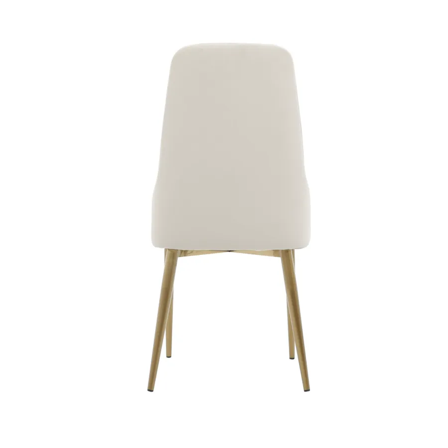To krzesło tapicerowane w stylu glamour łączy w sobie nowoczesną elegancję i ponadczasowy komfort. Smukłe nogi ze szczotkowanej stali nierdzewnej w odcieniu złota doskonale współgrają z miękką welurową tkaniną w kolorze łamanej bieli, tworząc harmonijną i wyrafinowaną całość.