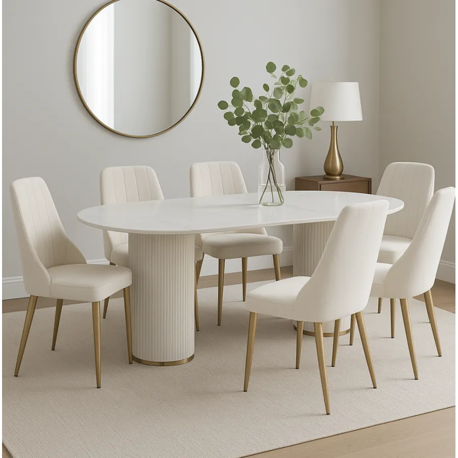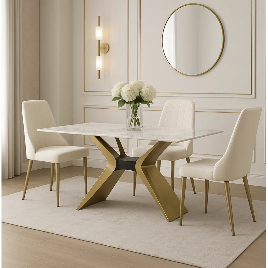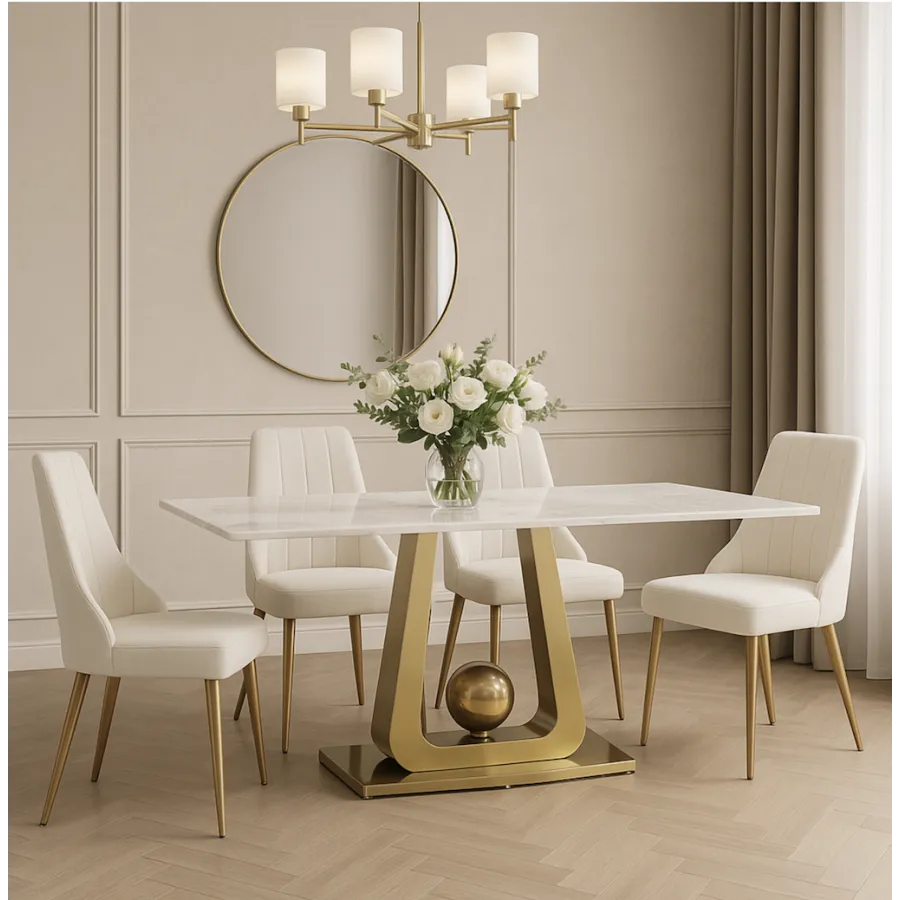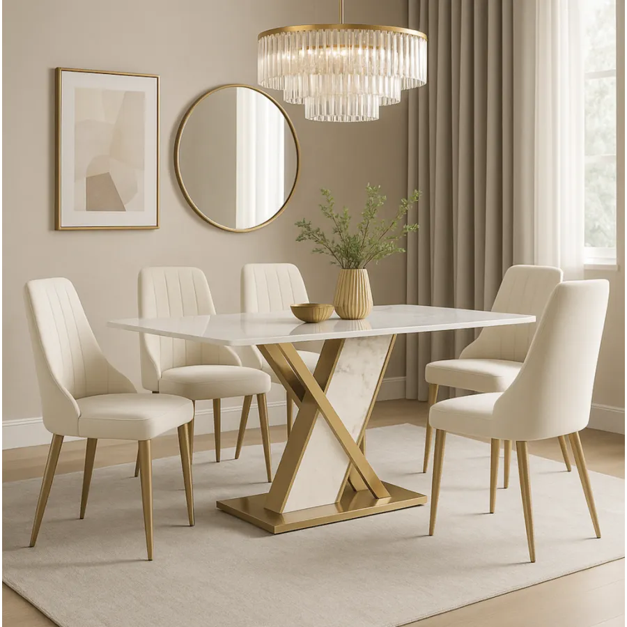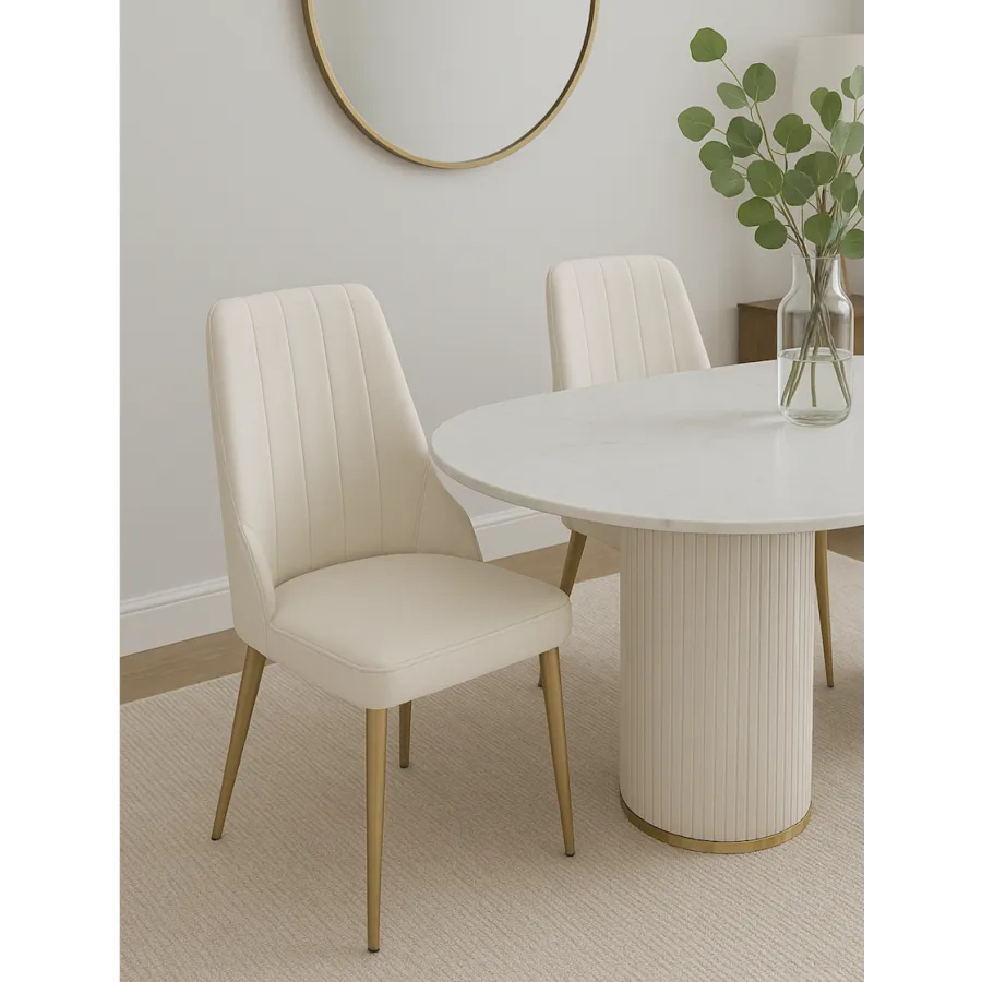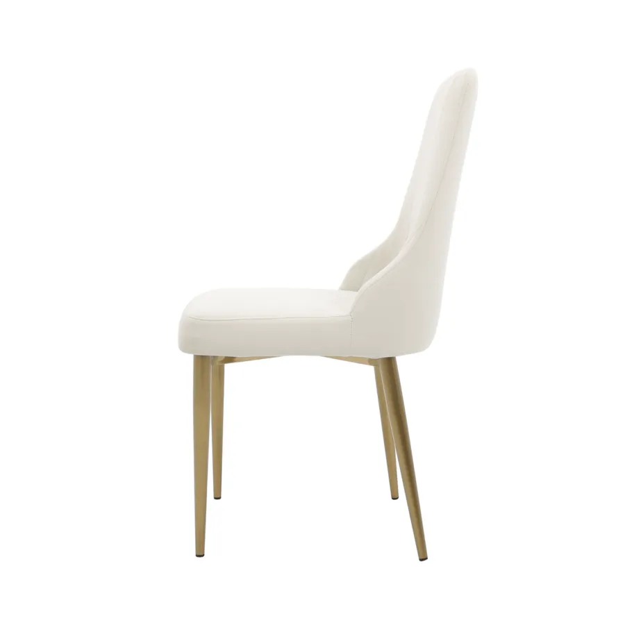 To krzesło tapicerowane w stylu glamour łączy w sobie nowoczesną elegancję i ponadczasowy komfort. Smukłe nogi ze szczotkowanej stali nierdzewnej w odcieniu złota doskonale współgrają z miękką welurową tkaniną w kolorze łamanej bieli, tworząc harmonijną i wyrafinowaną całość.