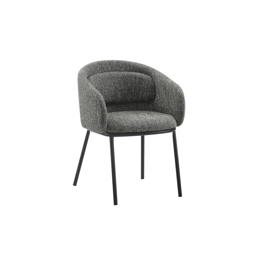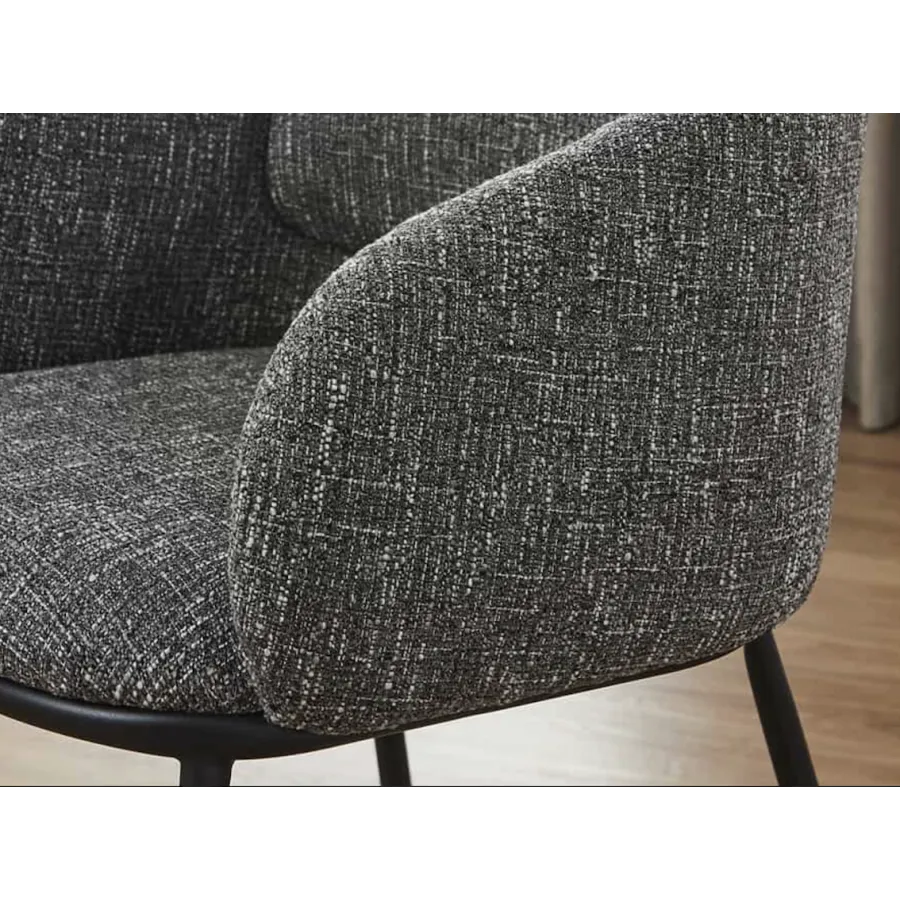 Wyposażone w miękkie, tapicerowane siedzisko pokryte tkaniną strukturalną w kolorze granitowej szarości, idealnie komponuje się z wnętrzami w stylu modern, scandi lub glamour.