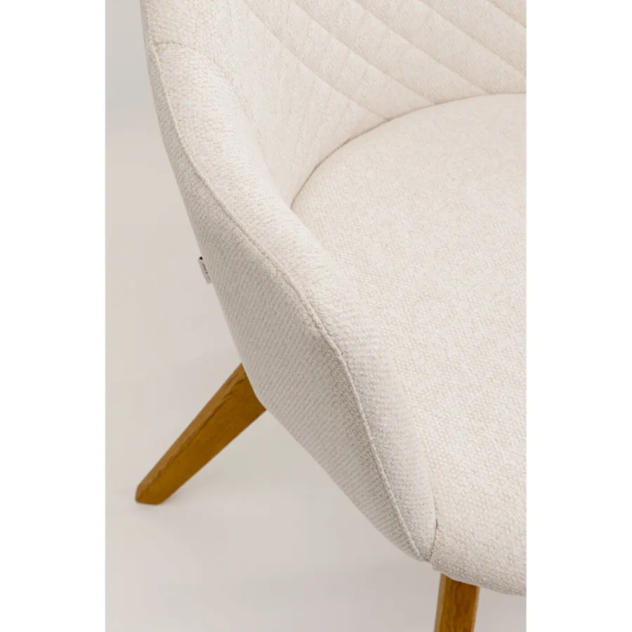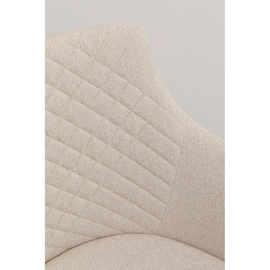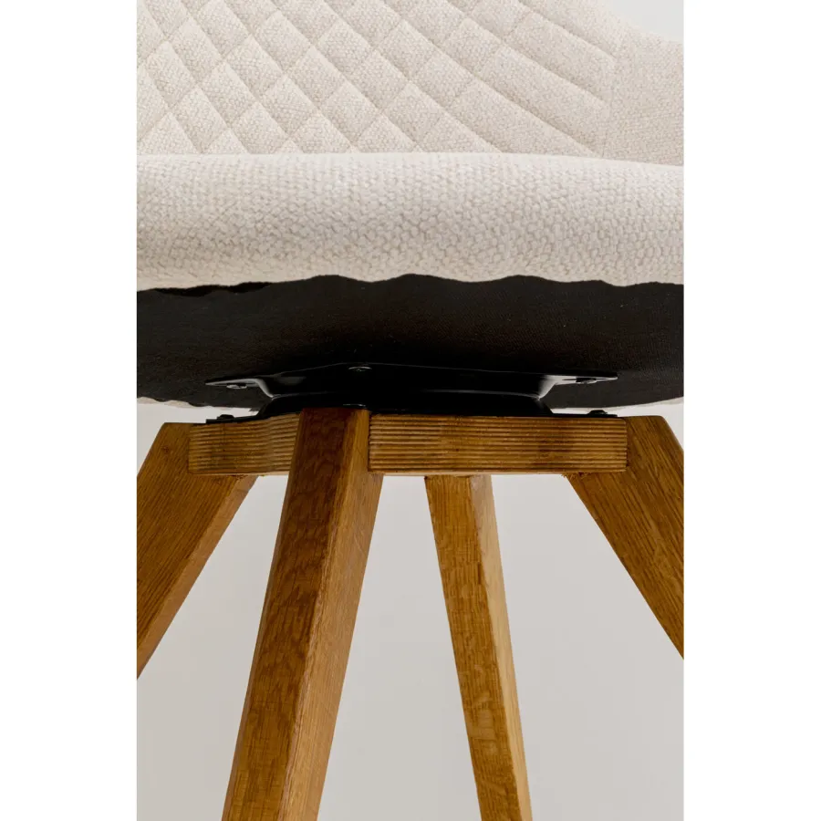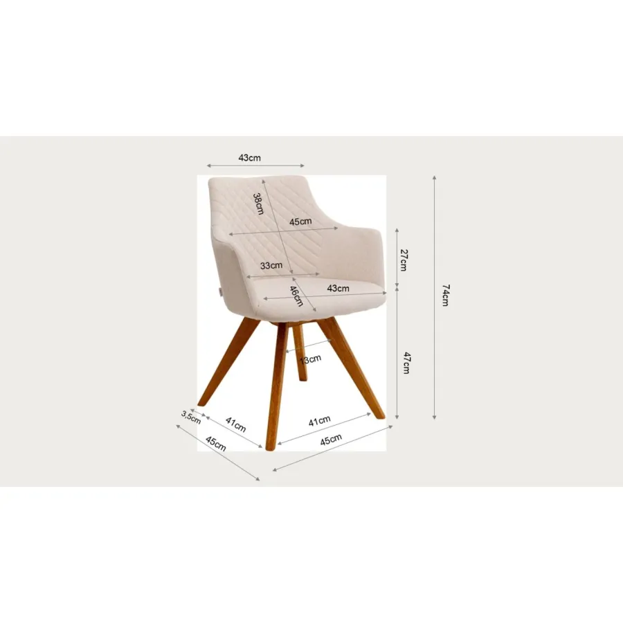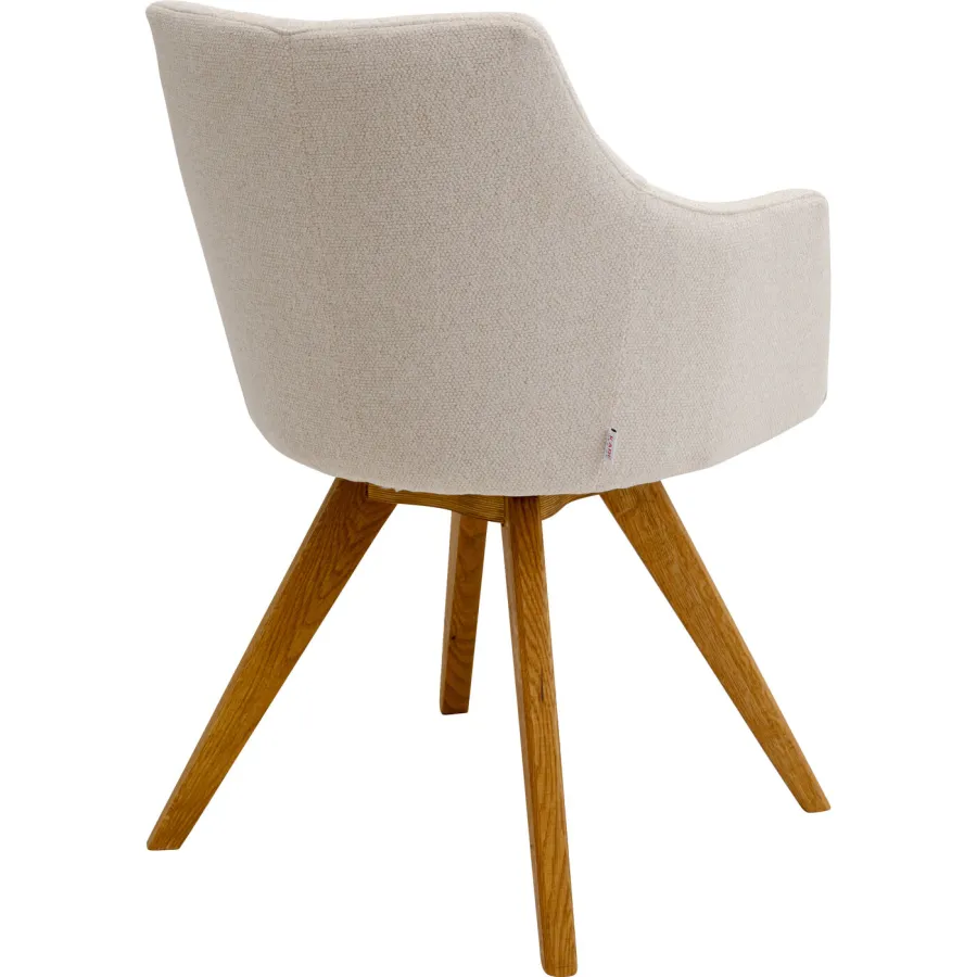 Ten obrotowy fotel w kolorze kremowo-białym zachwyca eleganckim, prostym wyglądem. Miękkie, szenilowe pokrycie w delikatnych kremowych odcieniach idealnie komponuje się z olejowaną, dębową ramą, tworząc przytulną atmosferę. Funkcja obrotowa i ergonomiczny kształt gwarantują wysoki komfort siedzenia i elastyczność. Idealny do nowoczesnych, skandynawskich lub minimalistycznych wnętrz, fotel ten doskonale wkomponuje się w stylowe biuro lub jadalnię, dodając ożywczych akcentów każdemu wnętrzu.