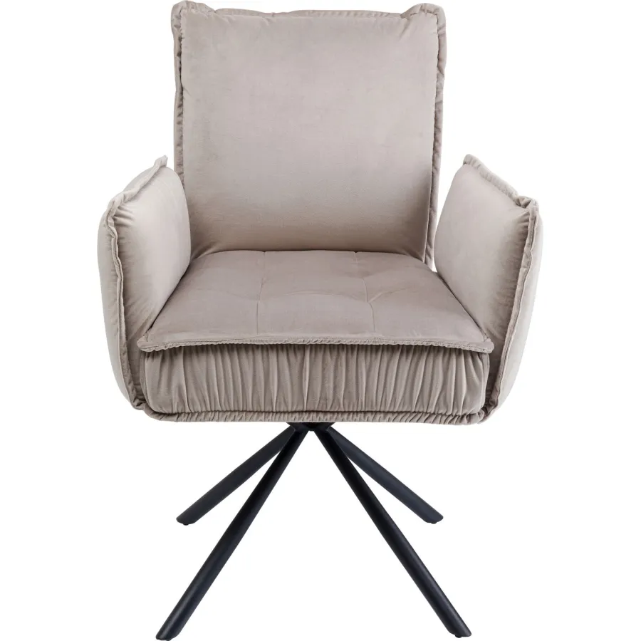 Nowoczesny design z nutą komfortu: ten pięknie wyprofilowany fotel obrotowy wnosi lekkość i styl do każdego wnętrza. Delikatnie wygięta sylwetka łączy się z ekscytującym kontrastem jasnego beżu i głębokiej czerni ramy – to styl łączący ponadczasową elegancję z miejskim charakterem. Dzięki sprytnej funkcji obrotowej fotel pozostaje elastyczny w każdej sytuacji, niezależnie od tego, czy chodzi o pracę twórczą, kolację, czy luźną pogawędkę. Miękka tapicerka zapewnia wygodne siedzenie z nutą stylu. Prezentuje się szczególnie elegancko w połączeniu ze szkłem, marmurem lub minimalistycznymi odcieniami drewna. Uniwersalny element dekoracyjny do nowoczesnych wnętrz z charakterem.