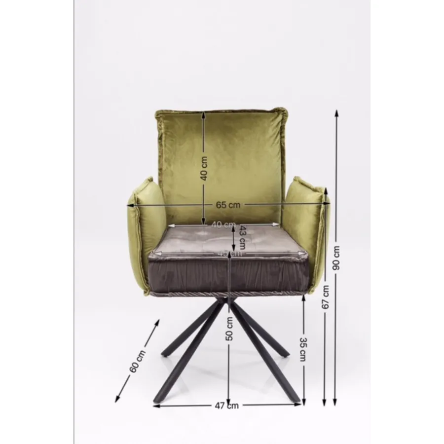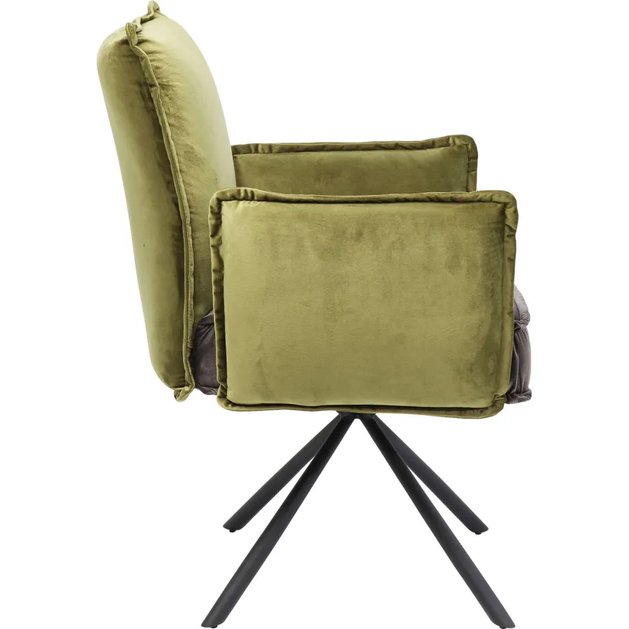 Charakterystyczną cechą tego krzesła są nogi w kształcie piramidy. Dzięki grubo tapicerowanemu siedzisku i podłokietnikom jest ono wyjątkowo przytulne i wygodne. Połączenie pistacjowej zieleni i szarego brązu jest eleganckie i emanuje spokojem. Fenomen: zarówno mężczyźni, jak i kobiety zakochują się w tym krześle
