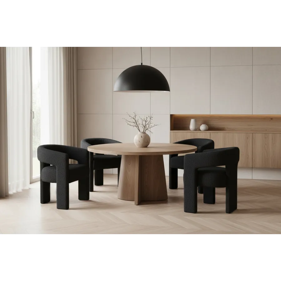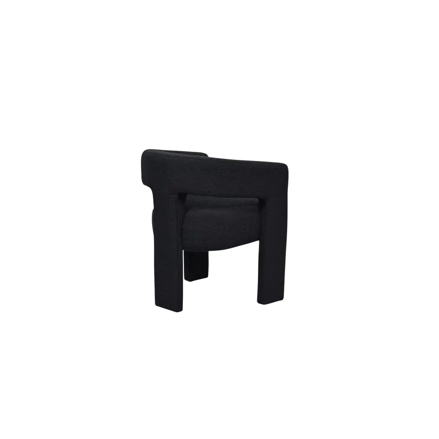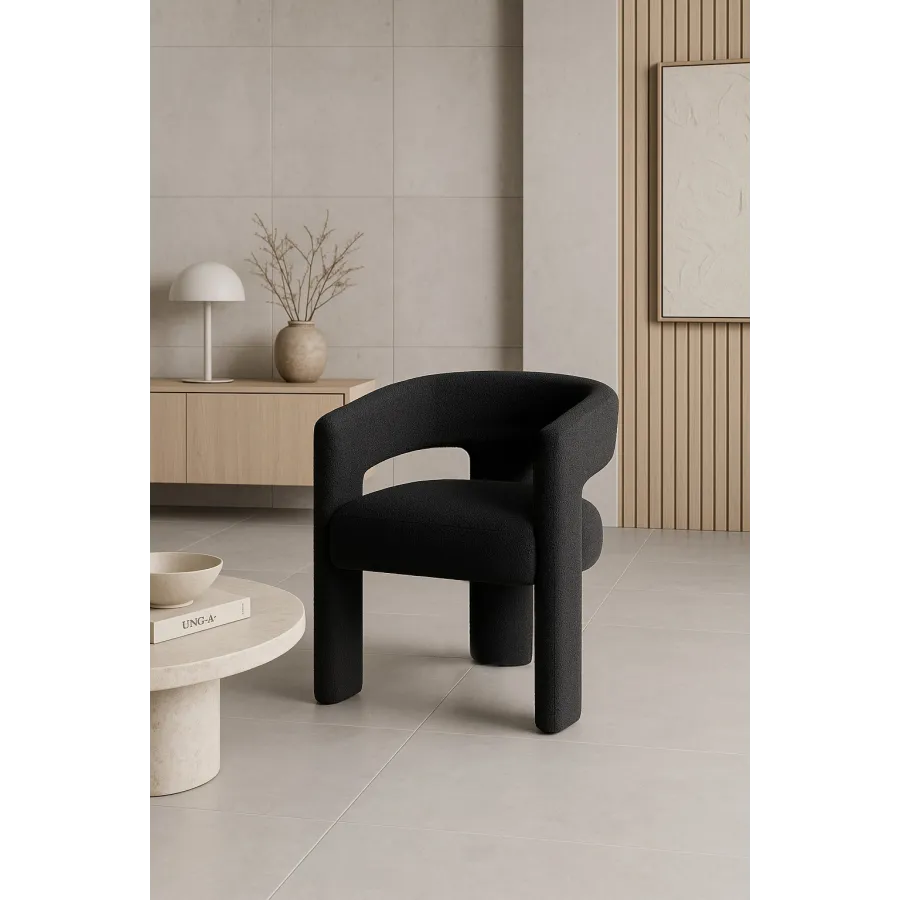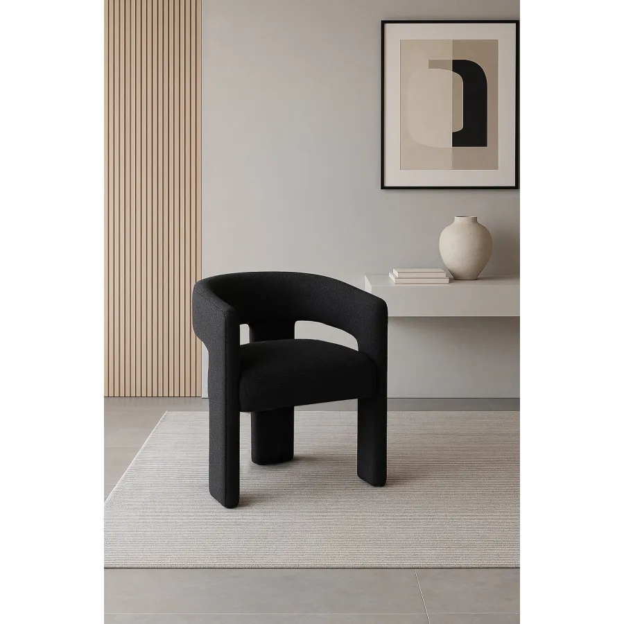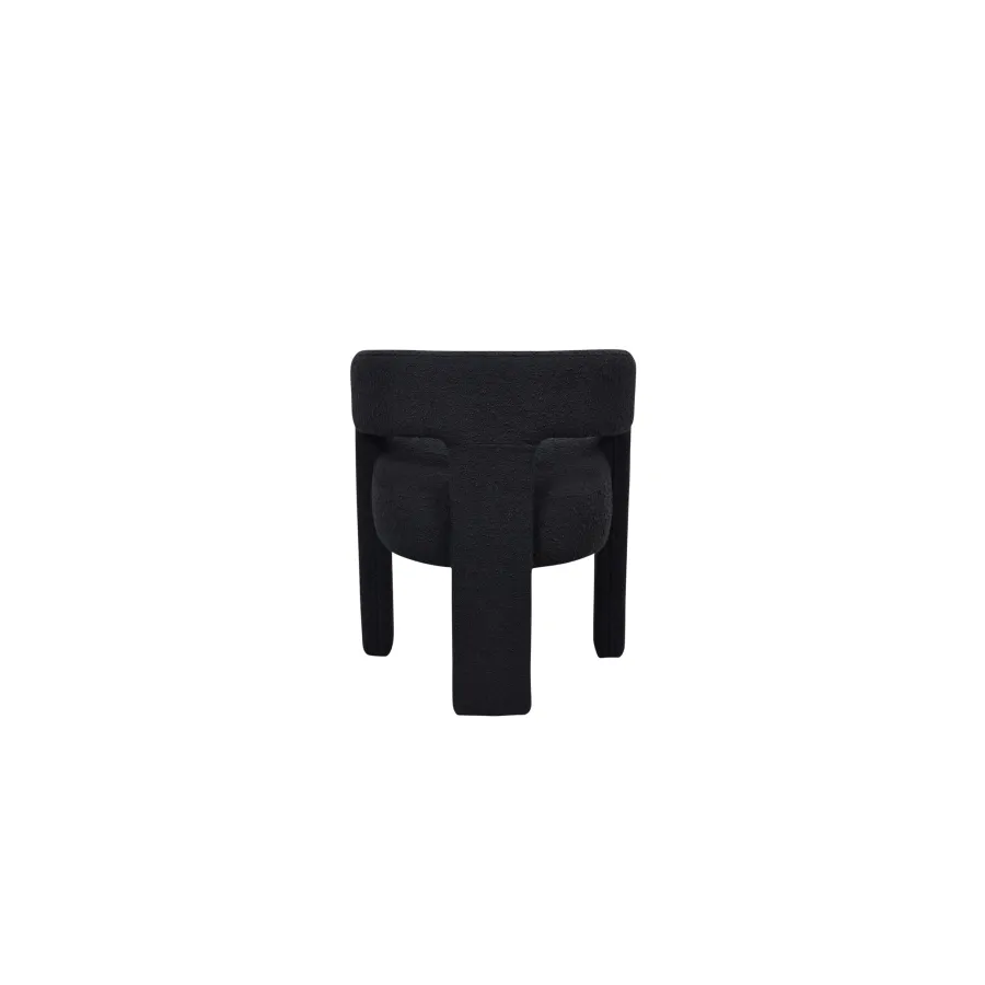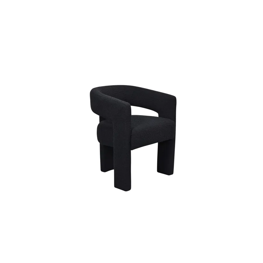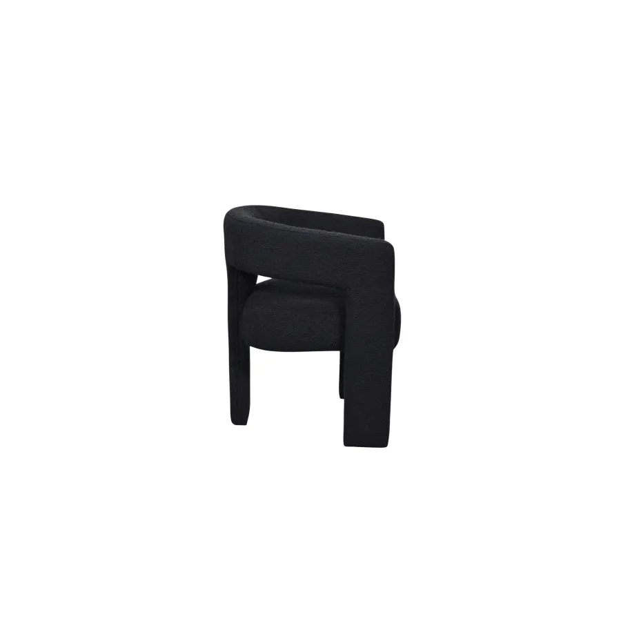 Eleganckie krzesło tapicerowane w kolorze głębokiej czerni wykonane z tkaniny boucle. Prosta forma mebla oparta na modnych obłych kształtach wzbogaci każdą jadalnię.