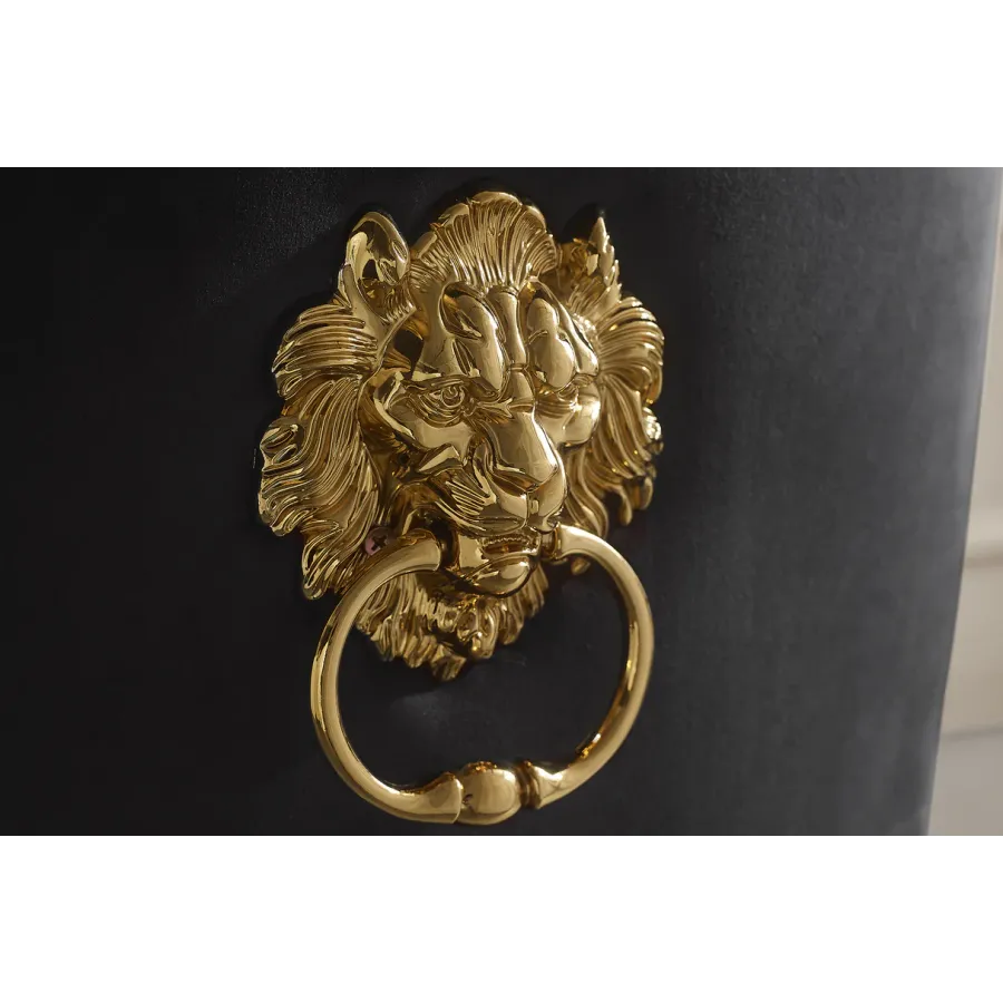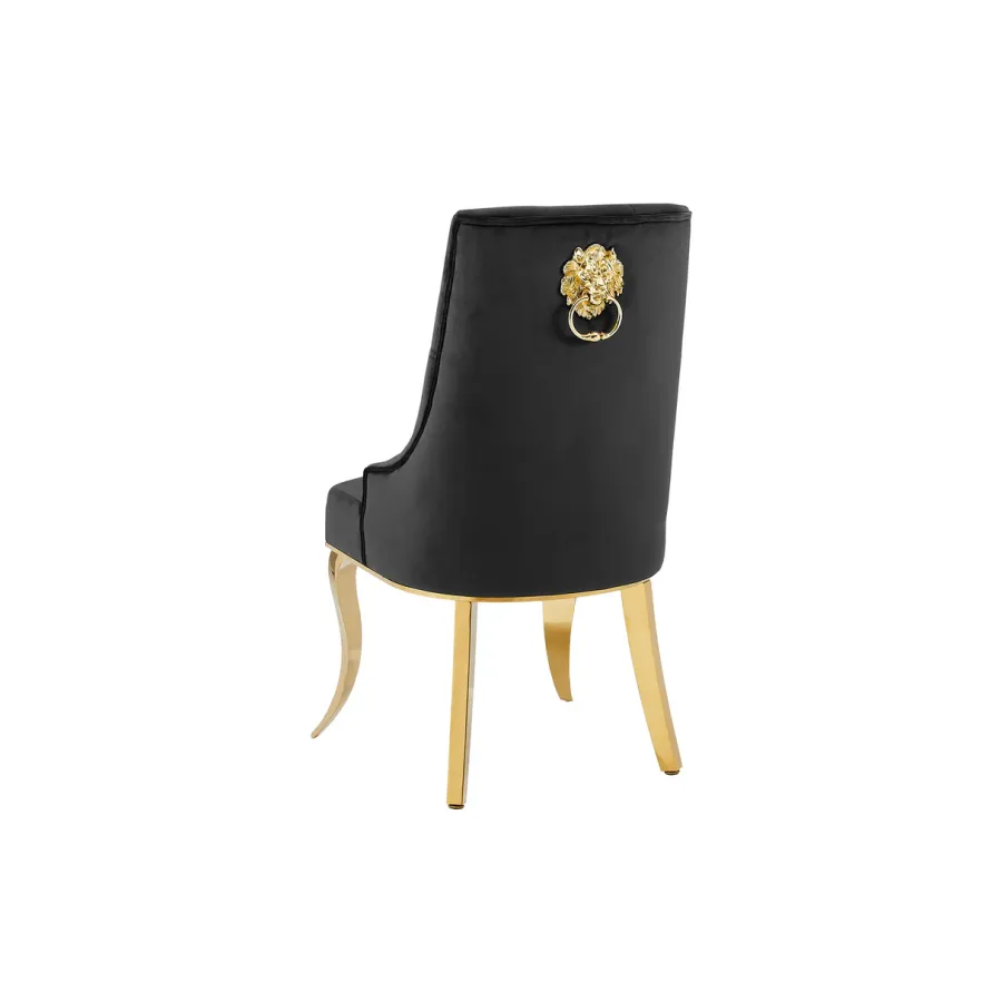 Eleganckie krzesła emanują pewną ekstrawagancją i można je wspaniale łączyć z różnymi stołami do jadalni. Szczególną atrakcją wzorniczą wygodnie tapicerowanego krzesła jest bez wątpienia srebrna głowa lwa z tyłu siedziska: trzyma ona w pysku ozdobny srebrny pierścień i emanuje dostojną elegancją.