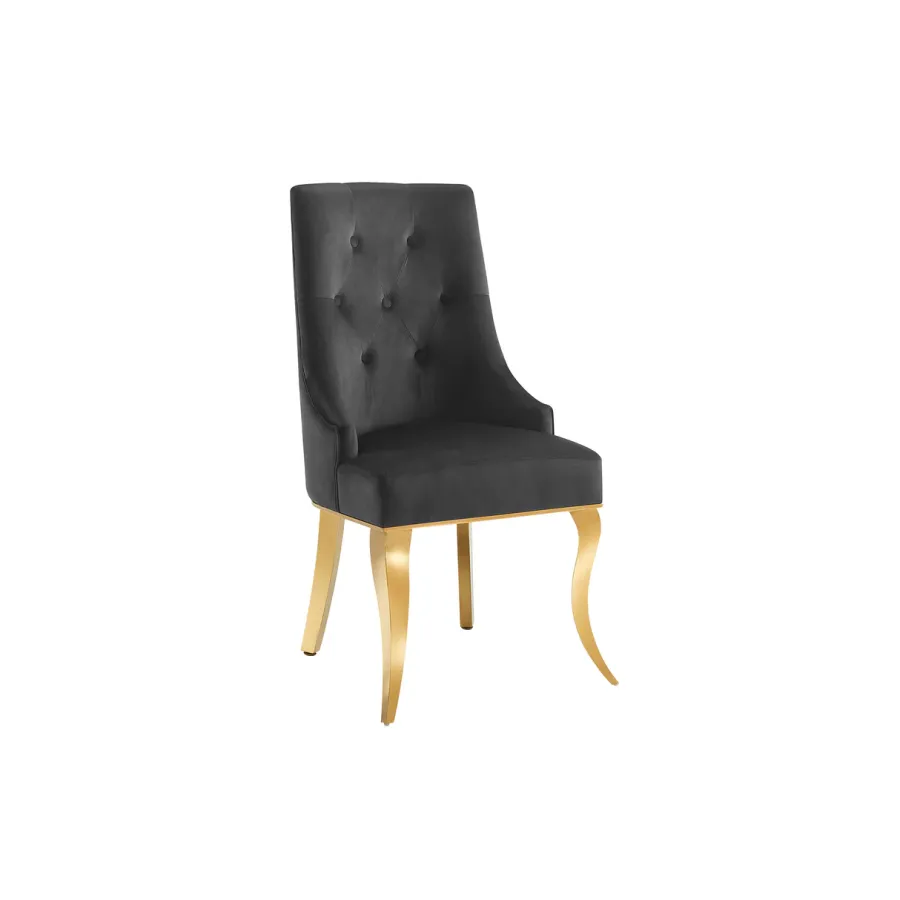 Odrobina luksusu w Twoim domu. Nasze wygodne krzesła z serii MODERN BAROCK łączą maksymalny komfort siedzenia z eleganckim designem. Wysokie oparcie i tapicerka zapewniają najwyższy komfort, a krzesło wyposażone jest również w piękne ozdobne guziki nawiązujące do znanego na całym świecie designu Chesterfield. Aksamitna osłona i zakrzywione srebrne nóżki nadają krzesłu ekskluzywny barokowy wygląd.