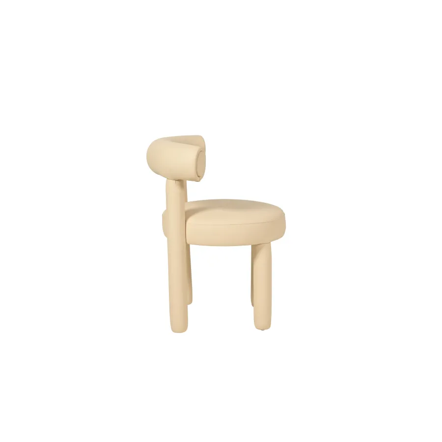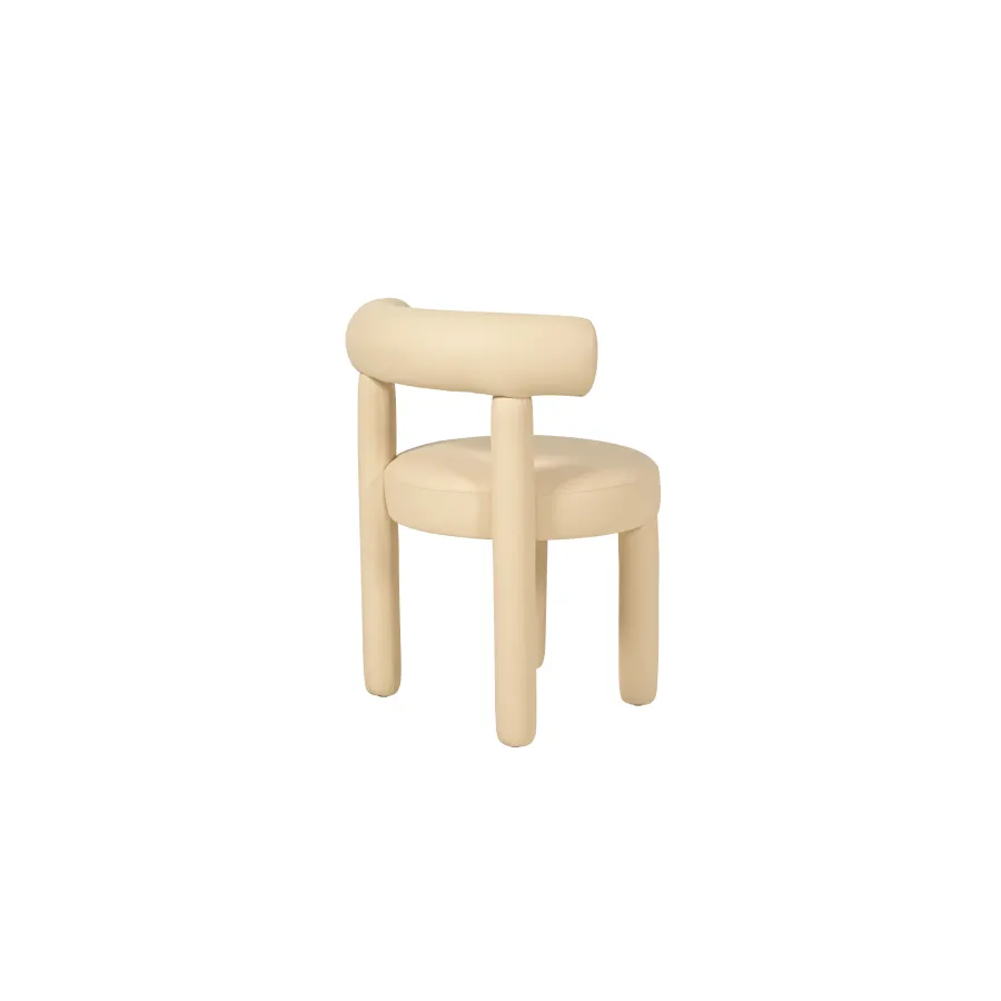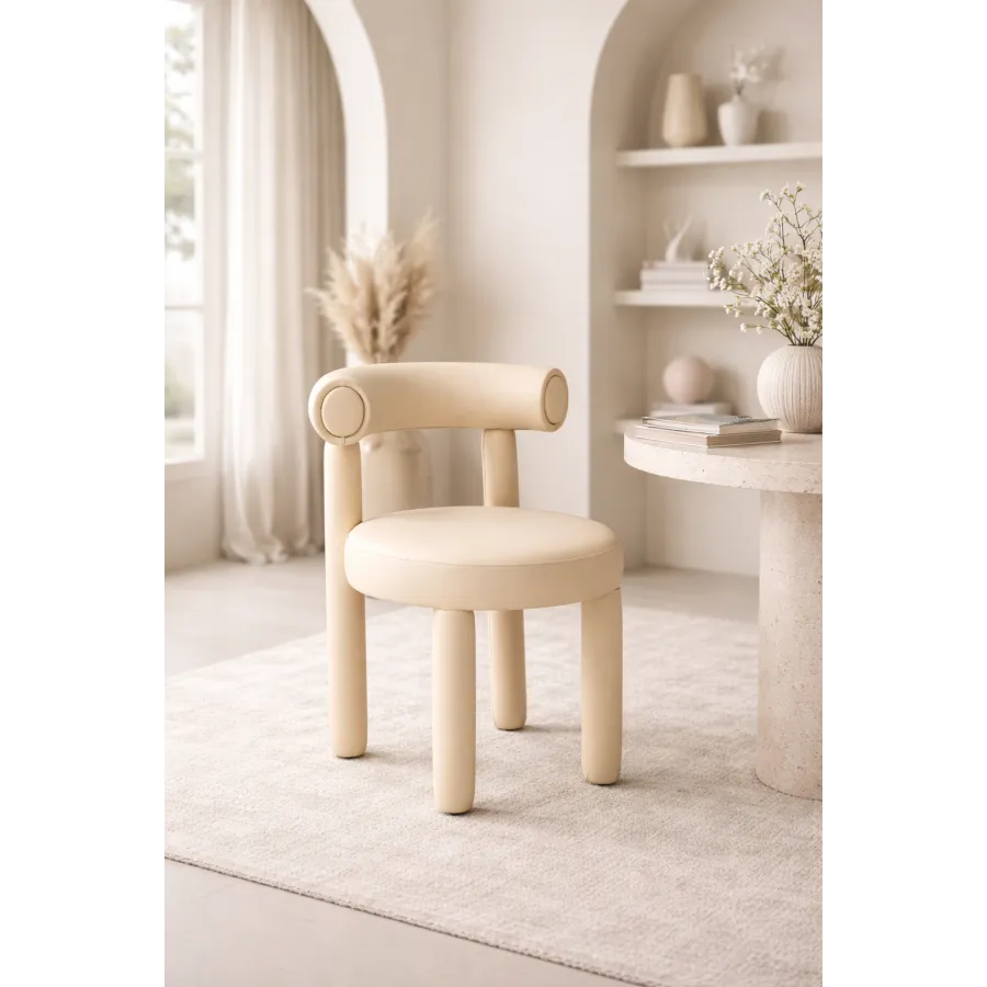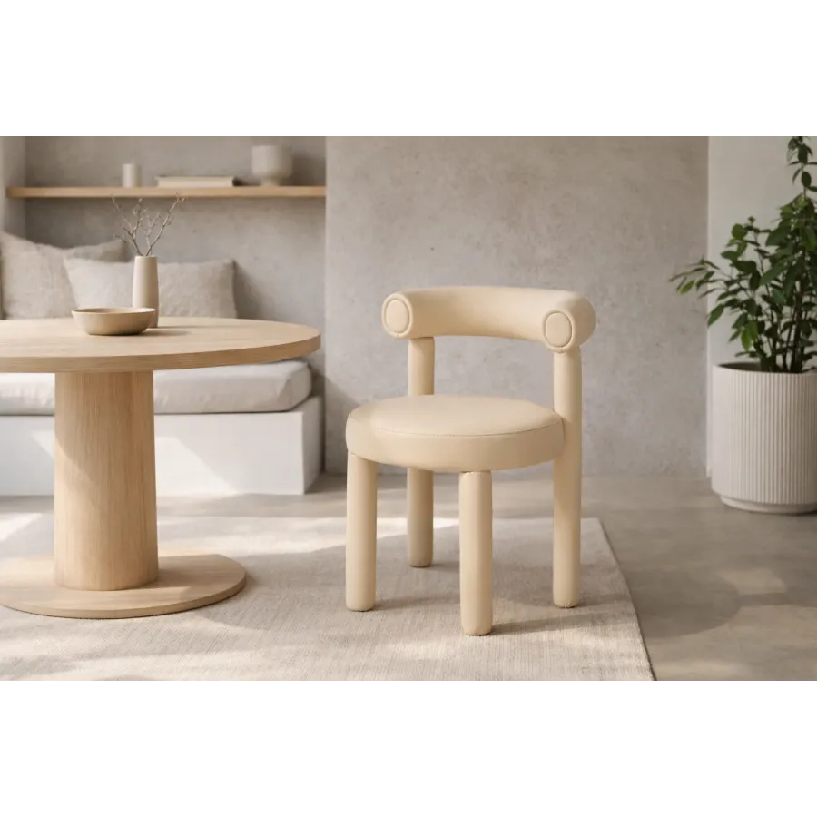 Nowoczesne krzesło tapicerowane w kolorze kremowym wykonane z ekoskóry. Prosta forma oparta jest na modnych obłych kształtach a konstrukcja jest w pełni pokryta materiałem.