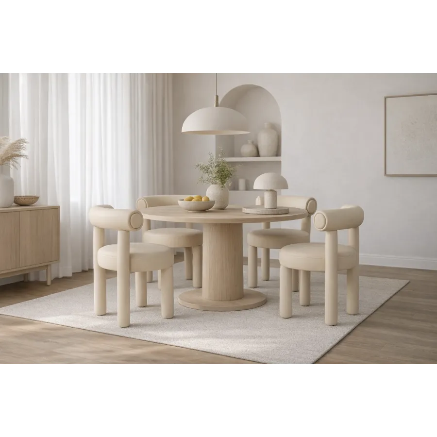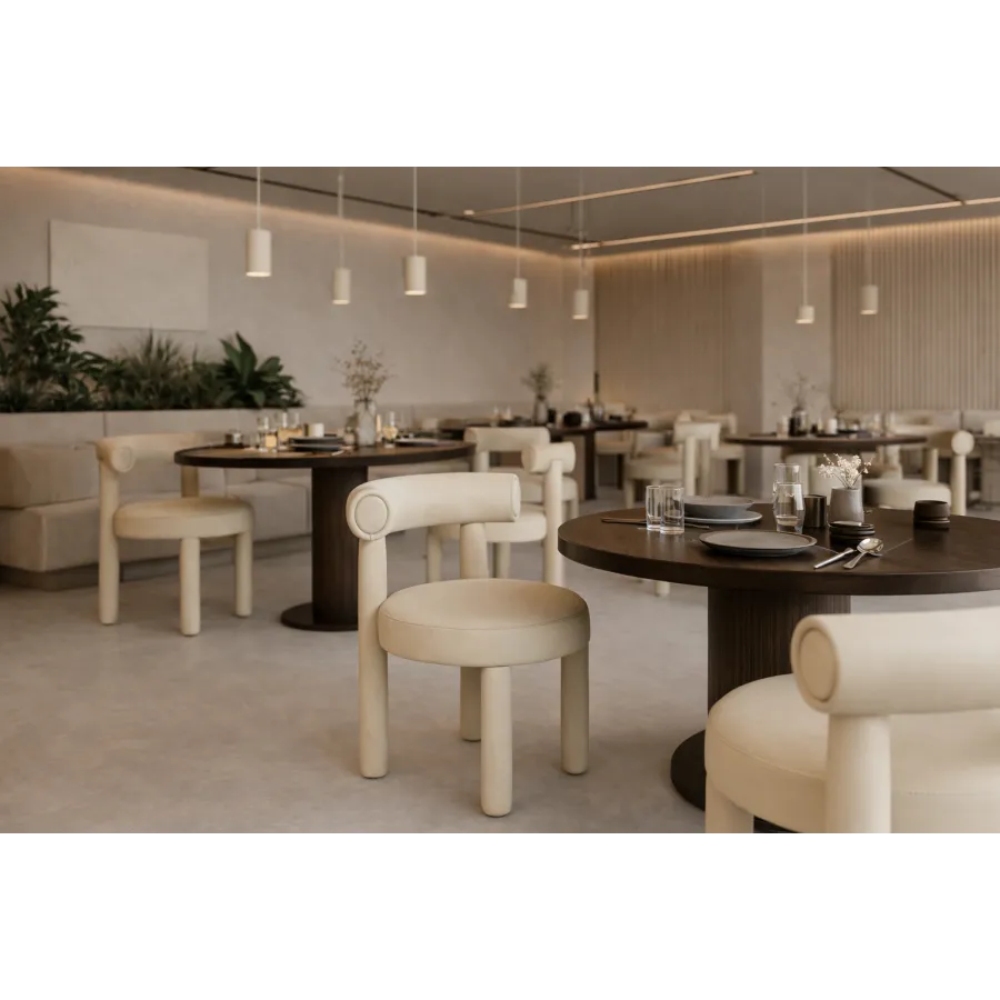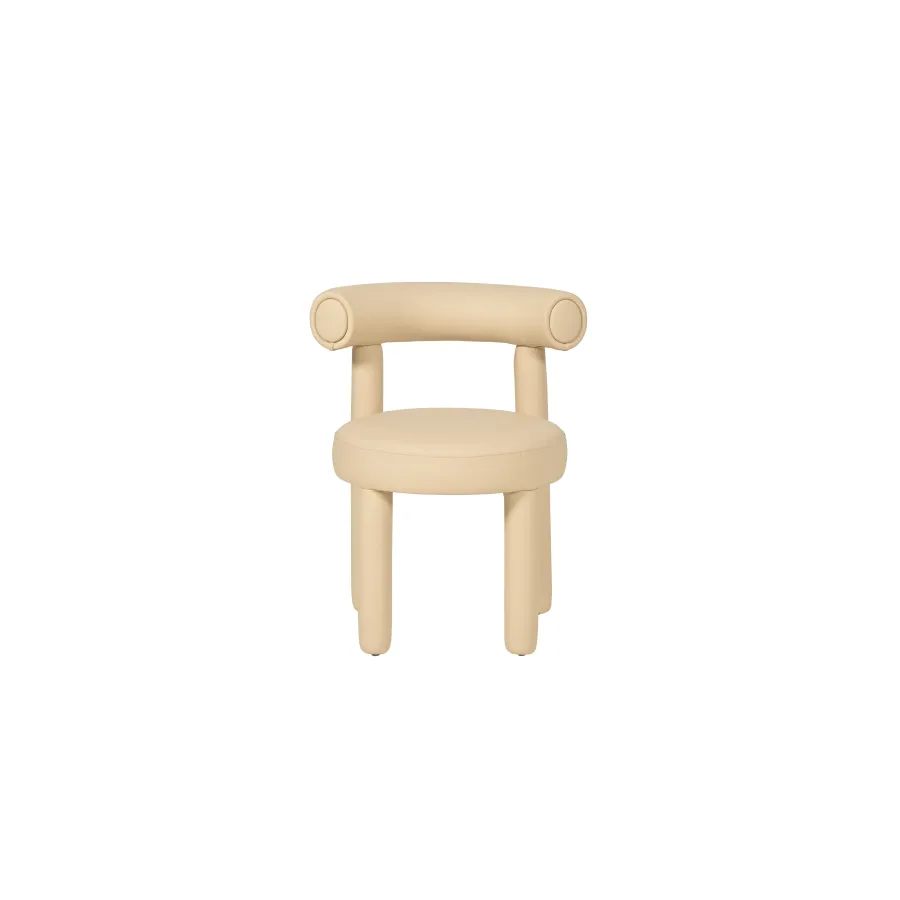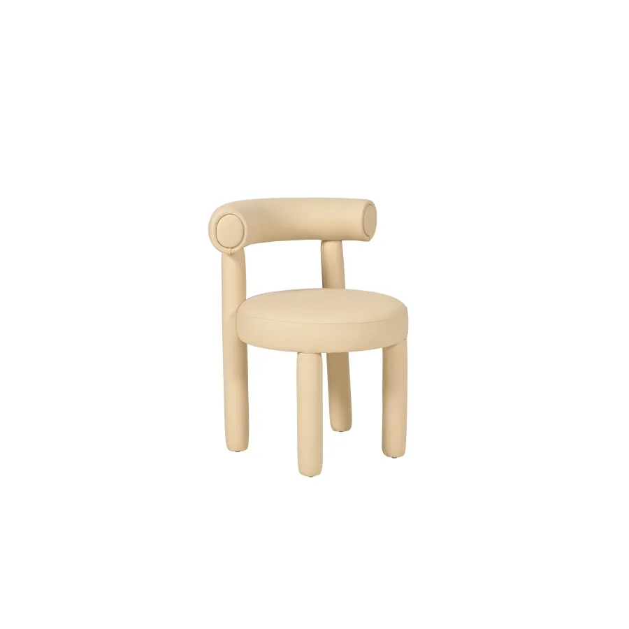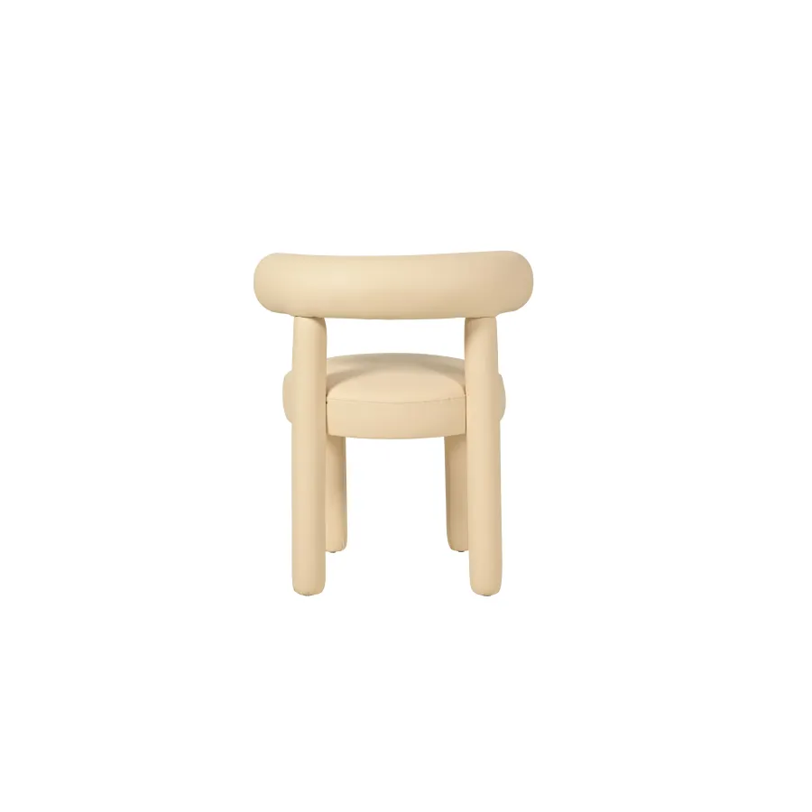 Nowoczesne krzesło tapicerowane w kolorze kremowym wykonane z ekoskóry. Prosta forma oparta jest na modnych obłych kształtach a konstrukcja jest w pełni pokryta materiałem.