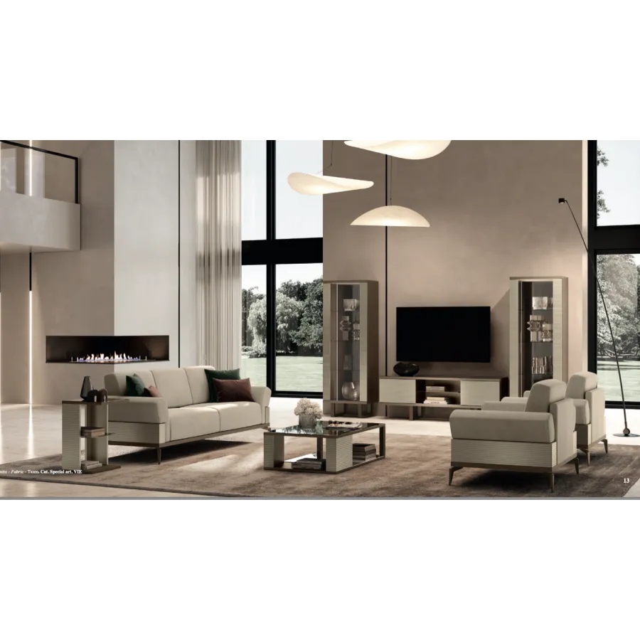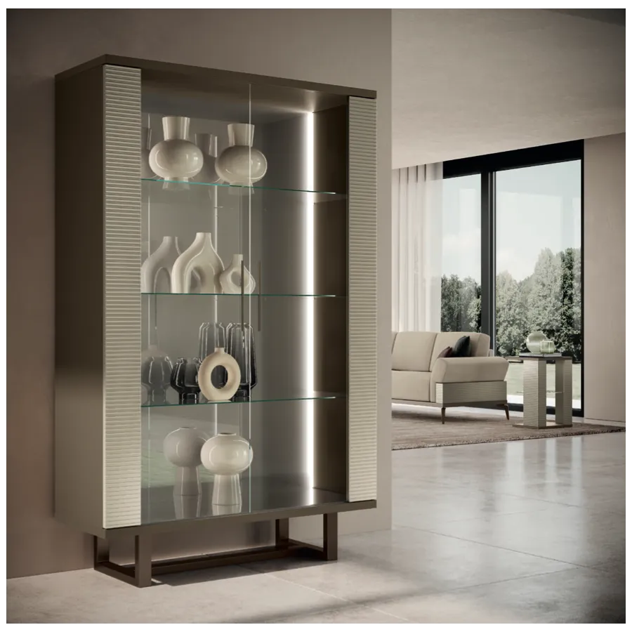 Kontrast chromatyczny i materiałowy pomiędzy matową konstrukcją a szampańskim, żebrowanym wykończeniem frontów nadaje całości wyjątkowego charakteru i podkreśla wyrafinowaną formę mebli.
