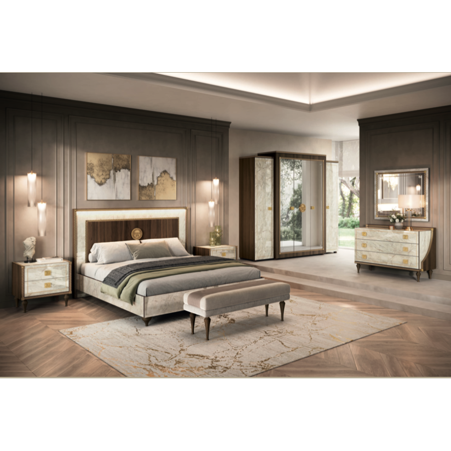 Strona wykończona drewnem orzechowym obejmuje wewnętrzną strukturę wykończoną błyszczącym marmurem z Carrary, ożywiając wyrafinowaną kombinację kolorów, ozdobioną neoklasycznymi greckimi progami ze złotym wykończeniem. Skrupulatna dbałość o detale sprawia, że ​​witryna jest głównym bohaterem salonu. Kryształy, szklane drzwi, lustrzany panel tylny i 24-karatowe platerowane uchwyty tworzą nieoczekiwane odblaski i wyrafinowaną grę światła.