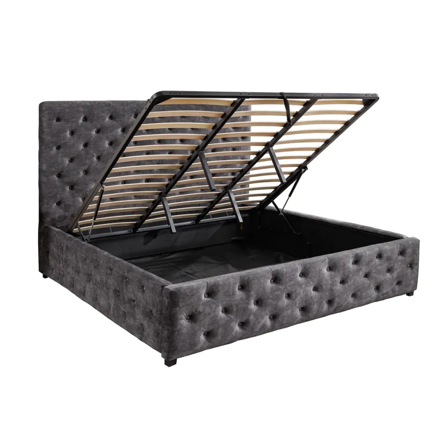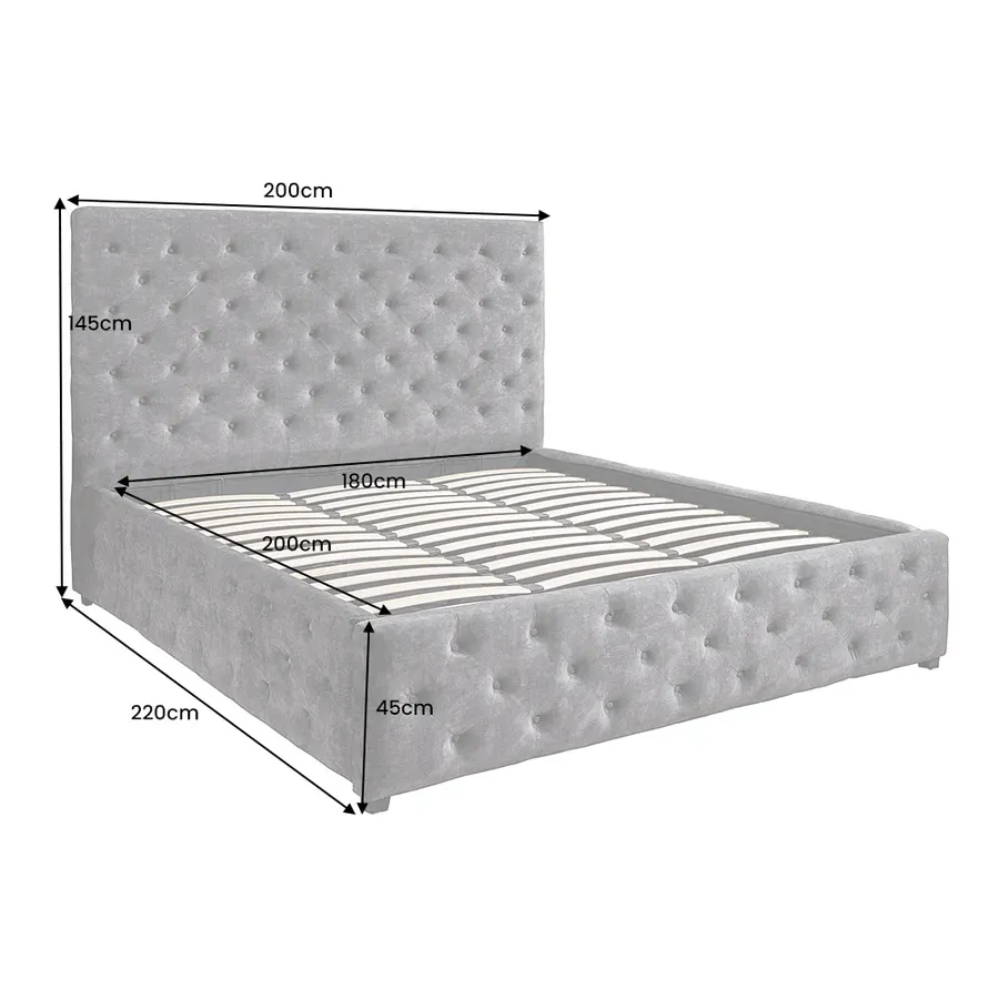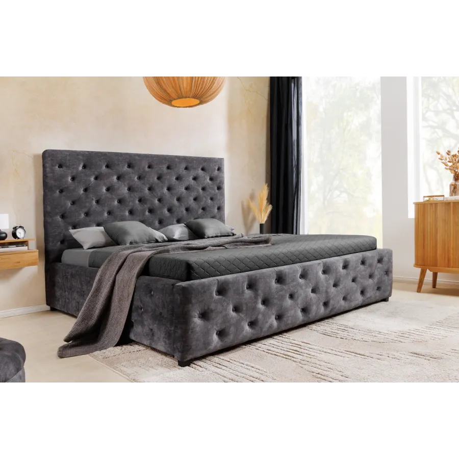 To wyjątkowe łóżko skrzyniowe zachwyca miękkim, aksamitnym obiciem w odcieniu szampańskiego beżu czy szarości oraz klasycznym pikowaniem w stylu Chesterfield, które nadaje mu ponadczasowy urok i szyk.