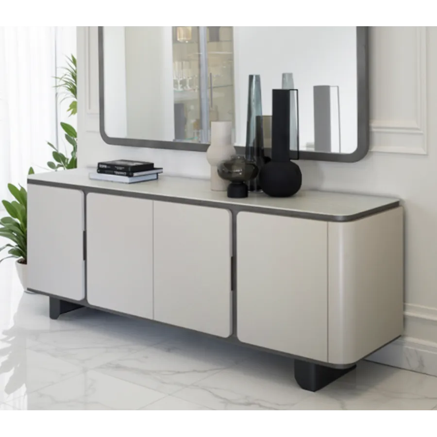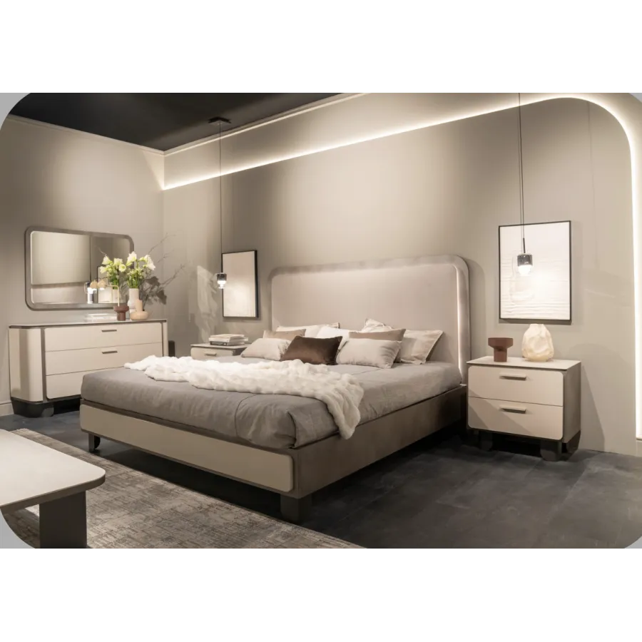 Komoda z dużym lustrem oraz szafki nocne zintegrowane stylistycznie z łóżkiem tworzą spójną kompozycję, która wpisuje się w estetykę nowoczesnego luksusu. Gładkie powierzchnie, miękkie krawędzie, minimalistyczne uchwyty i delikatne nóżki czynią tę sypialnię zarówno piękną, jak i praktyczną.