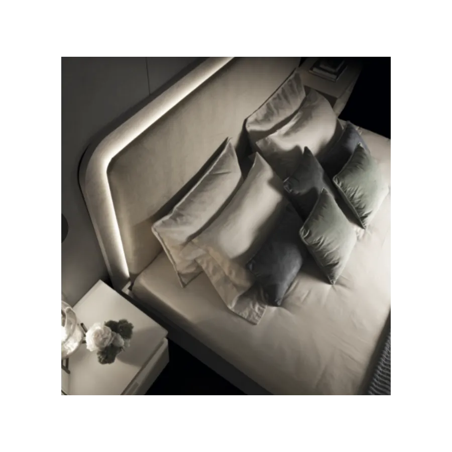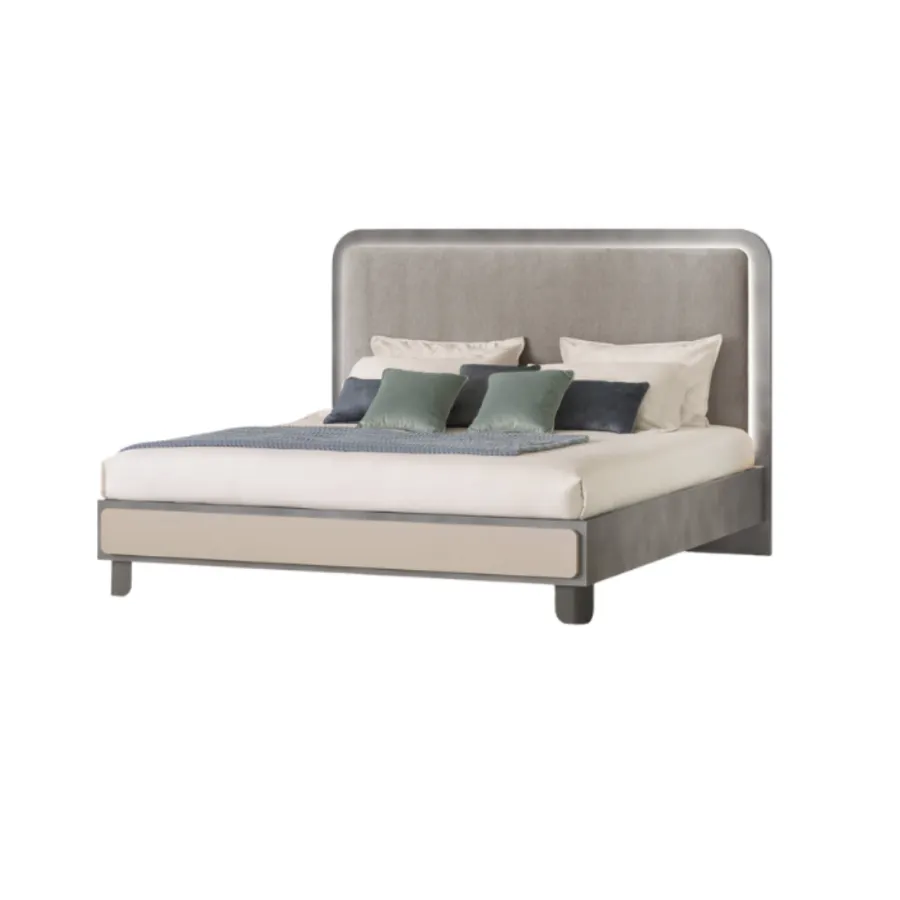 Centralnym punktem kolekcji jest tapicerowane łóżko z wysokim, miękkim zagłówkiem o zaokrąglonych liniach. Wbudowane oświetlenie LED tworzy nastrojowe światło sprzyjające relaksowi, a neutralna paleta kolorów – beże, szarości i taupe – wprowadza do wnętrza kojący balans.