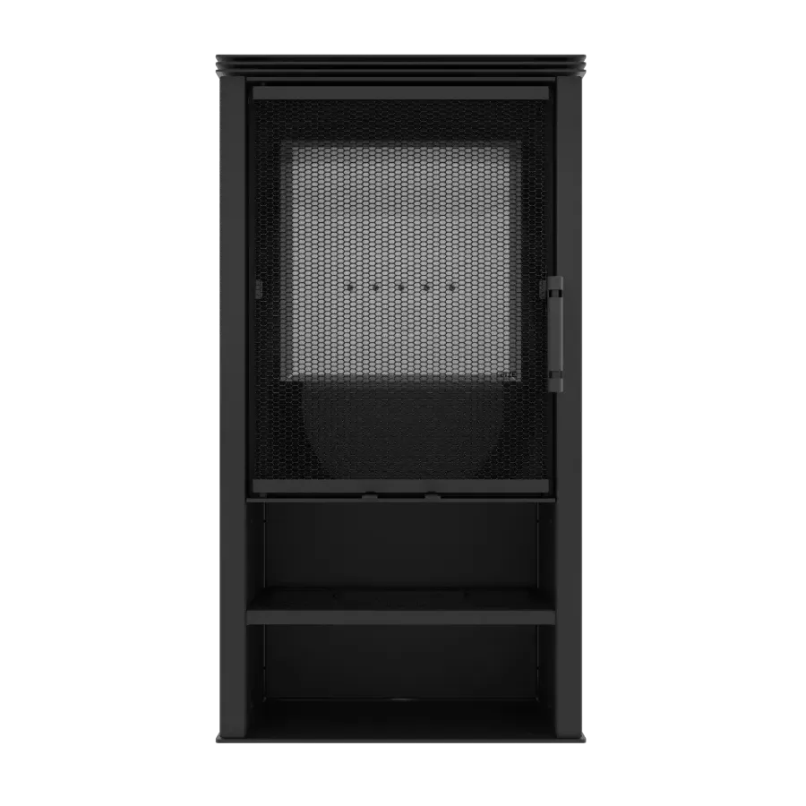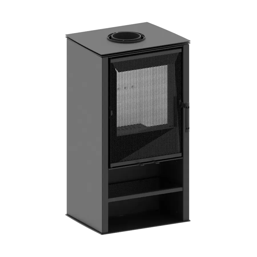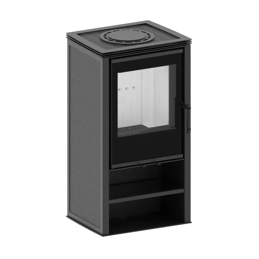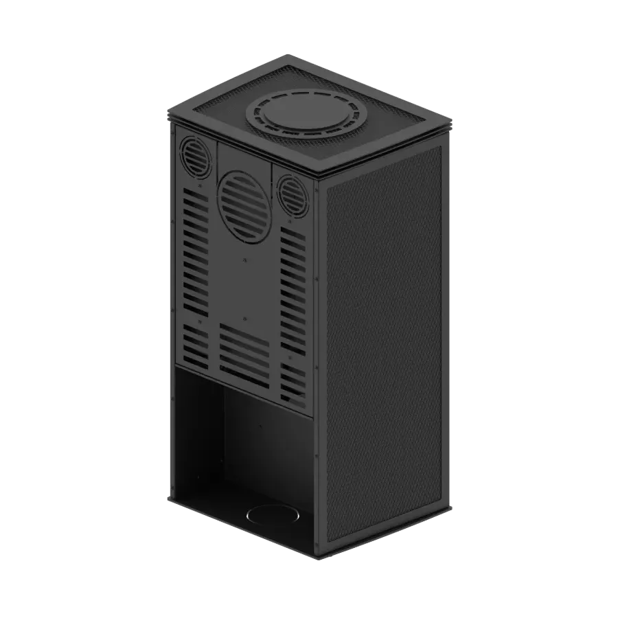 Największą zaletą tego modelu jest możliwość personalizacji wyglądu obudowy. Dzięki wymiennym panelom z perforowanej stali dopasujesz styl pieca do swojego wnętrza — możesz zastosować ażurowe wykończenie na froncie, bokach, górze lub stworzyć własną kombinację.
