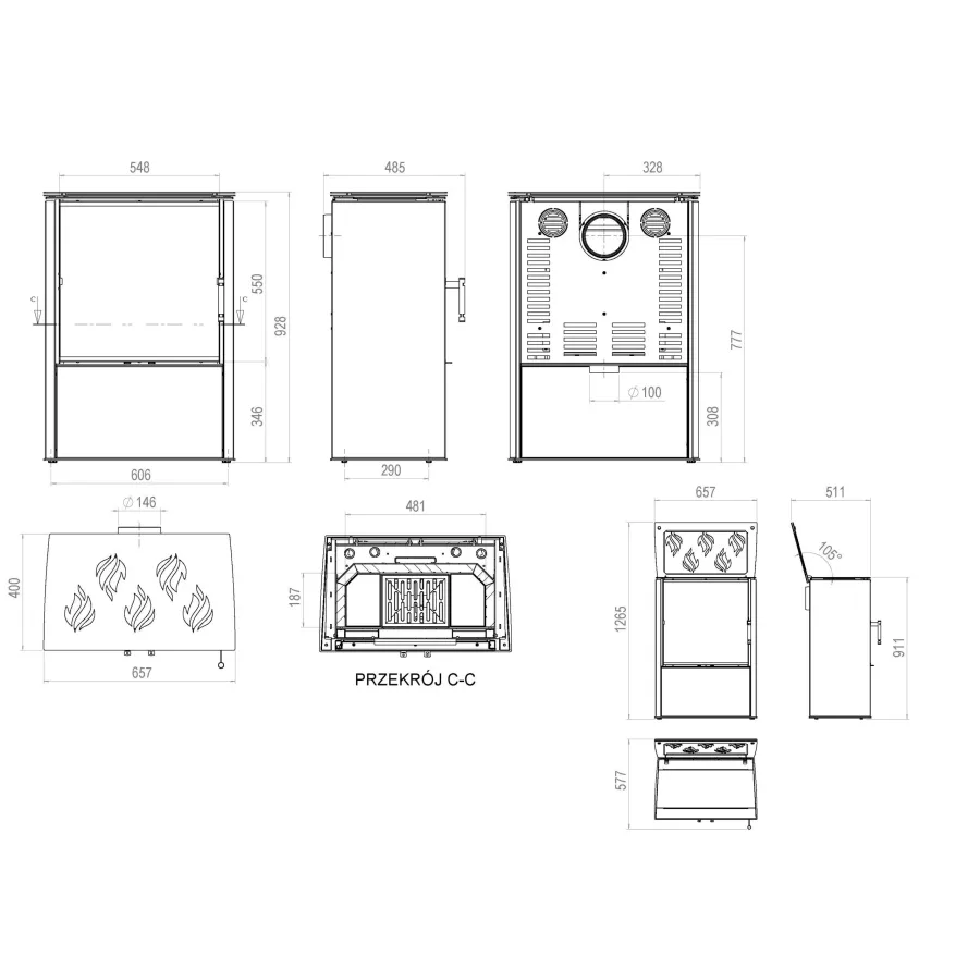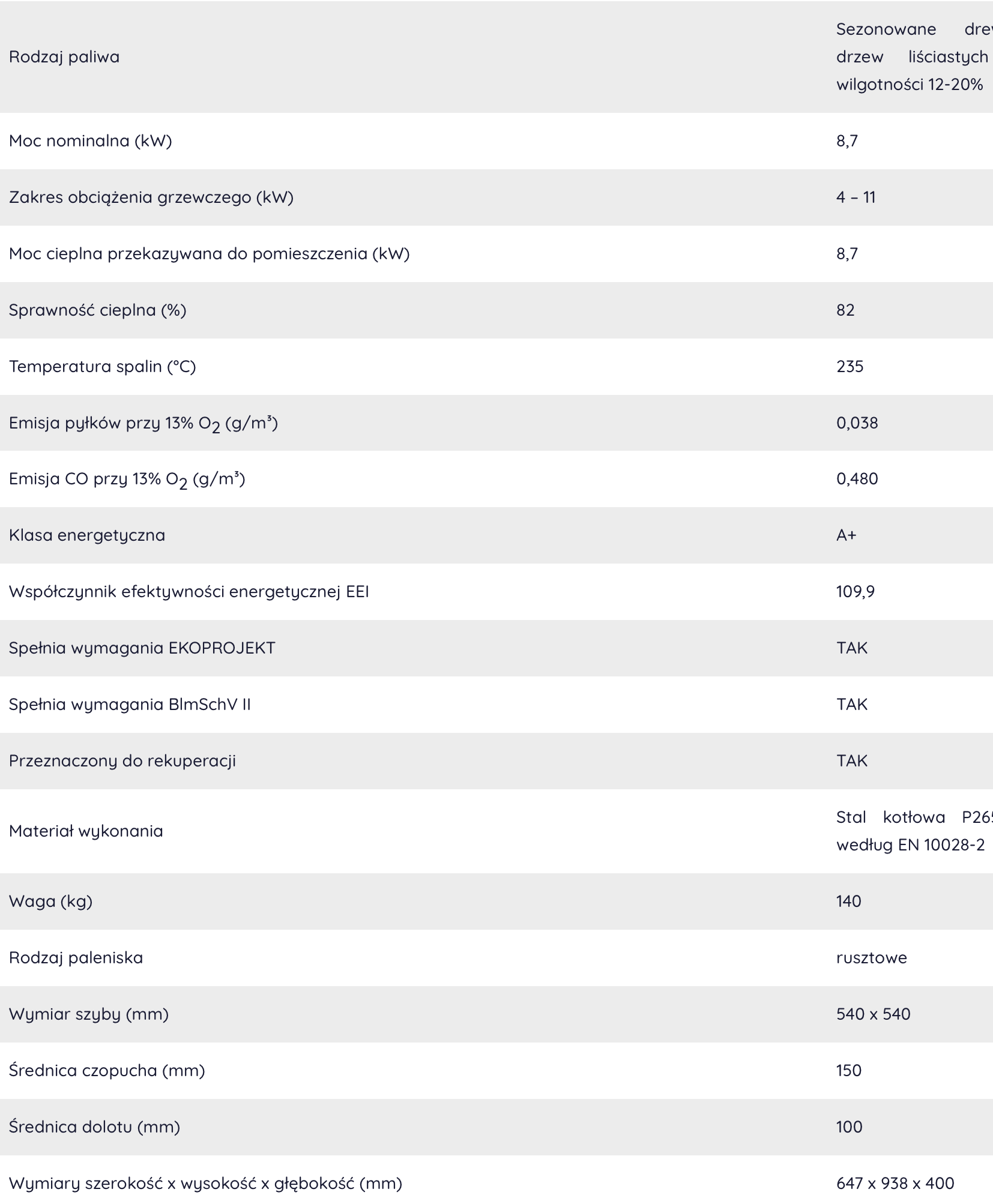 Dodatkowo piec wyposażono w ceramiczny deflektor oraz wydłużony kanał dymowy, co zwiększa wymianę cieplną.