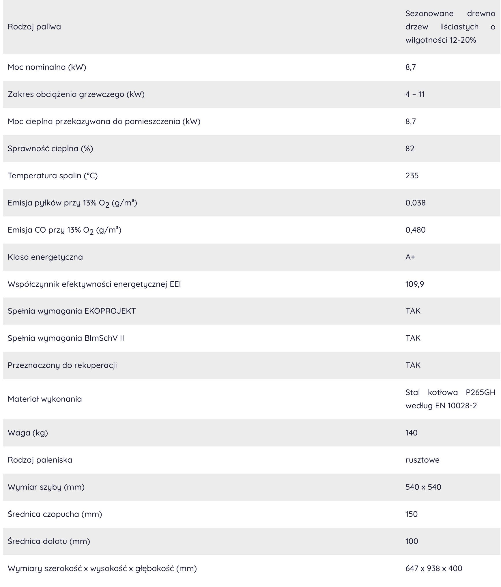 Dodatkowo piec wyposażono w ceramiczny deflektor oraz wydłużony kanał dymowy, co zwiększa wymianę cieplną.