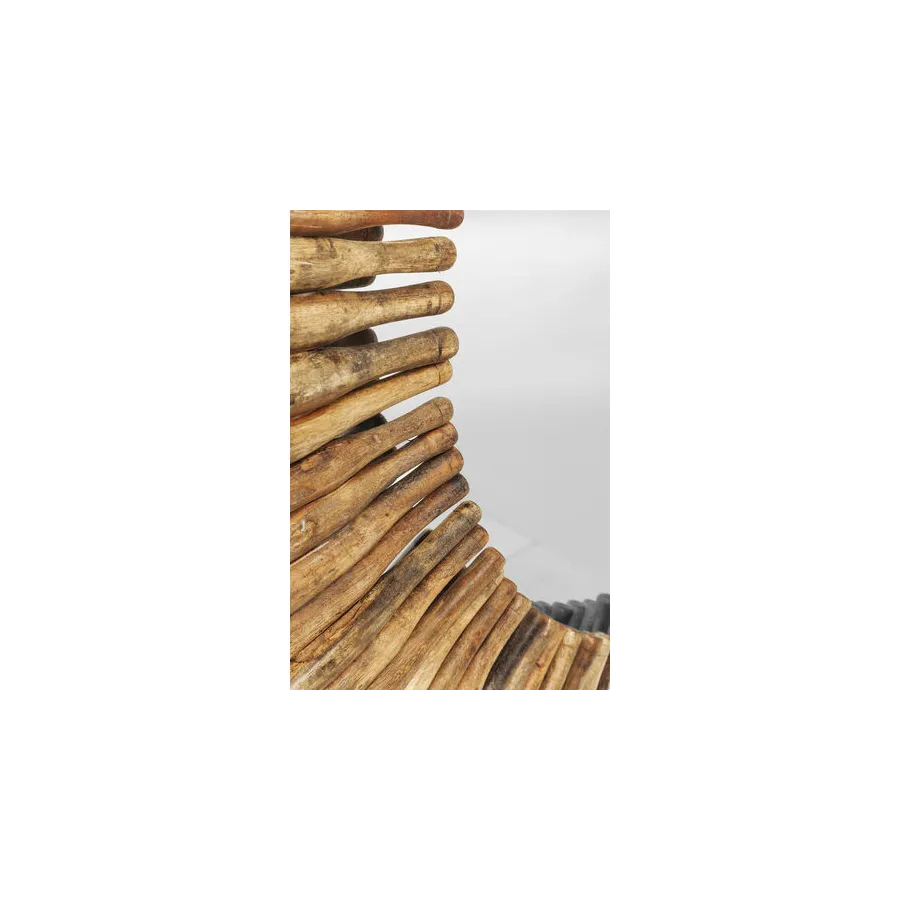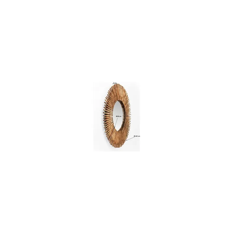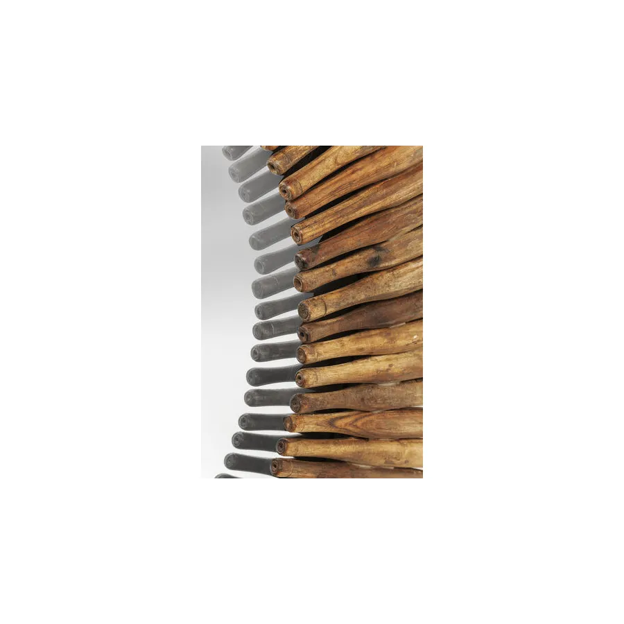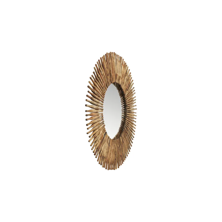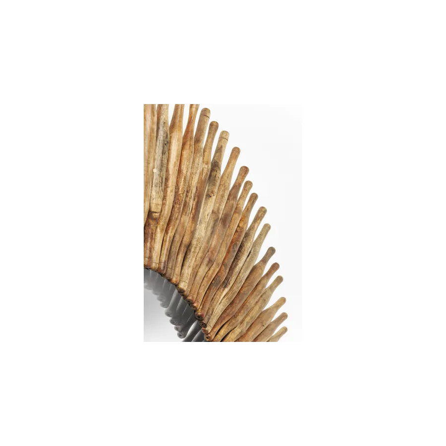 Od kija do lustrzanego odbicia. To oryginalne lustro dekoracyjne otoczone jest drewnianymi elementami. Czysta natura z usłojeniem i nierównym, zniszczonym wyglądem. Ładny dodatek do przedpokoju lub salonu.