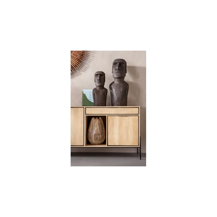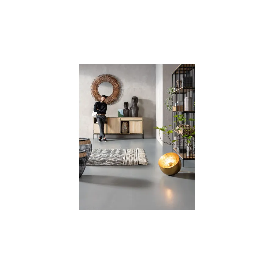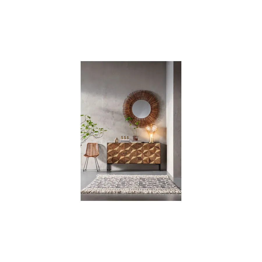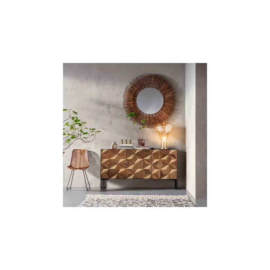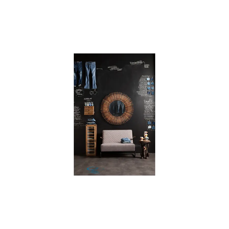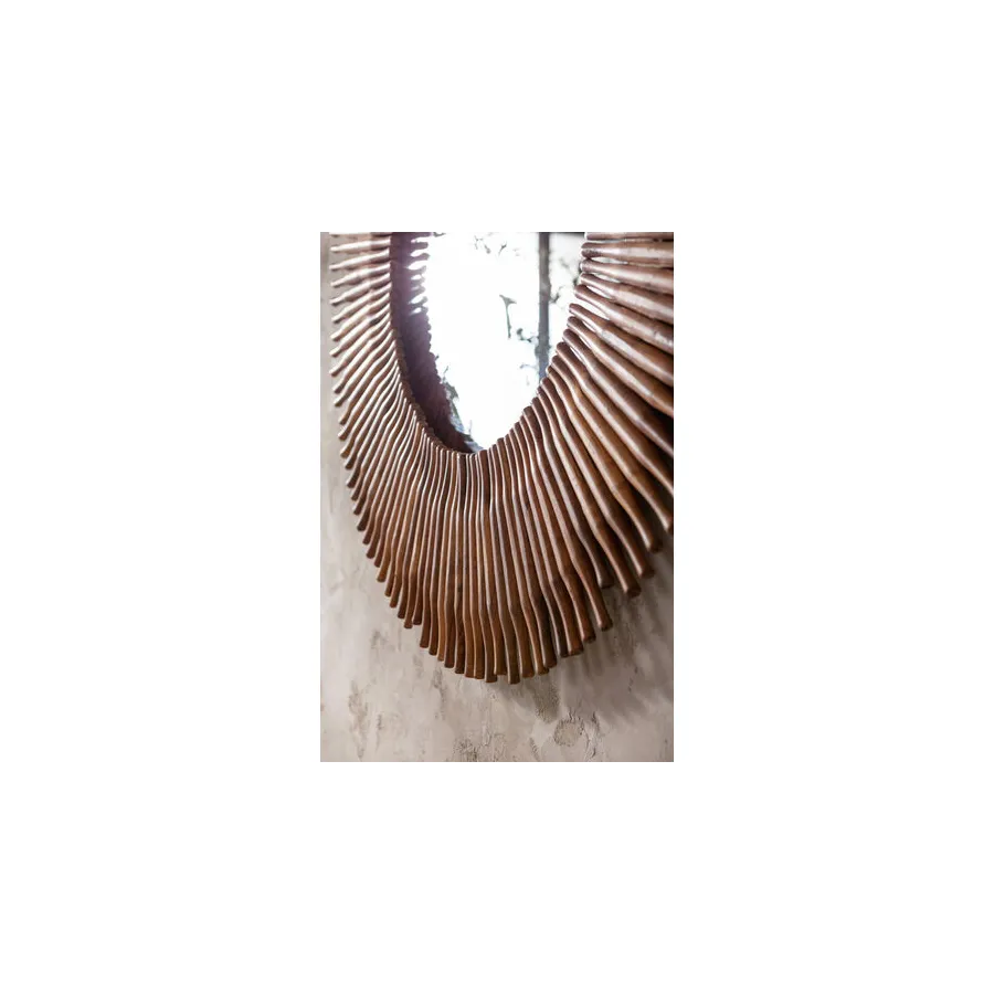 Od kija do lustrzanego odbicia. To oryginalne lustro dekoracyjne otoczone jest drewnianymi elementami. Czysta natura z usłojeniem i nierównym, zniszczonym wyglądem. Ładny dodatek do przedpokoju lub salonu.