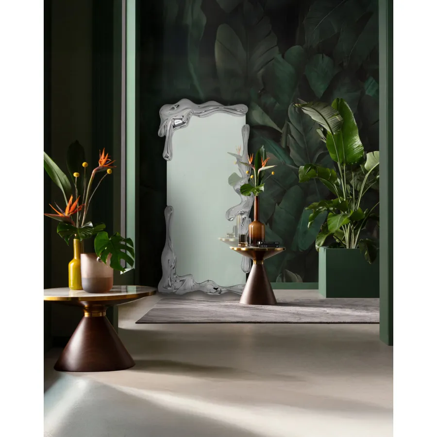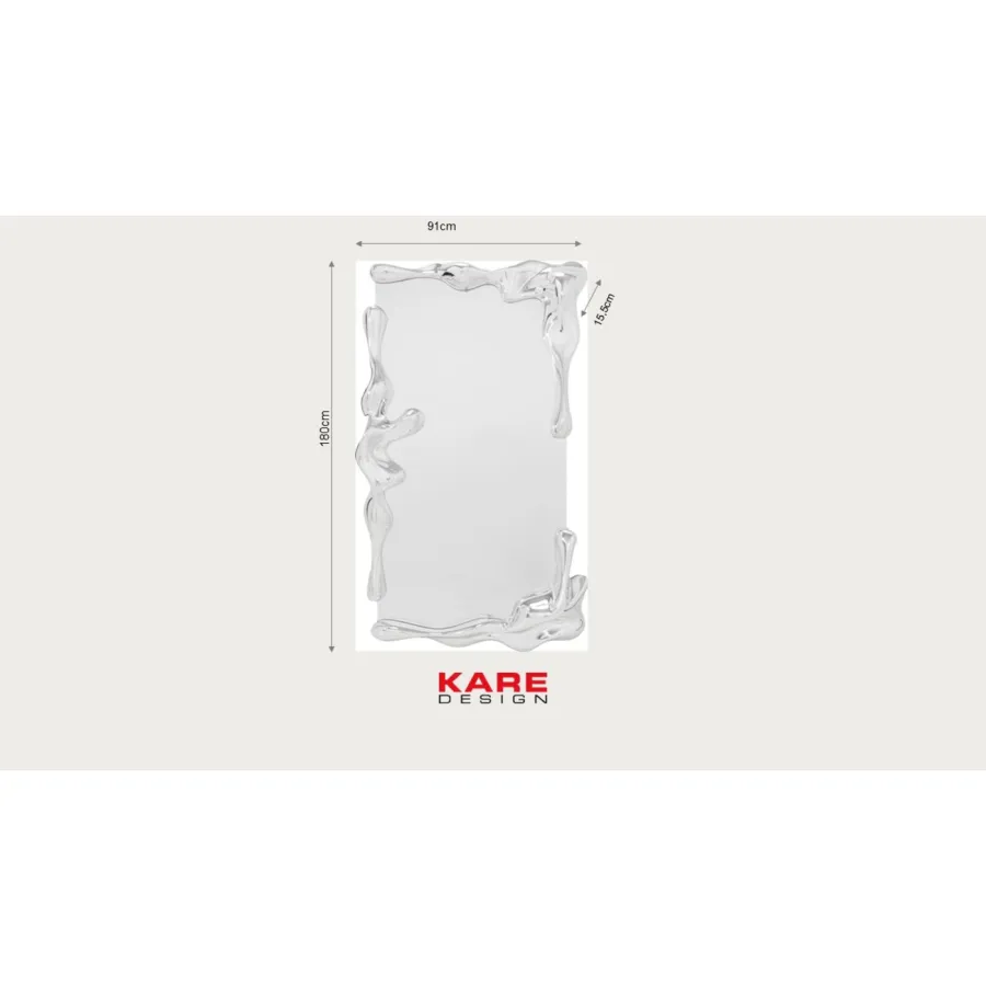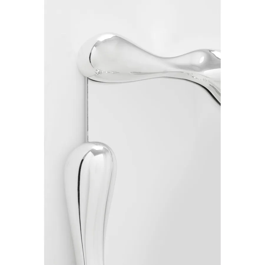 Lustro, które przyciąga wzrok: to lustro ścienne ze złotymi detalami sprawi, że każda ściana stanie się ozdobą, a pomieszczenia będą wyglądać na większe i jaśniejsze. Jego nietypowa rama o płynnej, lśniącej srebrnej strukturze przywodzi na myśl płynny metal i tworzy ekscytujący kontrast z czystą powierzchnią lustra. Artystyczny design nadaje salonom, sypialniom i korytarzom luksusowy, awangardowy charakter. Oparte o ścianę i solidnie zamocowane, lustro robi wrażenie swoim rozmiarem i kształtem. Starannie wykonane ręcznie, każde lustro jest unikatowe. Projekt prezentuje się szczególnie harmonijnie w chłodnych odcieniach szarości, białym marmurze lub nowoczesnych akcentach w kolorze czarnym i chromie.