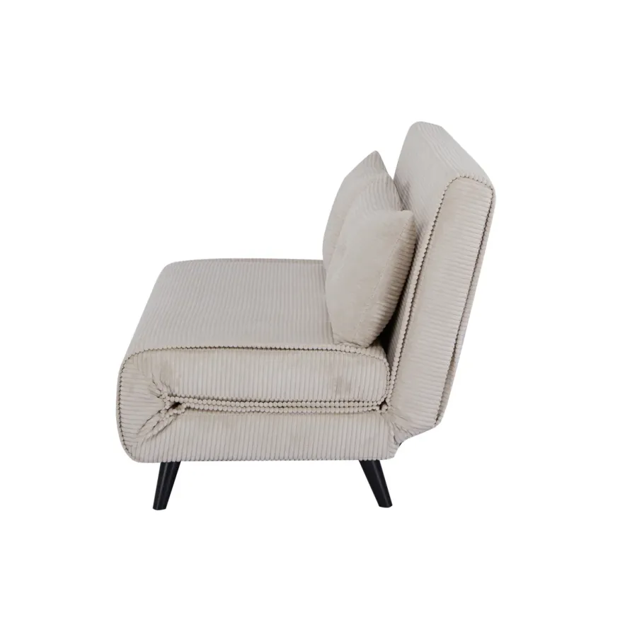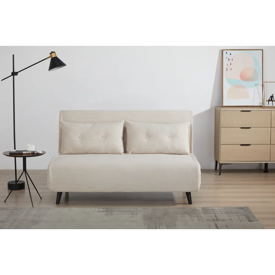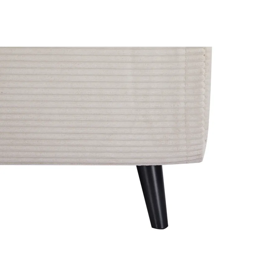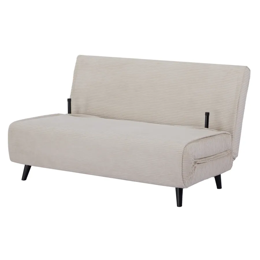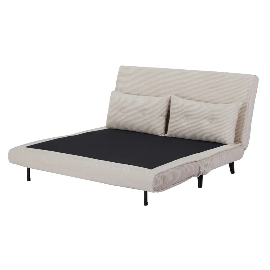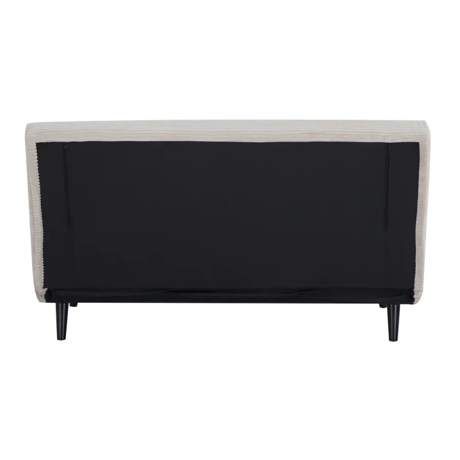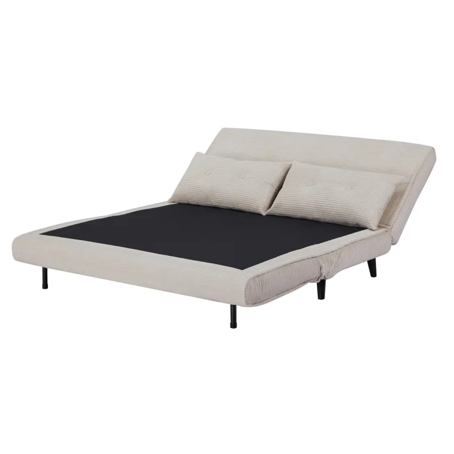 Duża sofa rozkładana SMART MULTIFUNCTION zachwyca czystym designem, wysoką funkcjonalnością i ponadczasowym stylem retro. Miękkie, sztruksowe obicie w stylowym beżu zapewnia wyjątkowo przyjemną i domową atmosferę. Dołączone dekoracyjne poduszki podkreślają przytulny charakter fotela i zapewniają dodatkowy komfort. Czarne, lakierowane nóżki z drewna sosnowego dodają wyrafinowanego charakteru i są wyposażone w praktyczne filcowe podkładki – idealne do delikatnych podłóg.