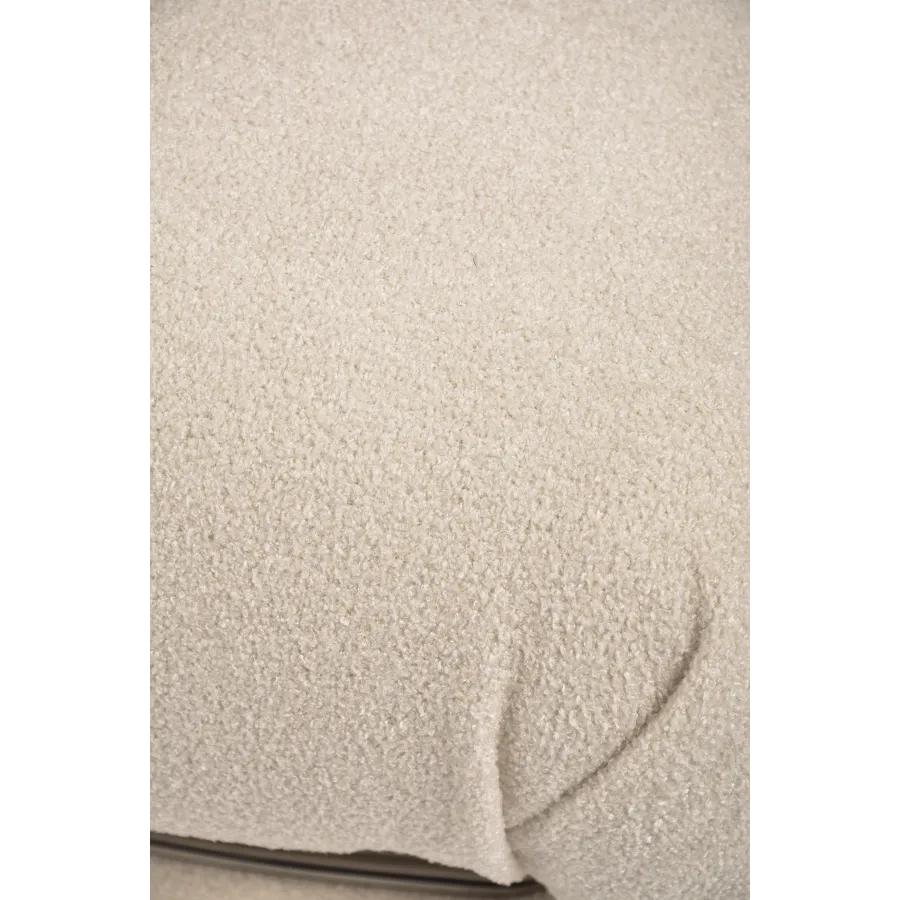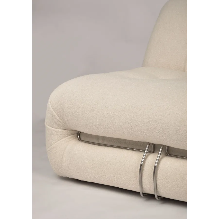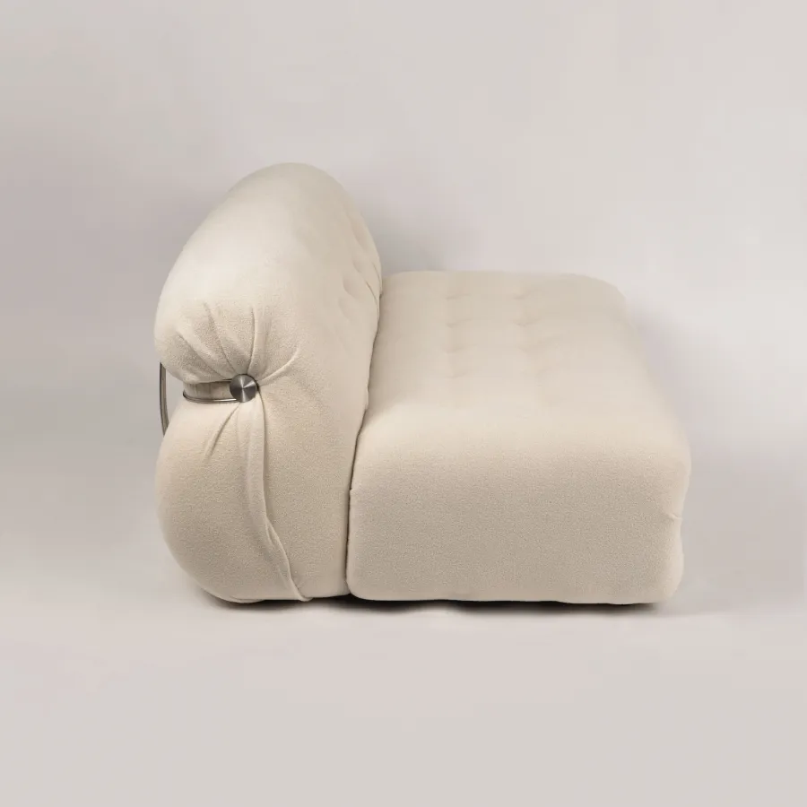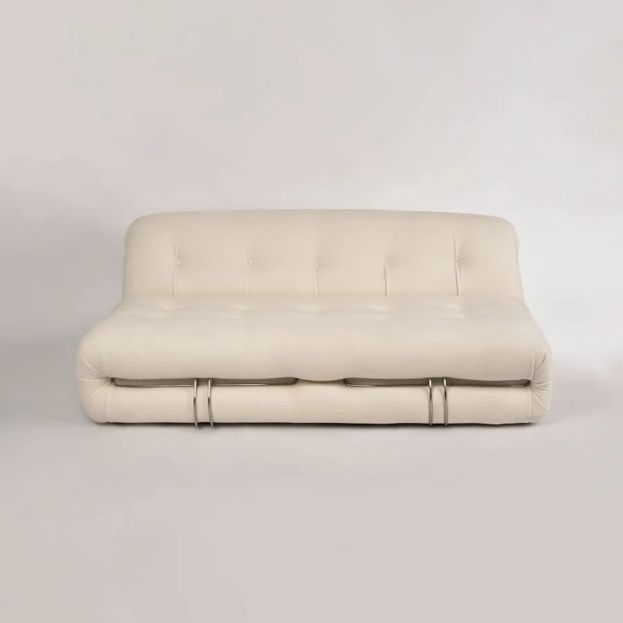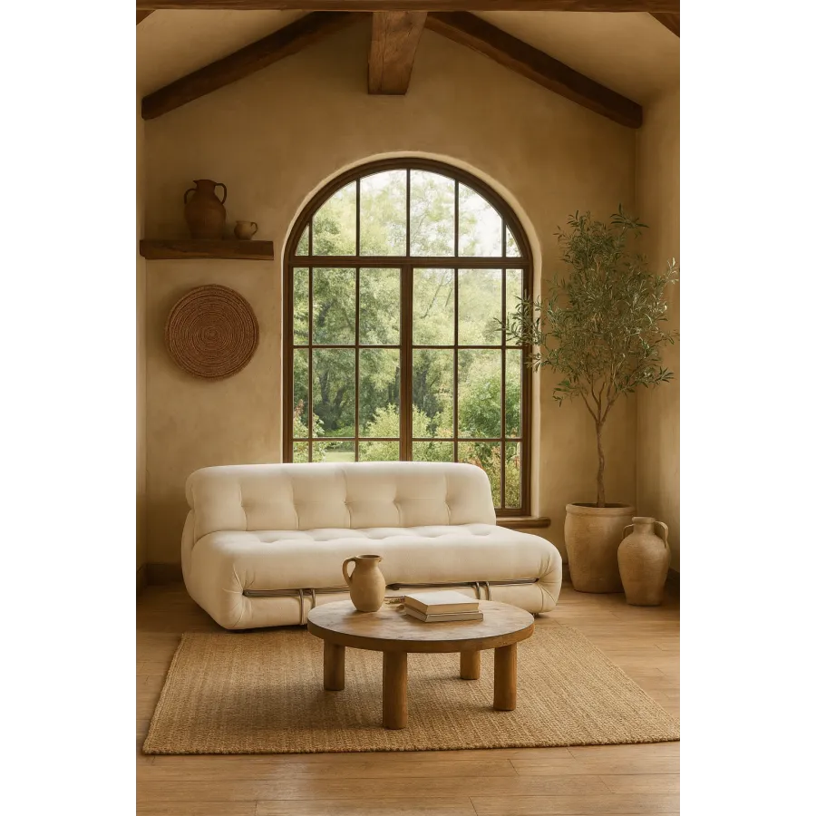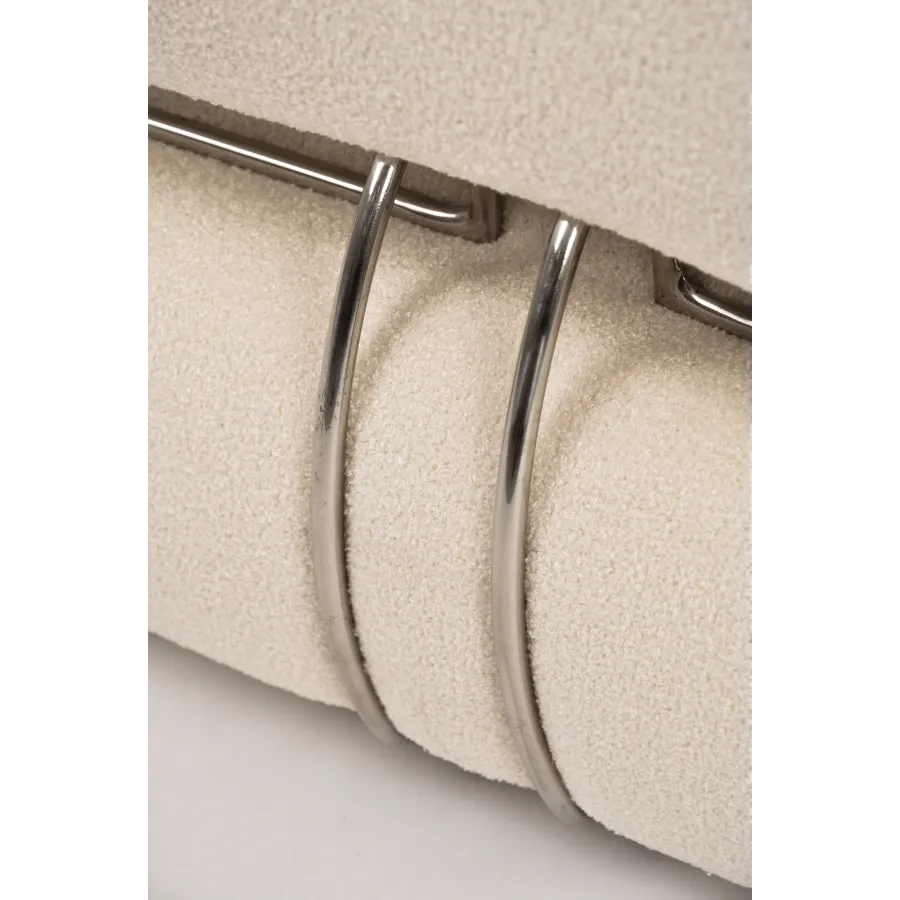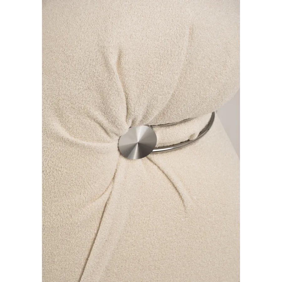 Praktyczna, trzyosobowa sofa rozkładana w stylu Mid-century w kolorze złamanej bieli. Niepowtarzalny design, elementy ze stali nierdzewnej i zastosowana modna tkanina boucle z pikowaniem guzikowym, tworzą harmonijną całość nadając wnętrzu elegancji.