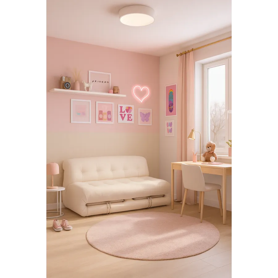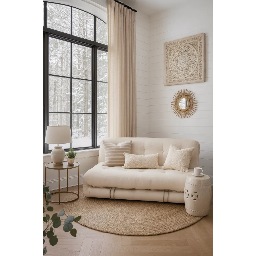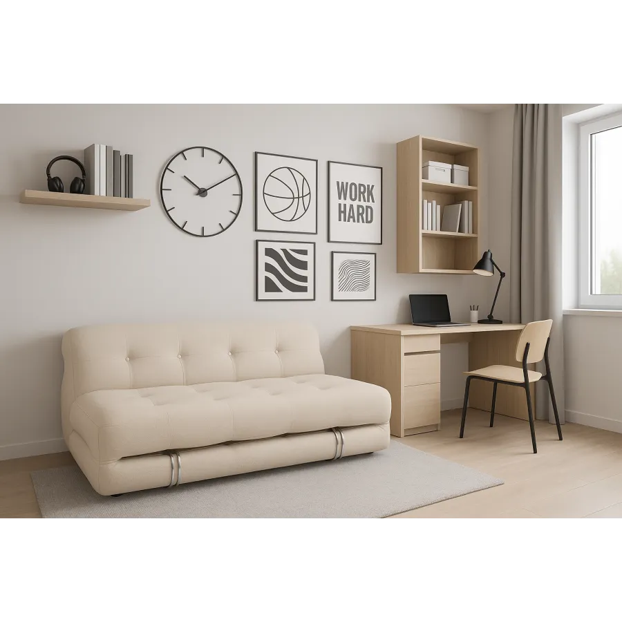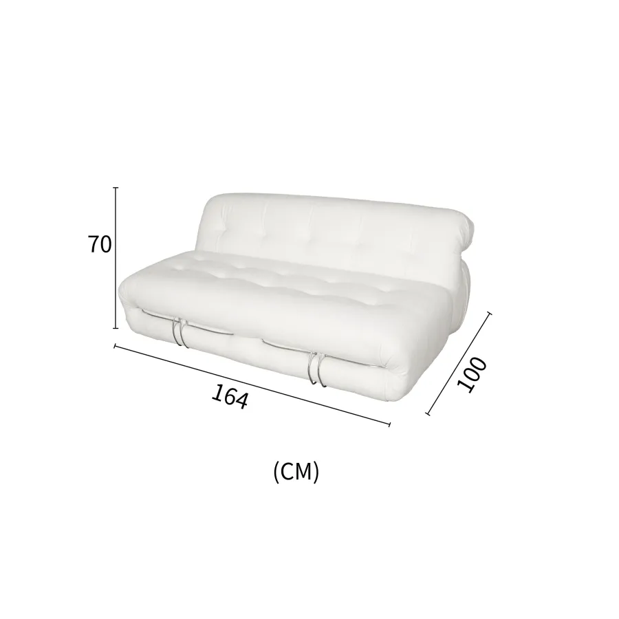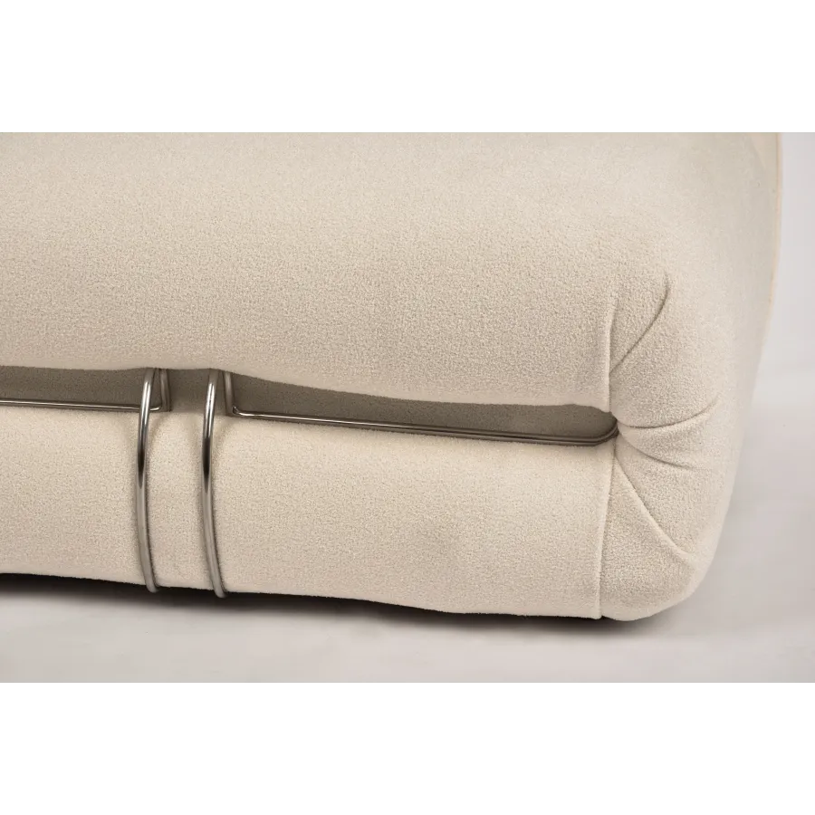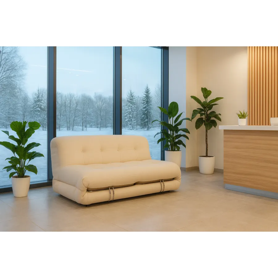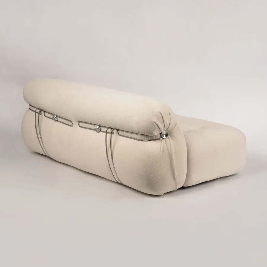 Praktyczna, trzyosobowa sofa rozkładana w stylu Mid-century w kolorze złamanej bieli. Niepowtarzalny design, elementy ze stali nierdzewnej i zastosowana modna tkanina boucle z pikowaniem guzikowym, tworzą harmonijną całość nadając wnętrzu elegancji.
