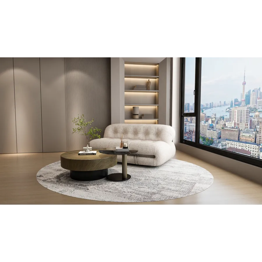 Tkanina boucle, drewniana rama, stelaż ze stali nierdzewnej
