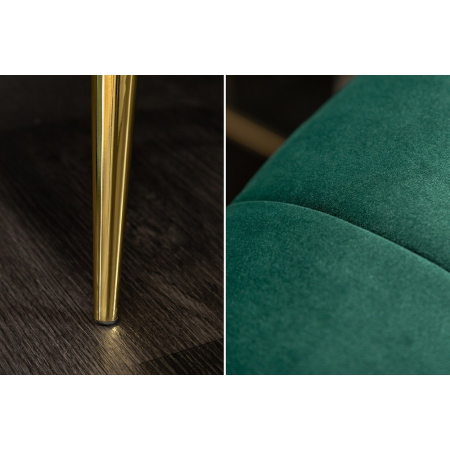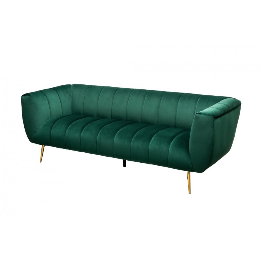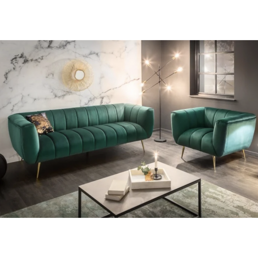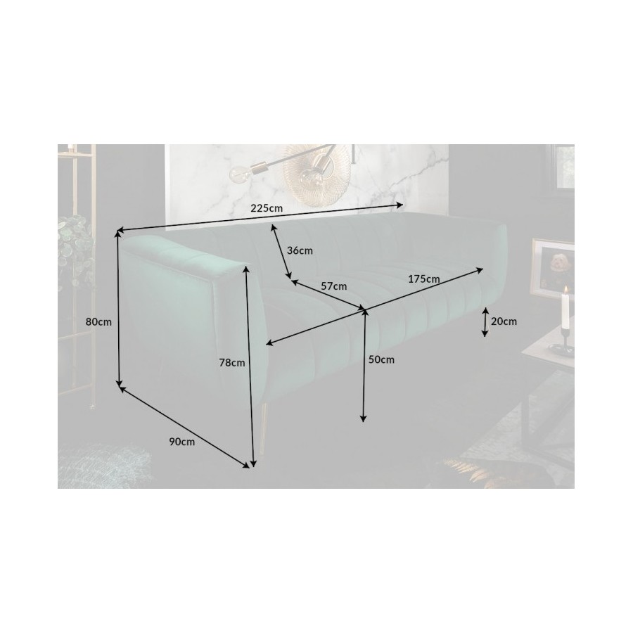 Tył sofy wypoczynkowej jest również pokryty aksamitem, dzięki czemu można ją umieścić w dowolnym miejscu pokoju jako atrakcyjny element przyciągający wzrok lub oddzielający pokój. Uzupełnij sofę stolikami bocznymi, lampami lub lustrem ściennym z czarną metalową ramą, aby uzyskać harmonijny ogólny obraz
