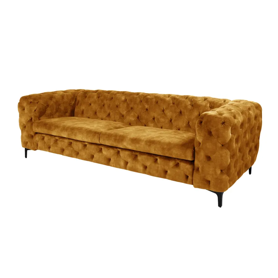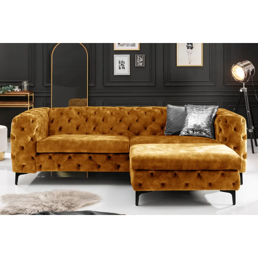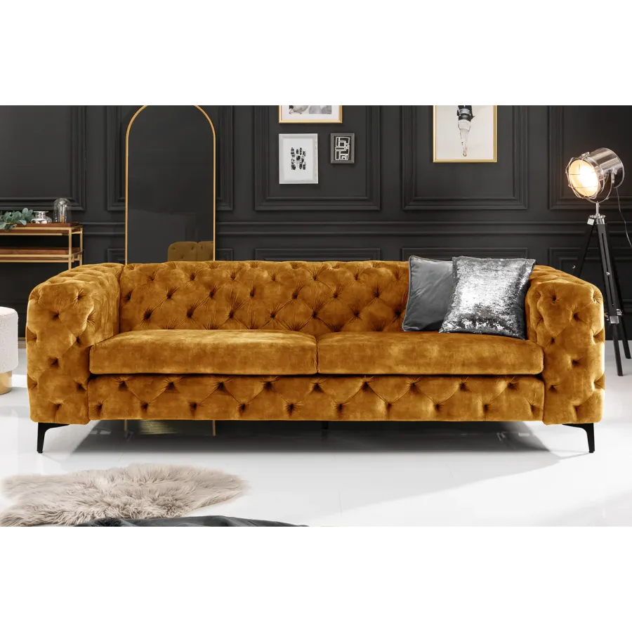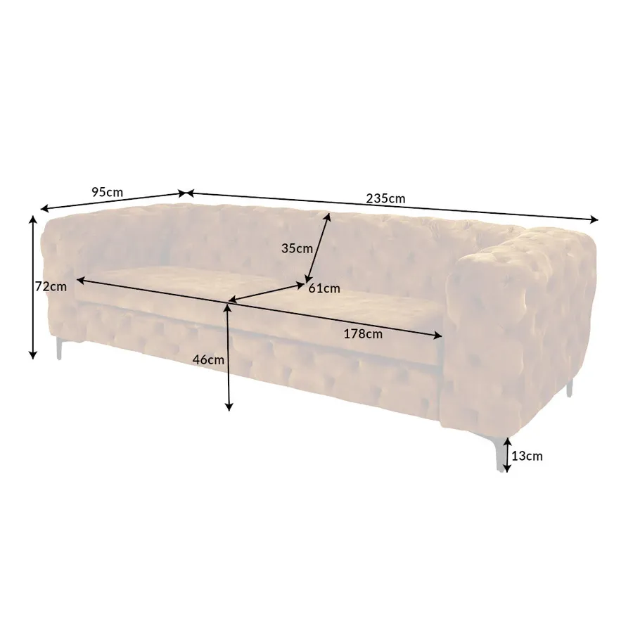Pikowana powierzchnia oparcia i podłokietników nawiązuje do eleganckiego wzoru Chesterfield z Anglii. Gładkie, wysokiej jakości tapicerowane poduszki do siedzenia tworzą umiejętny kontrast i zachęcają do odpoczynku. Srebrne nóżki sofy dodają nowoczesnego uroku projektowi i gwarantują stabilne oparcie na każdej powierzchni. Pomimo przyciągającego wzrok designu, kanapę można z łatwością łączyć z wieloma różnymi meblami i materiałami. Co więcej, sofa doskonale sprawdza się nie tylko w salonie: wystawną sofę Chesterfield można również umieścić jako designerską atrakcję w strefie wejściowej lub w gabinecie.